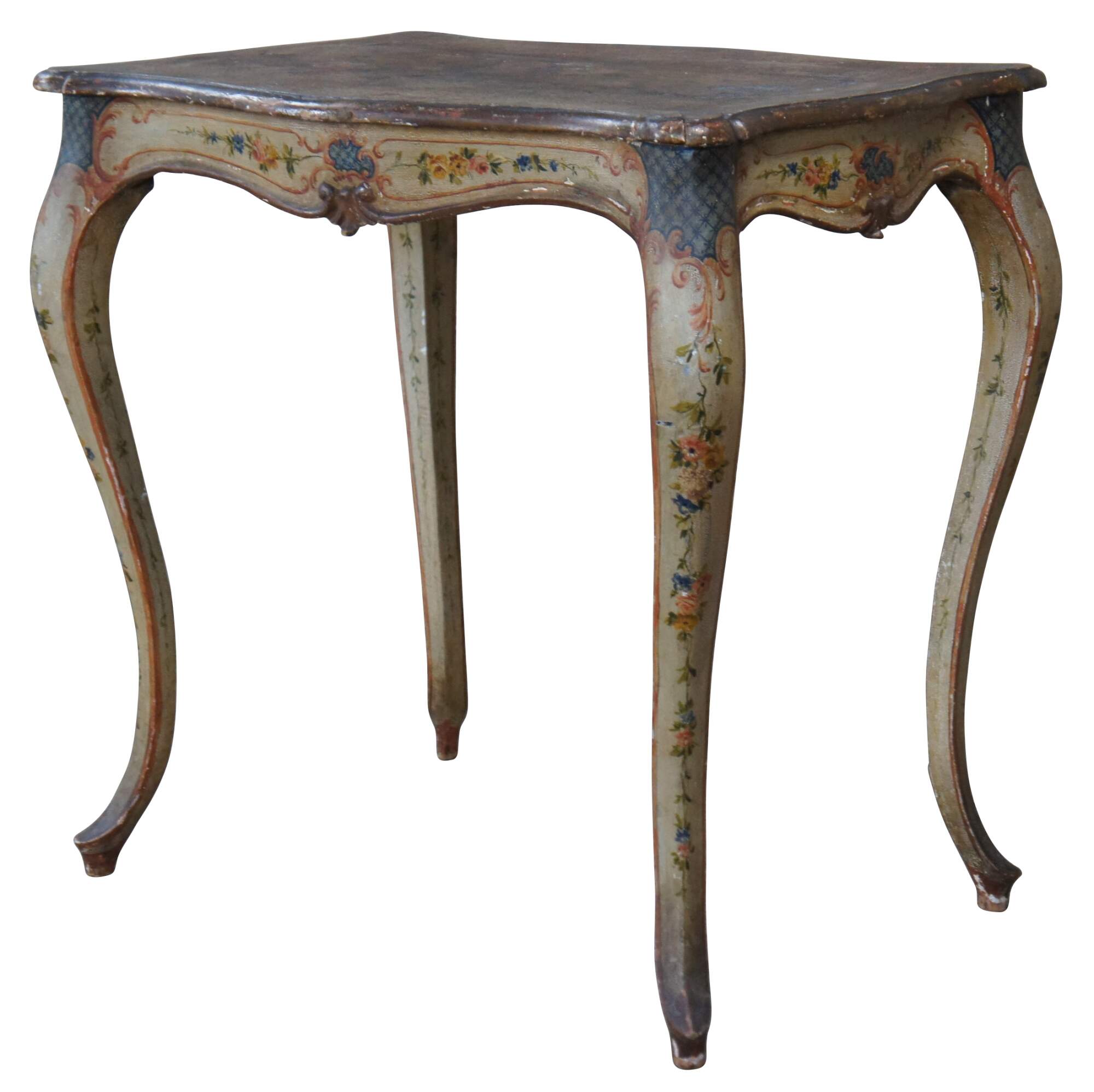 An antique French parlor table. Made from oak with a serpentine turtle top and polychrome finish. The table is supported by long cabriole legs. Features a colorful floral painted finish