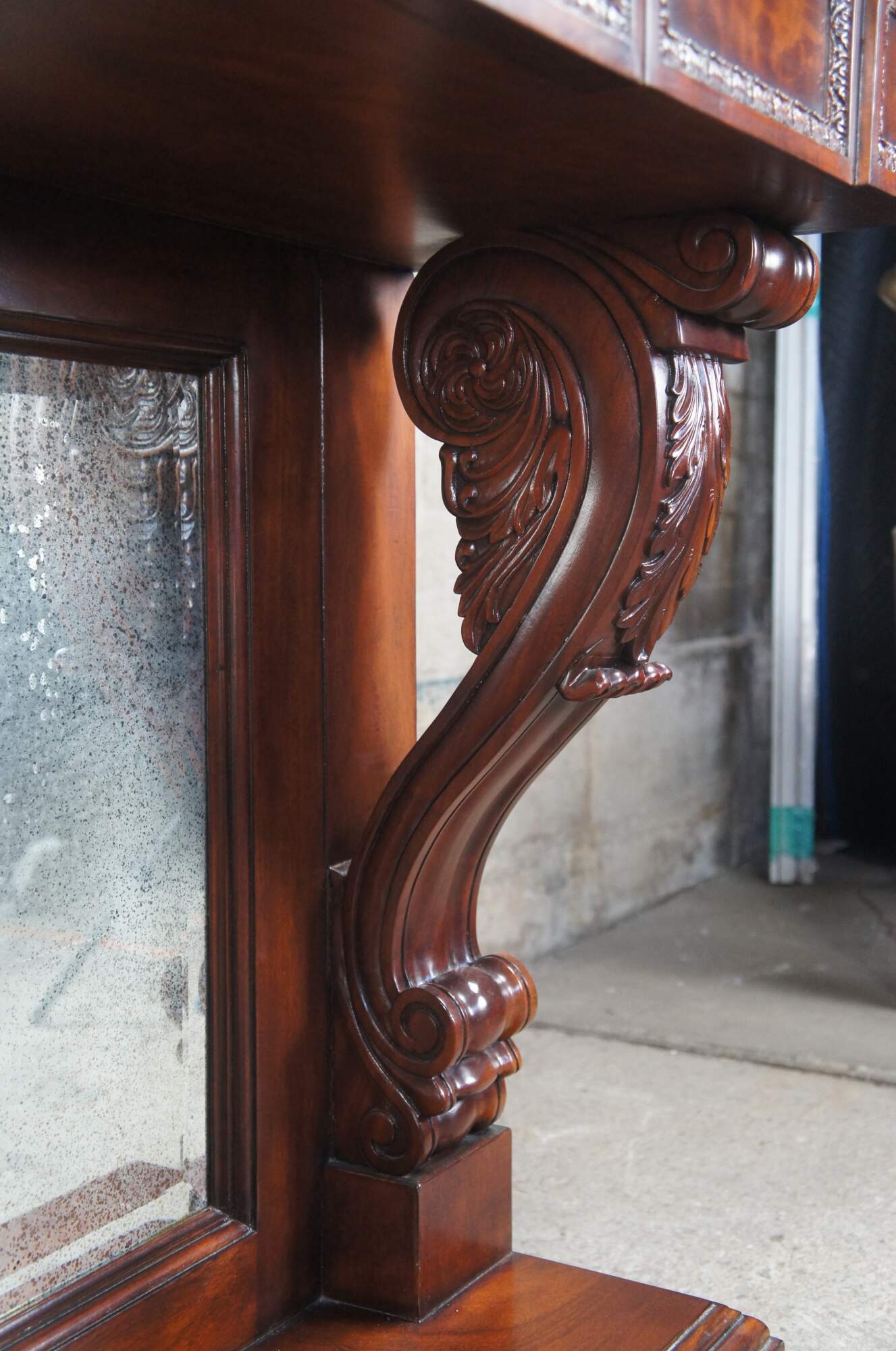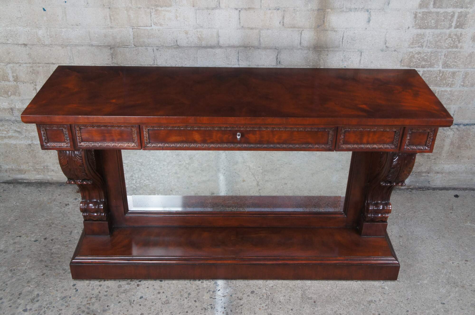 A stately English Regency mirrored pier table by Ralph Lauren, circa 1990s. The rectangular frame is made from a warm brown mahogany with matchbook burled panels. A pronounced top is supported by thick acanthus-scrolled corbels over a plinth base. The central mirror has an antiqued finish and one inch bevel. Includes foliate carved panels and a faux escuthceon with key for the drawer pull.