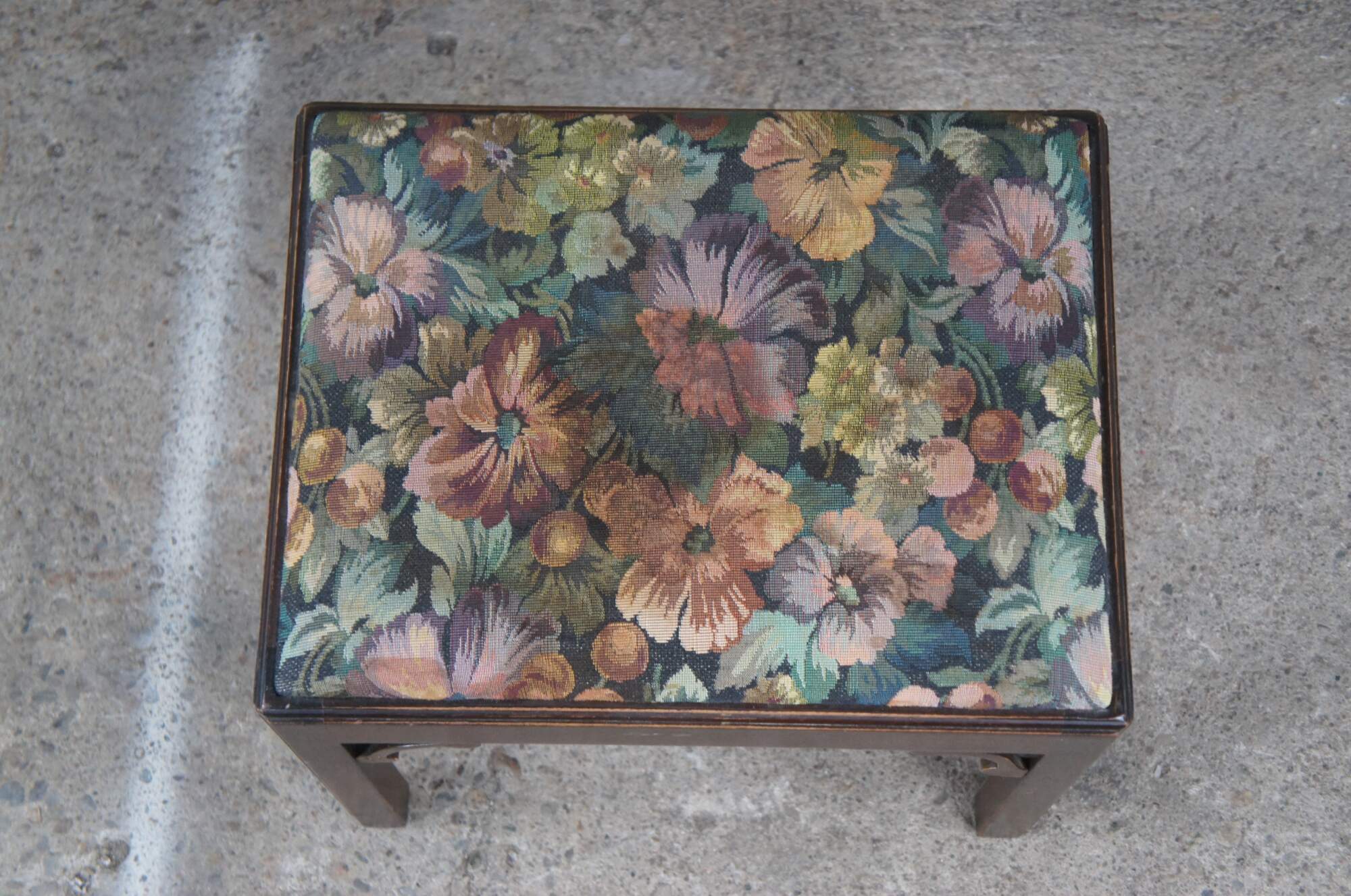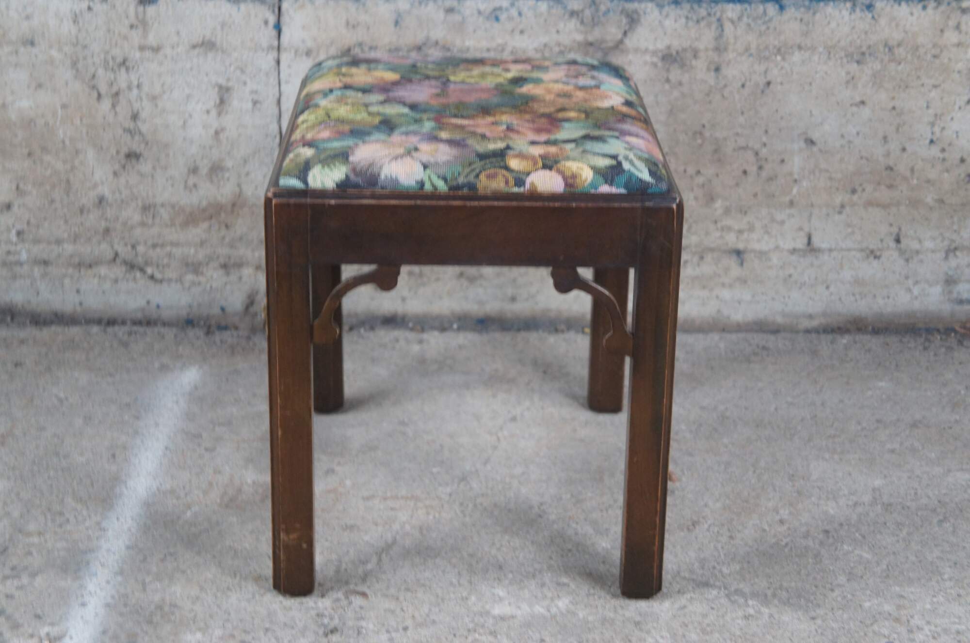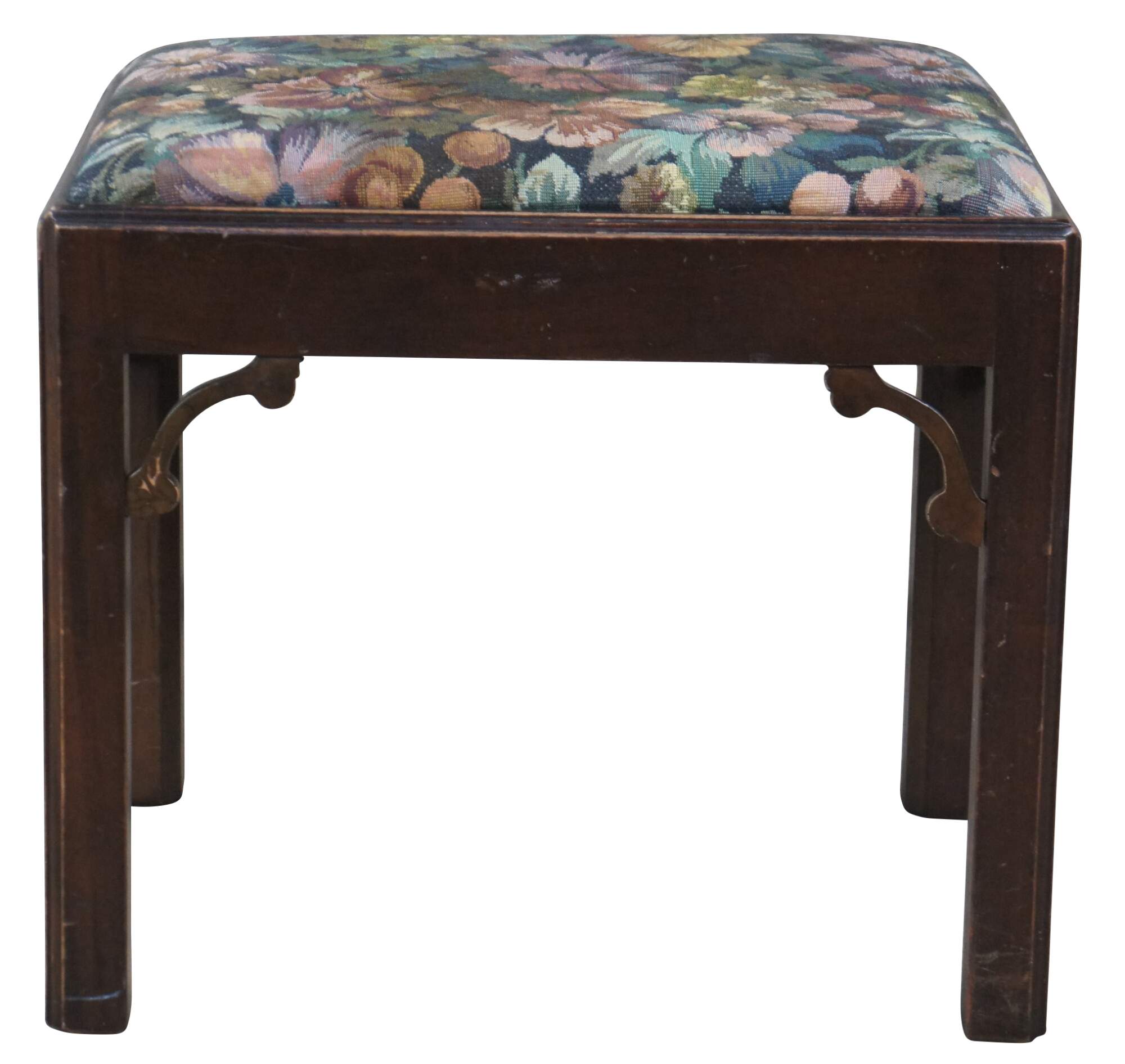 Antique foot stool, piano bench or vanity seat. Made of mahogany featuring rectangular form with Chinese Chippendale styling and floral upholstery.