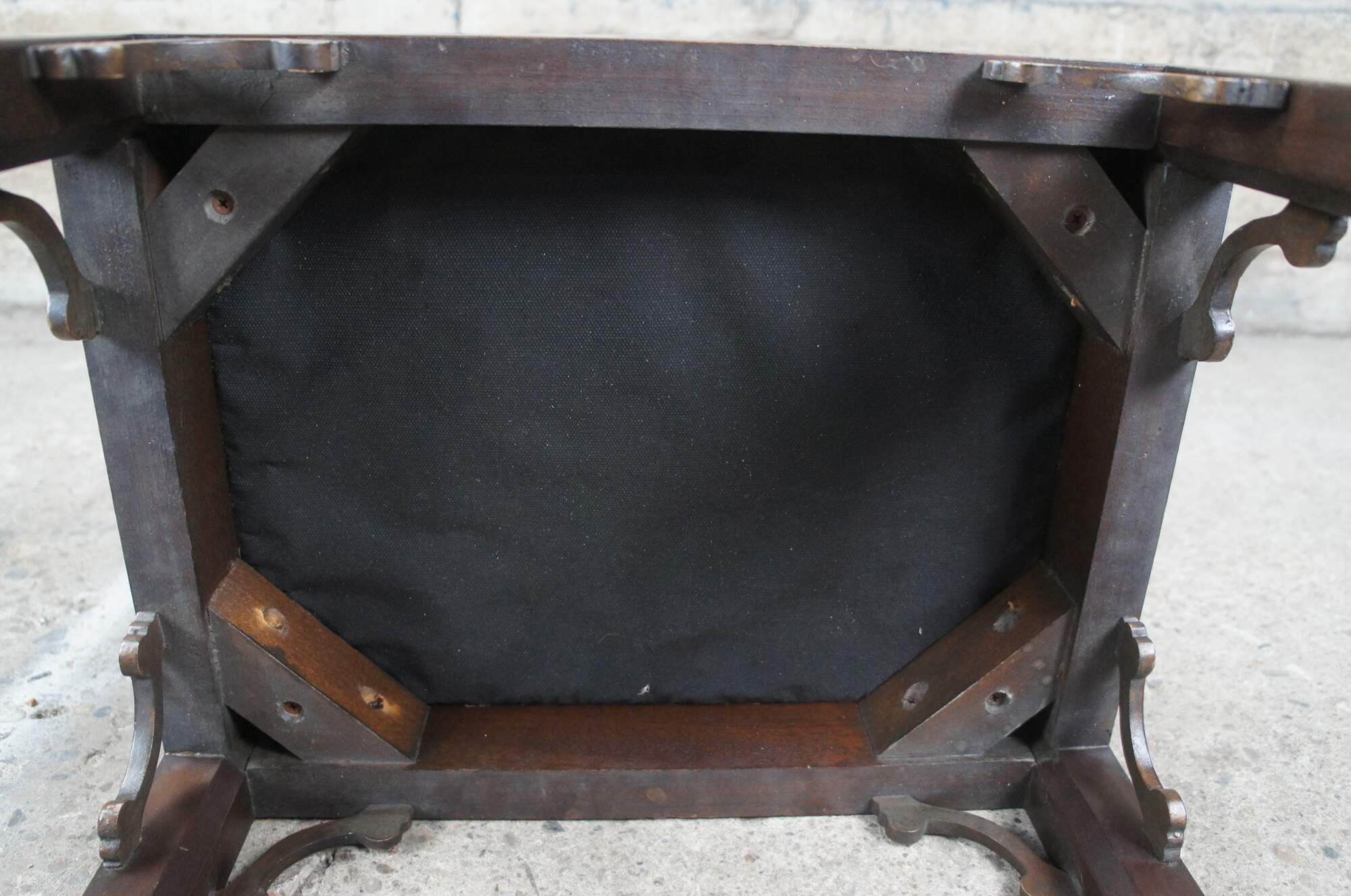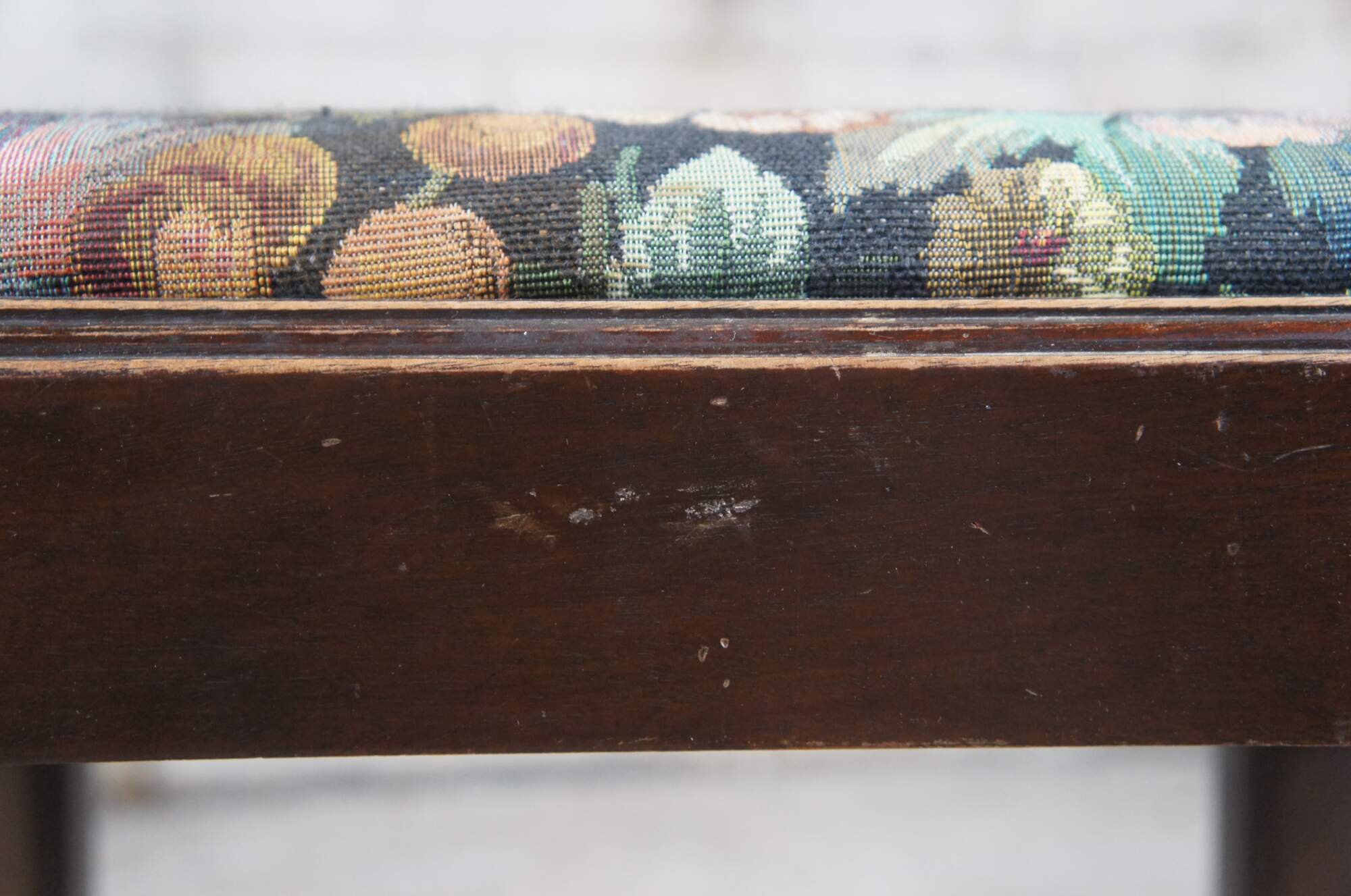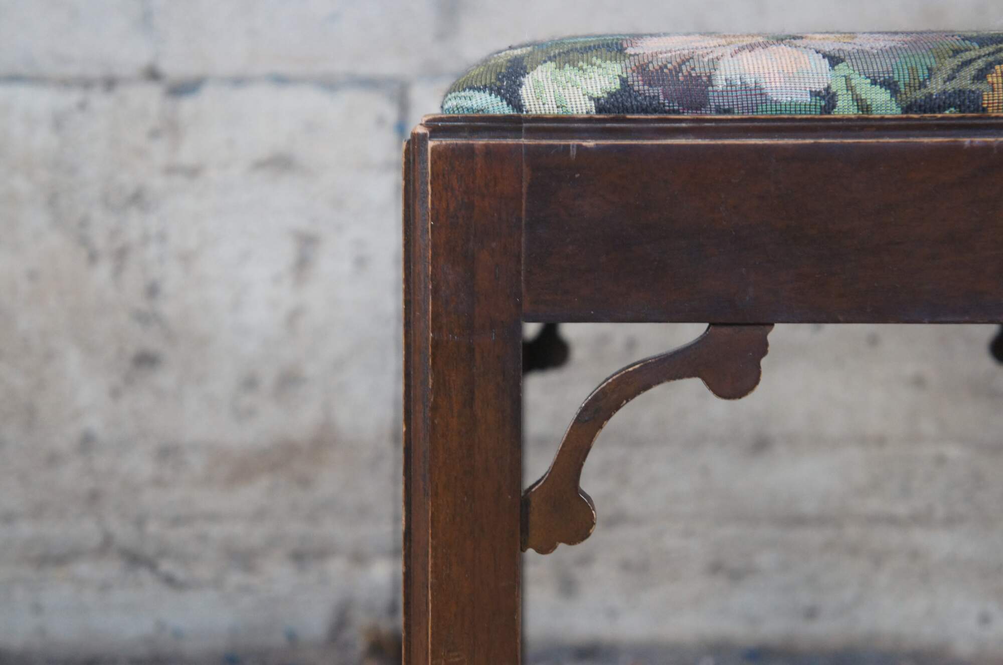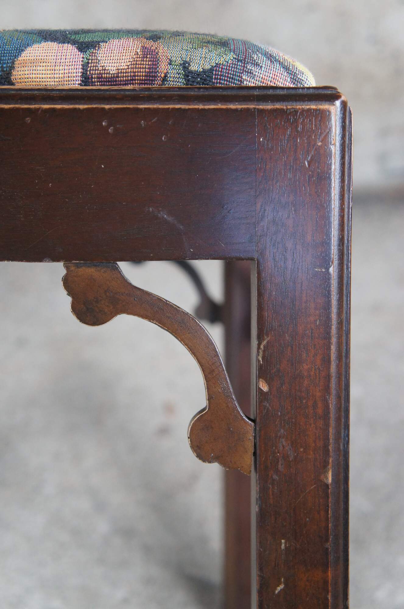 Antique foot stool, piano bench or vanity seat. Made of mahogany featuring rectangular form with Chinese Chippendale styling and floral upholstery.