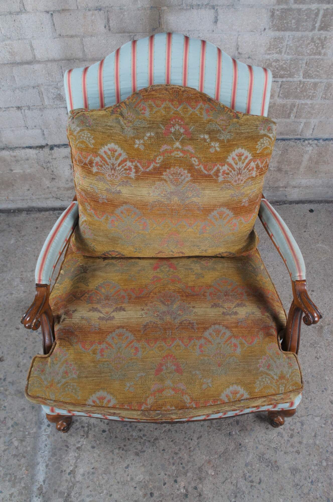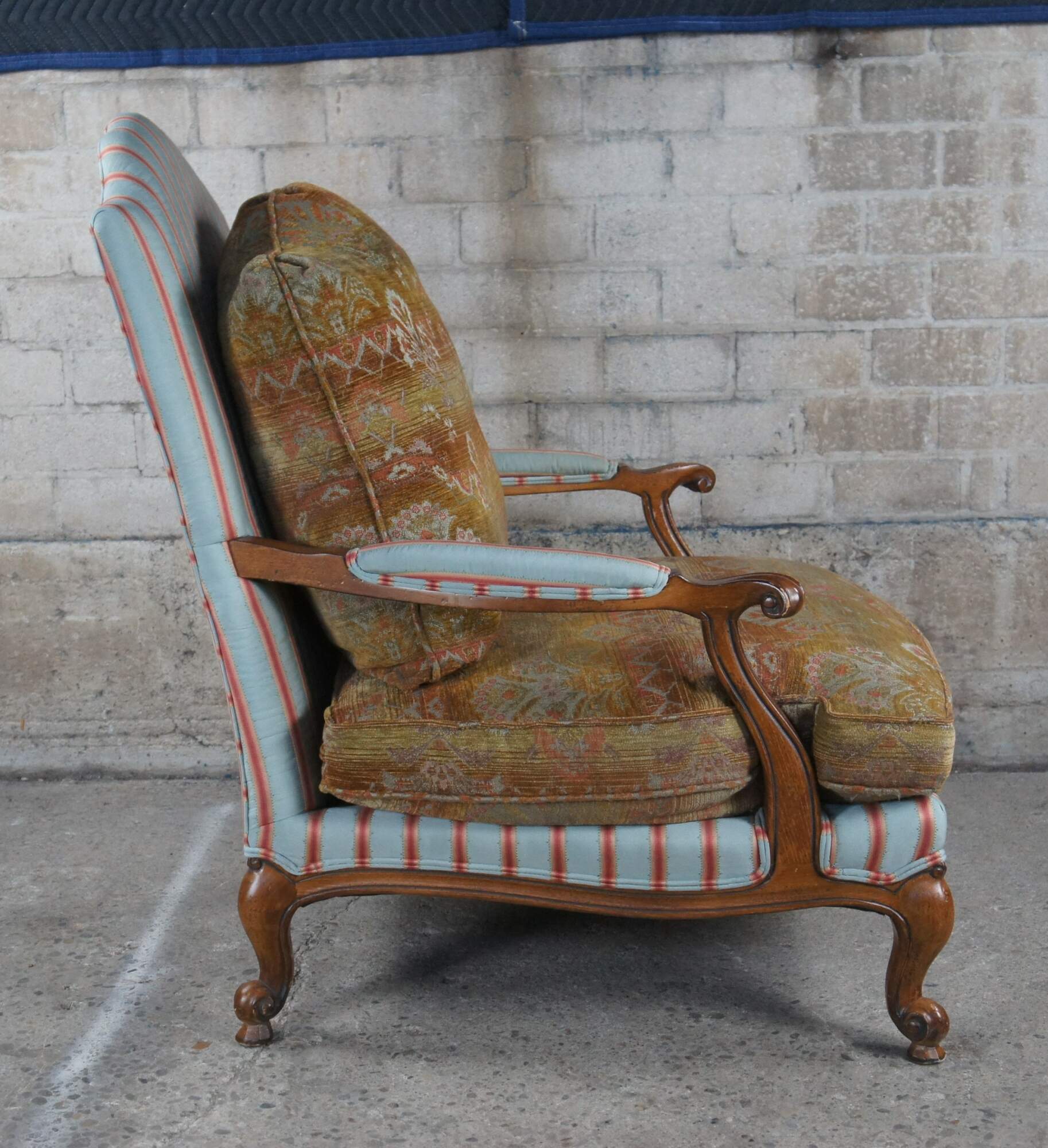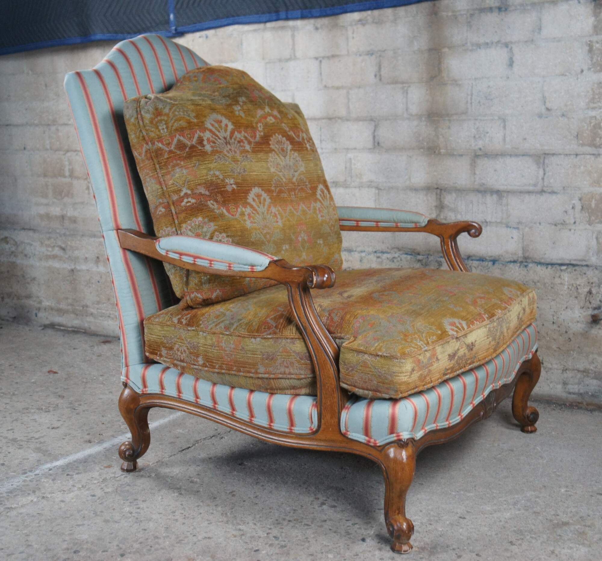 Vintage Wesley Hall oversized French Louis XV Bergere armchair. Features a serpentine oak frame with striped upholstery and southwestern cushions. The chair is supported by scrolled cabriole legs.