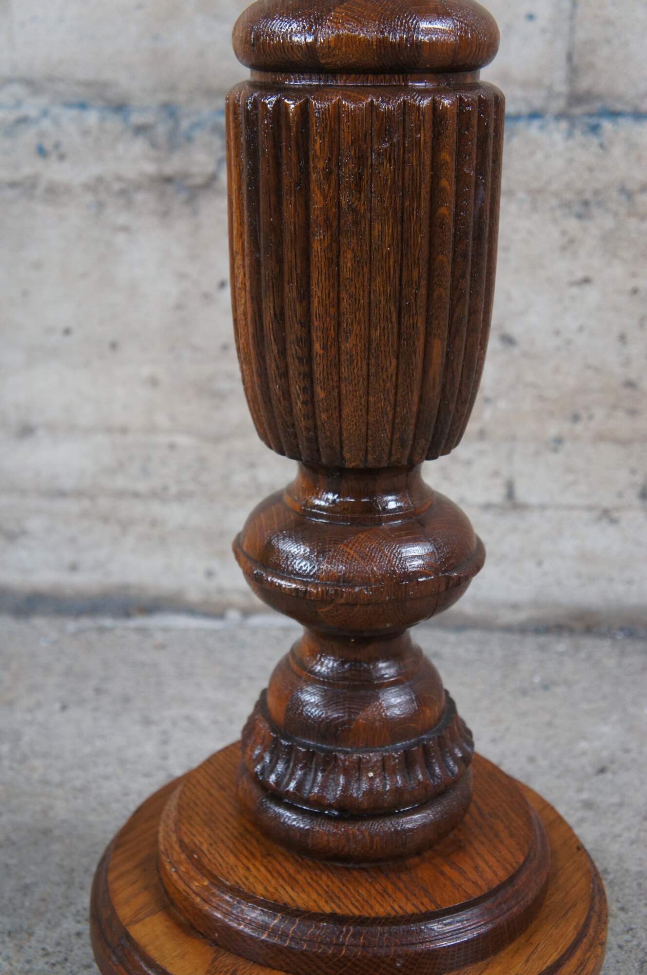 Victorian era oak pedestal, circa late 19th century. Features a beautifully turned column with reeded center over tiered and footed base. Great for display of plants and sculptures.