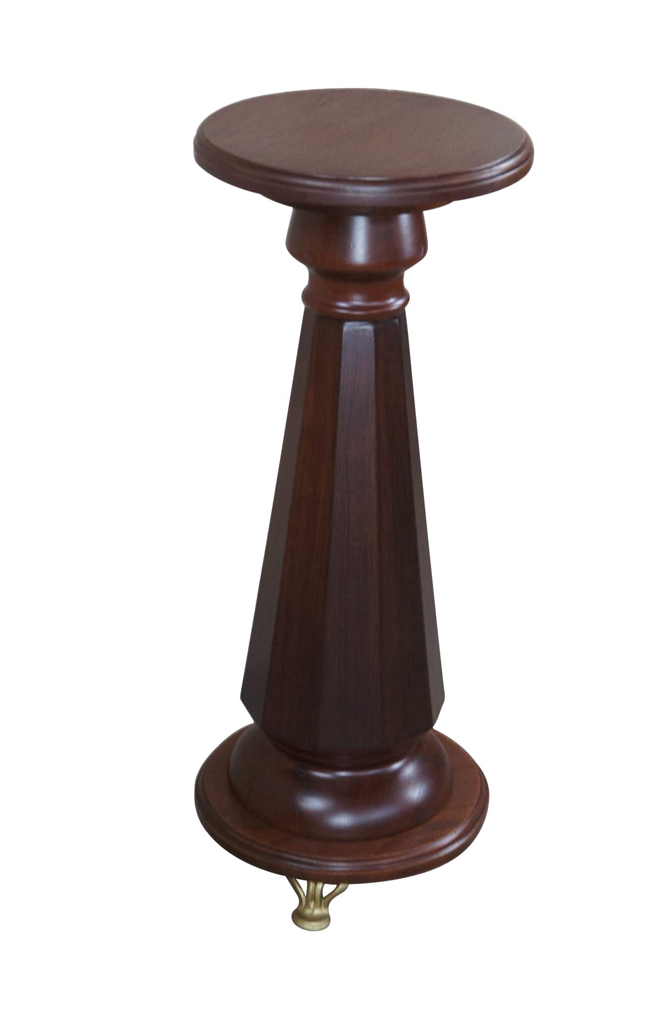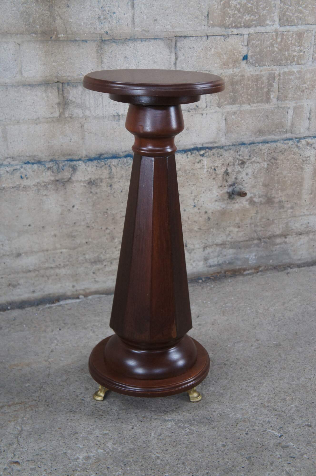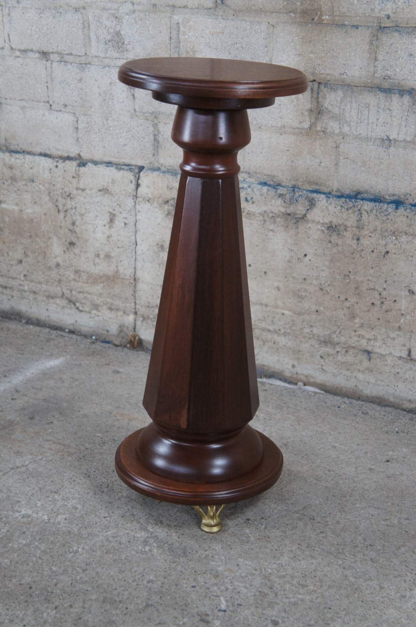An American Empire style sculpture pedestal or plant stand, circa last half 20th century. Features an rounded top over a faceted graduated column leading to a rounded brass footed base.