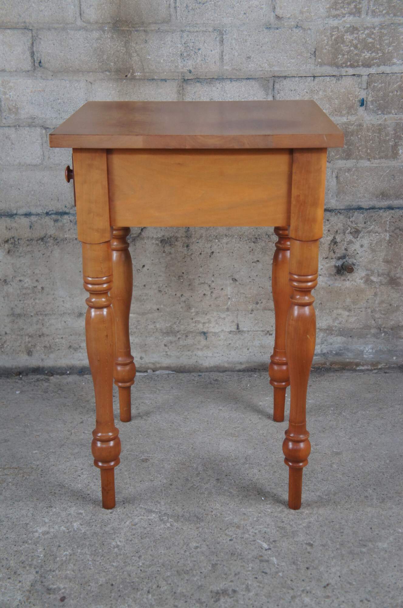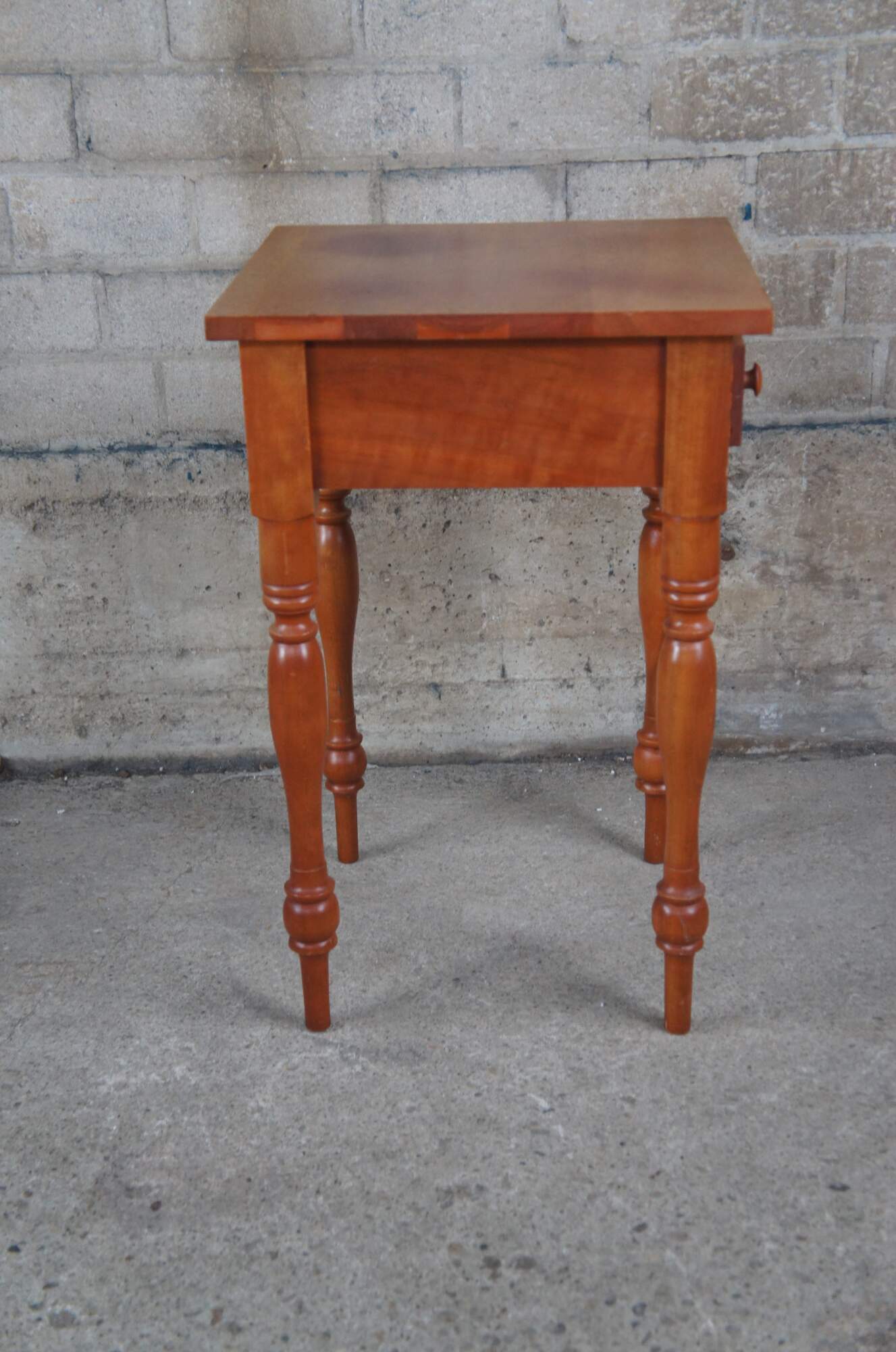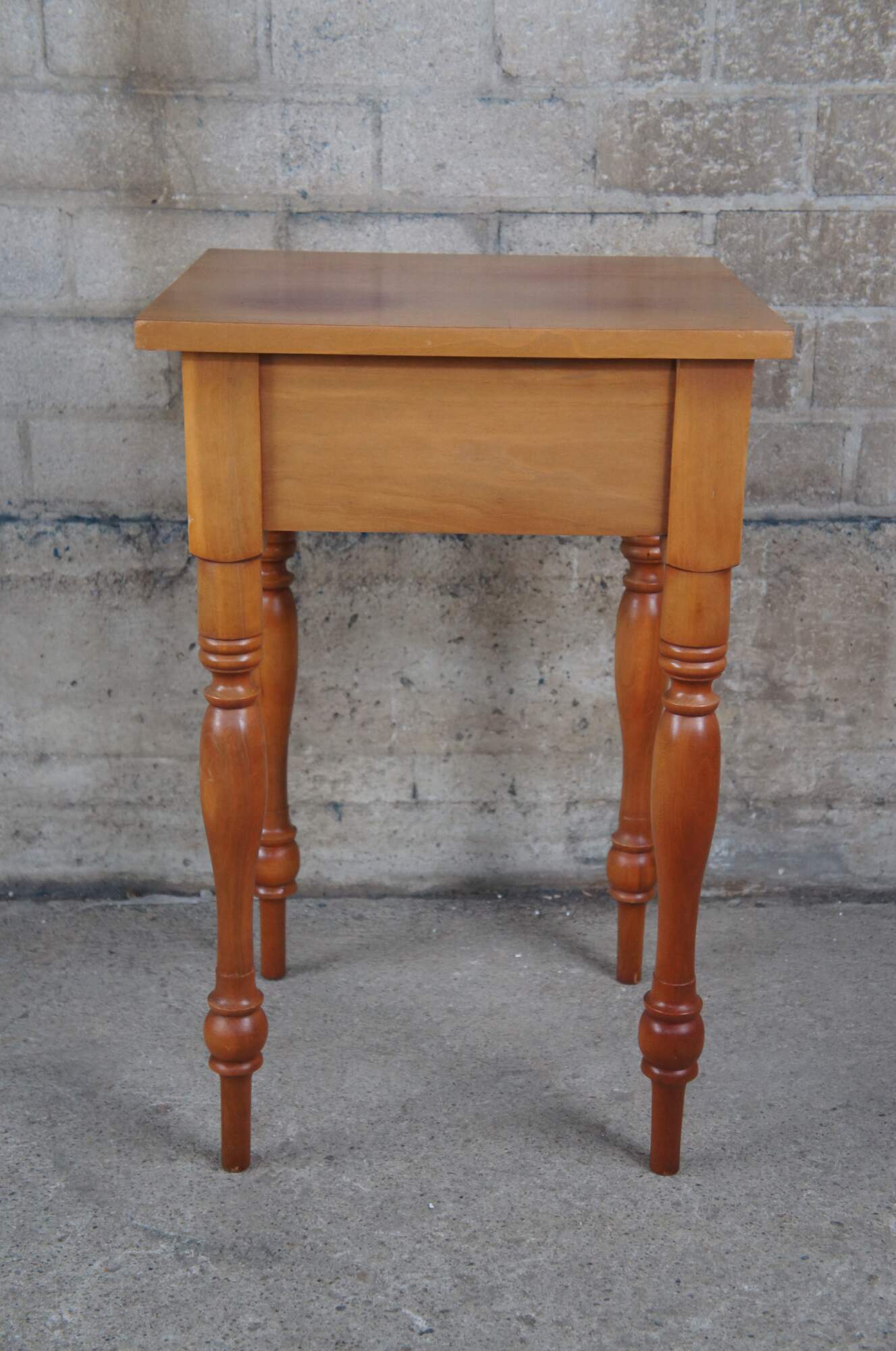 McMahan Furniture Co. Early American side table. Made of cherry featuring rectangular form with one dovetailed drawer and turned legs.