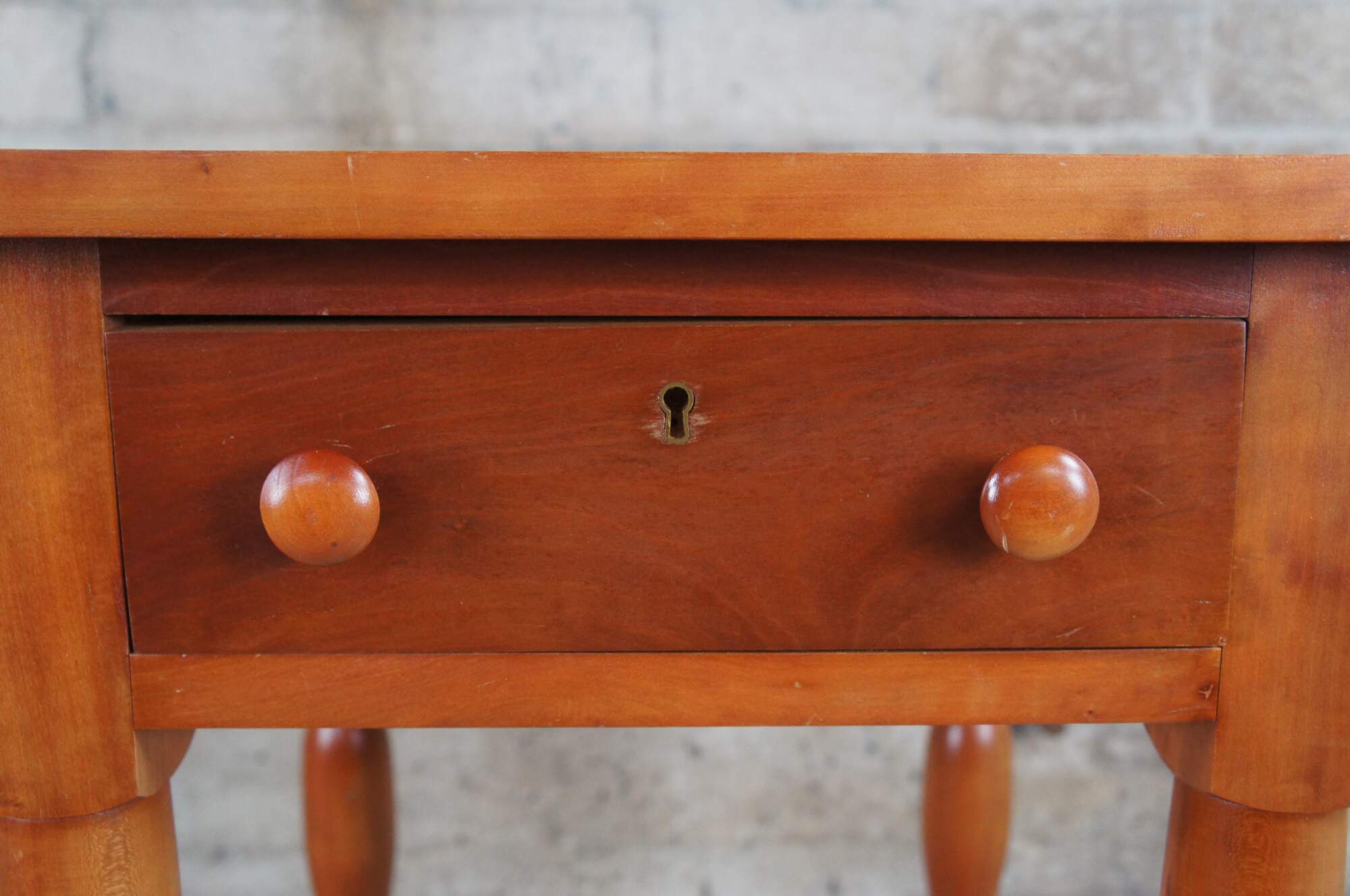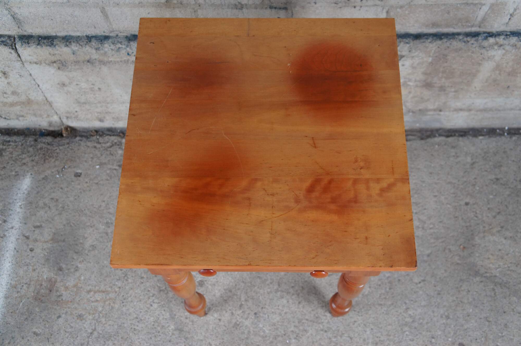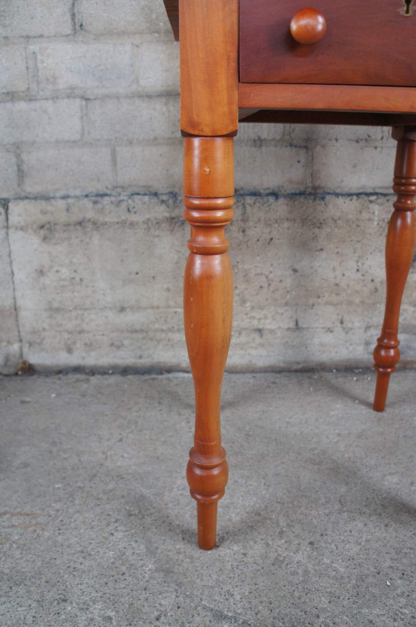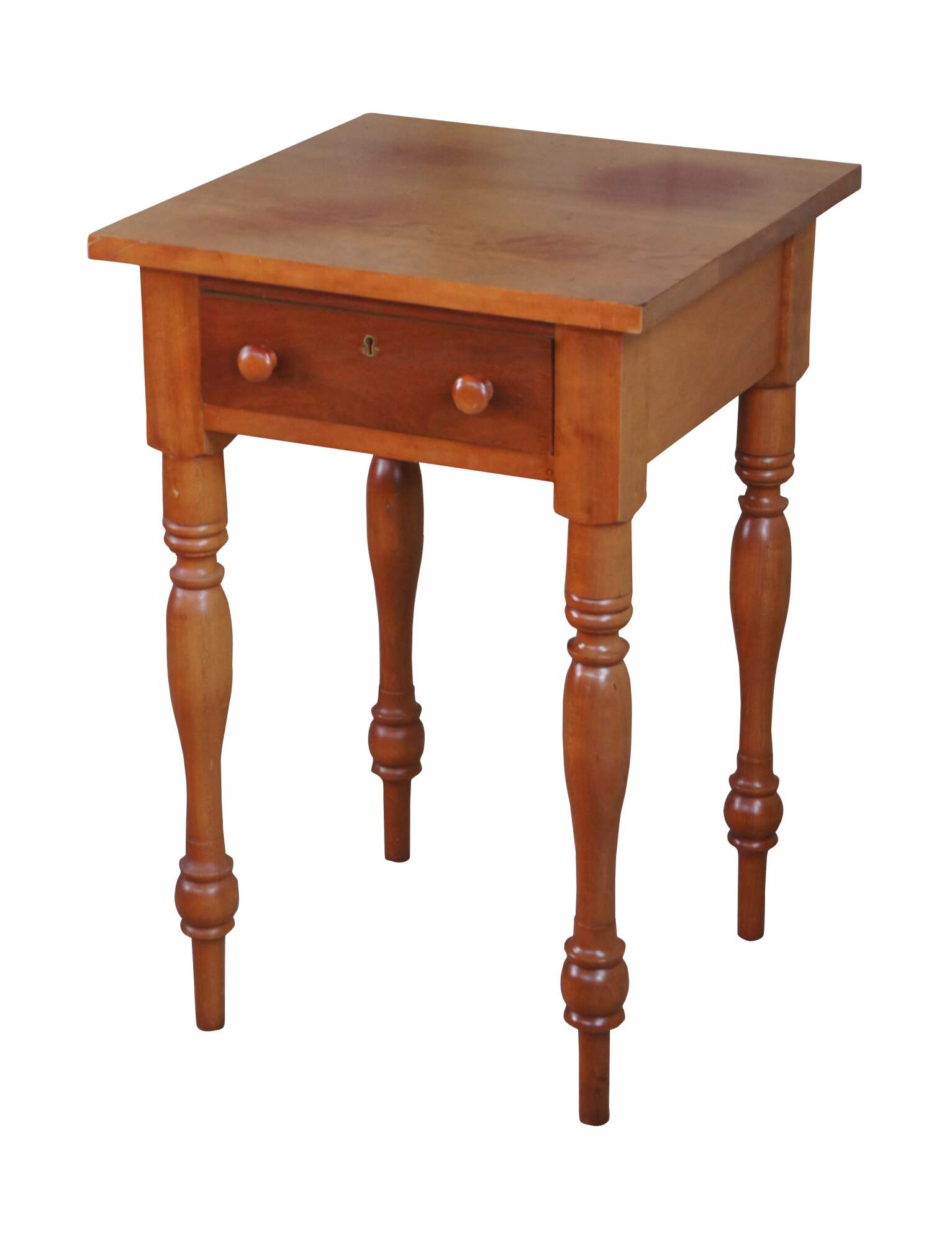 McMahan Furniture Co. Early American side table. Made of cherry featuring rectangular form with one dovetailed drawer and turned legs.