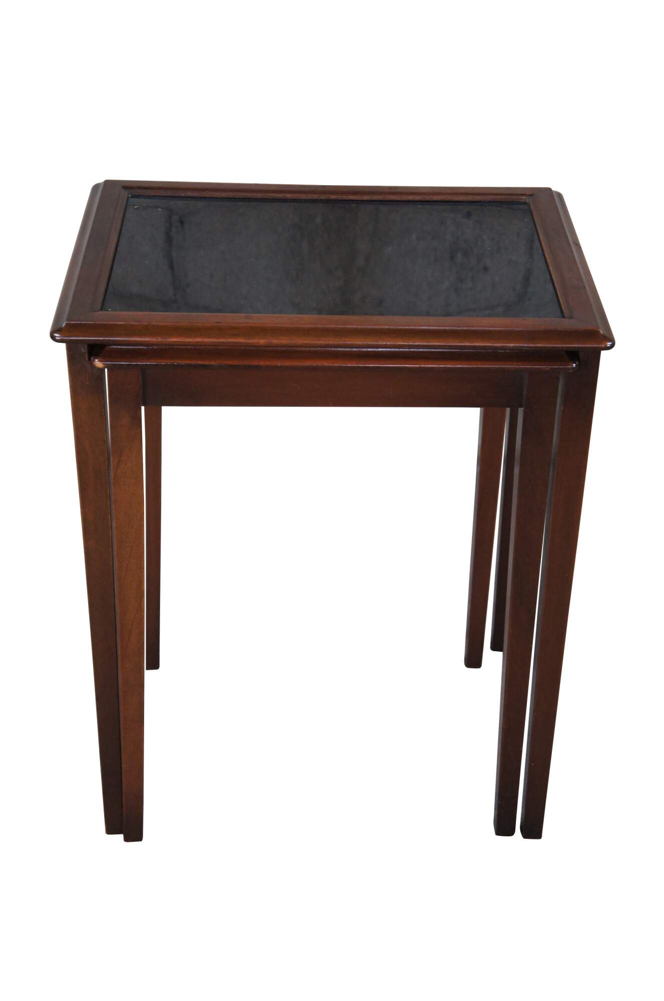 Pair of mid century nesting table by Ferguson Brothers. Features a rectangular form made from mahogany with black inset tops. The tops appear to be laminant or plastic and stain resistant.