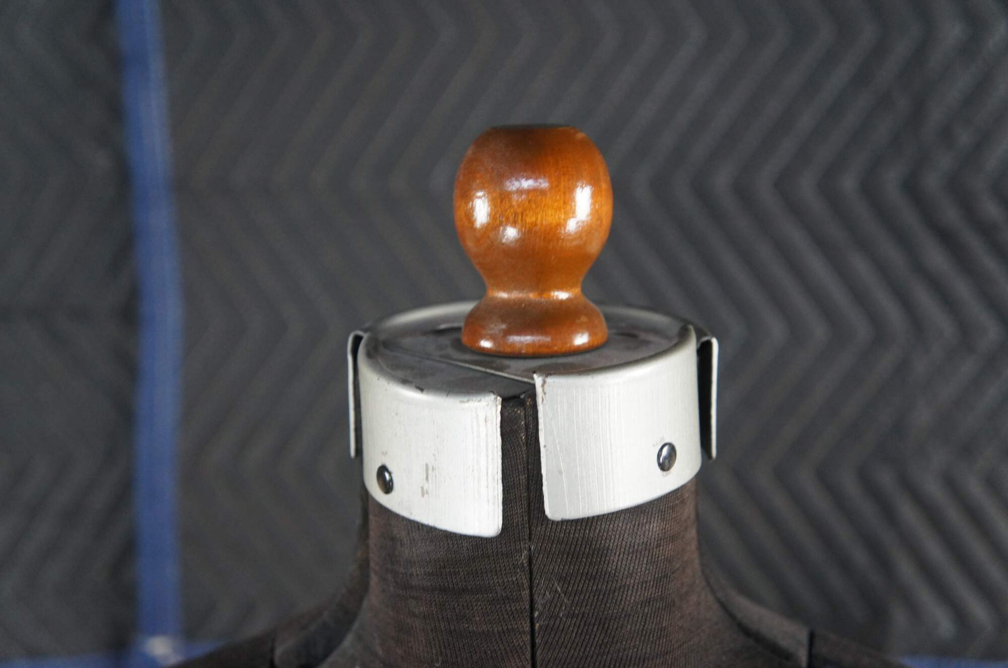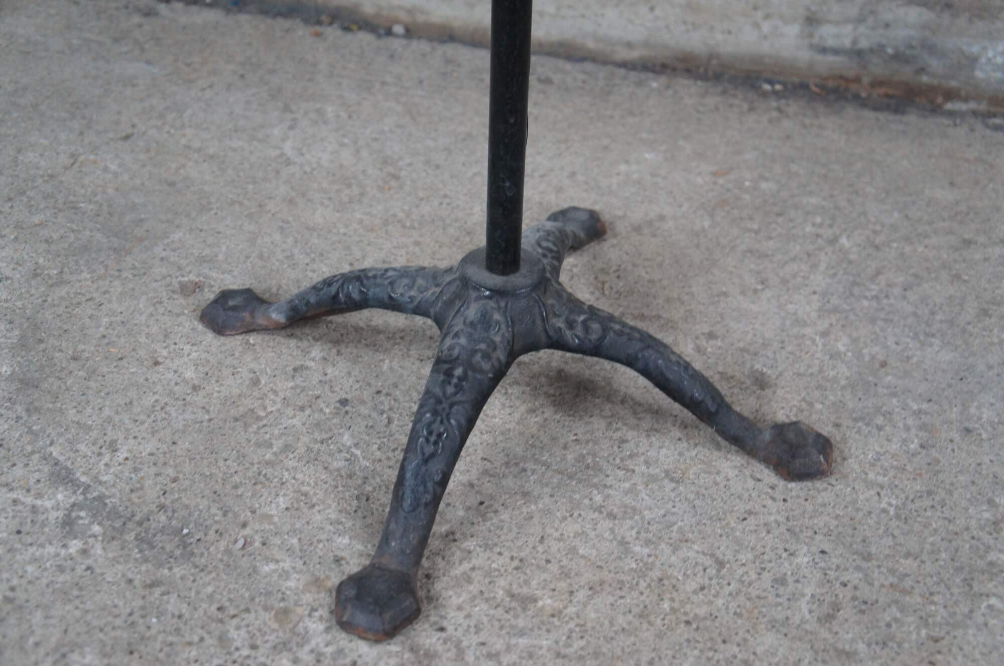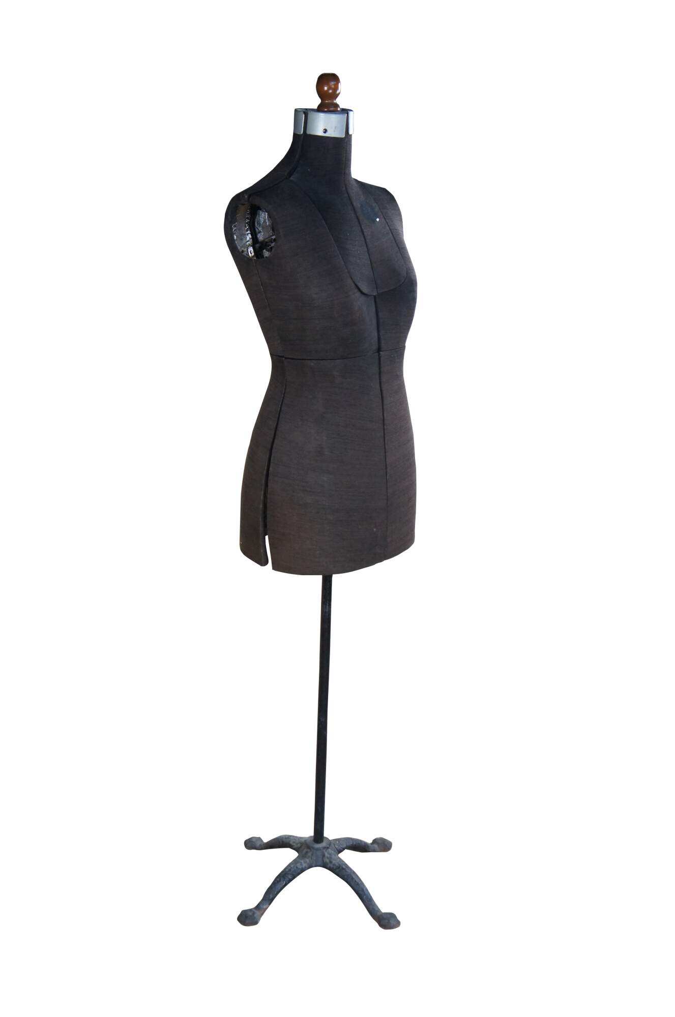 A fully adjustable dress form by White. Features an ornate cast iron base. The original tag for white has fallen off. It's outline can be seen on the breast plate