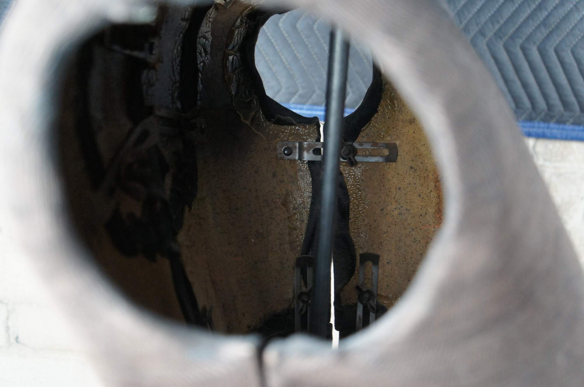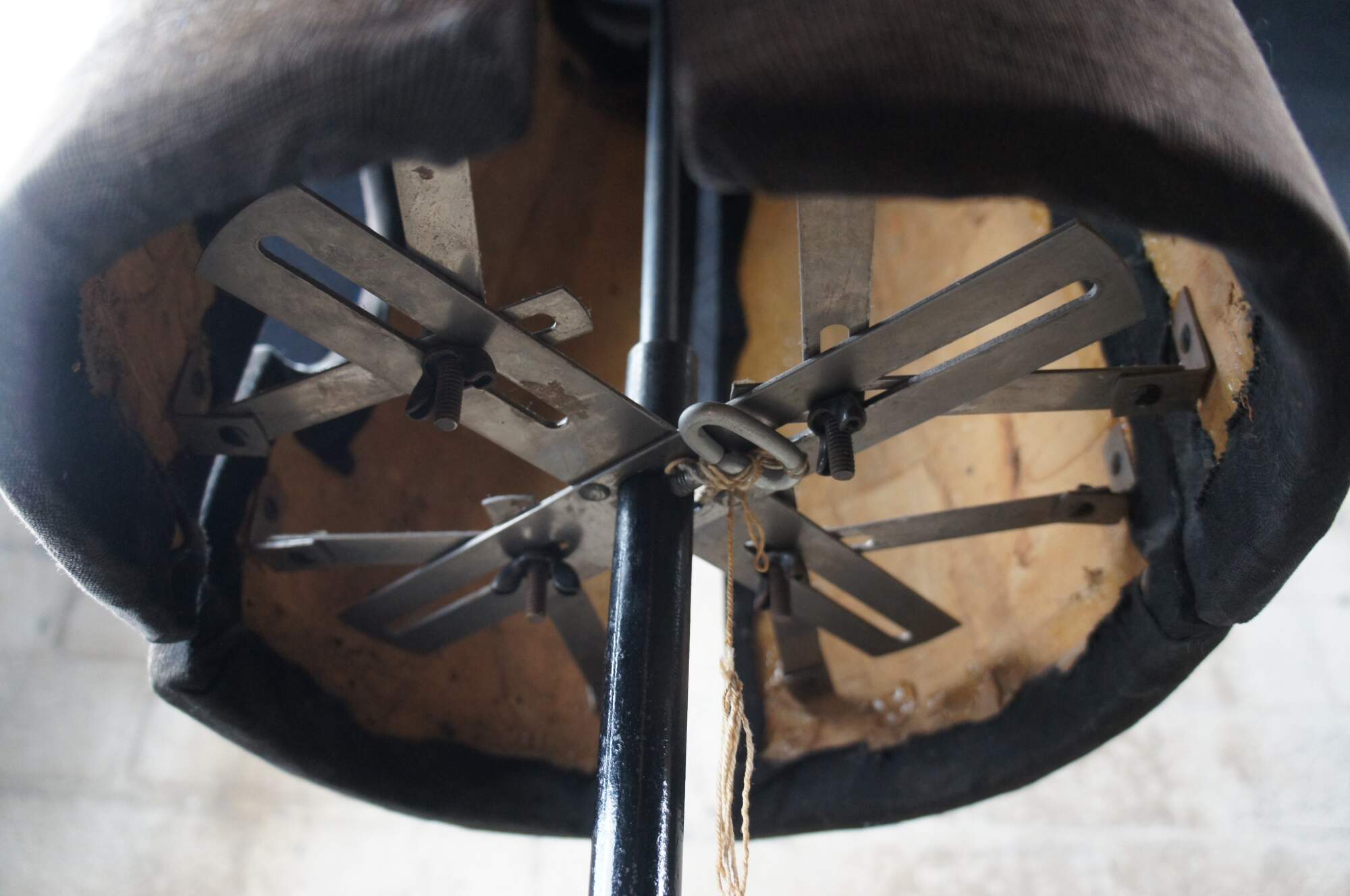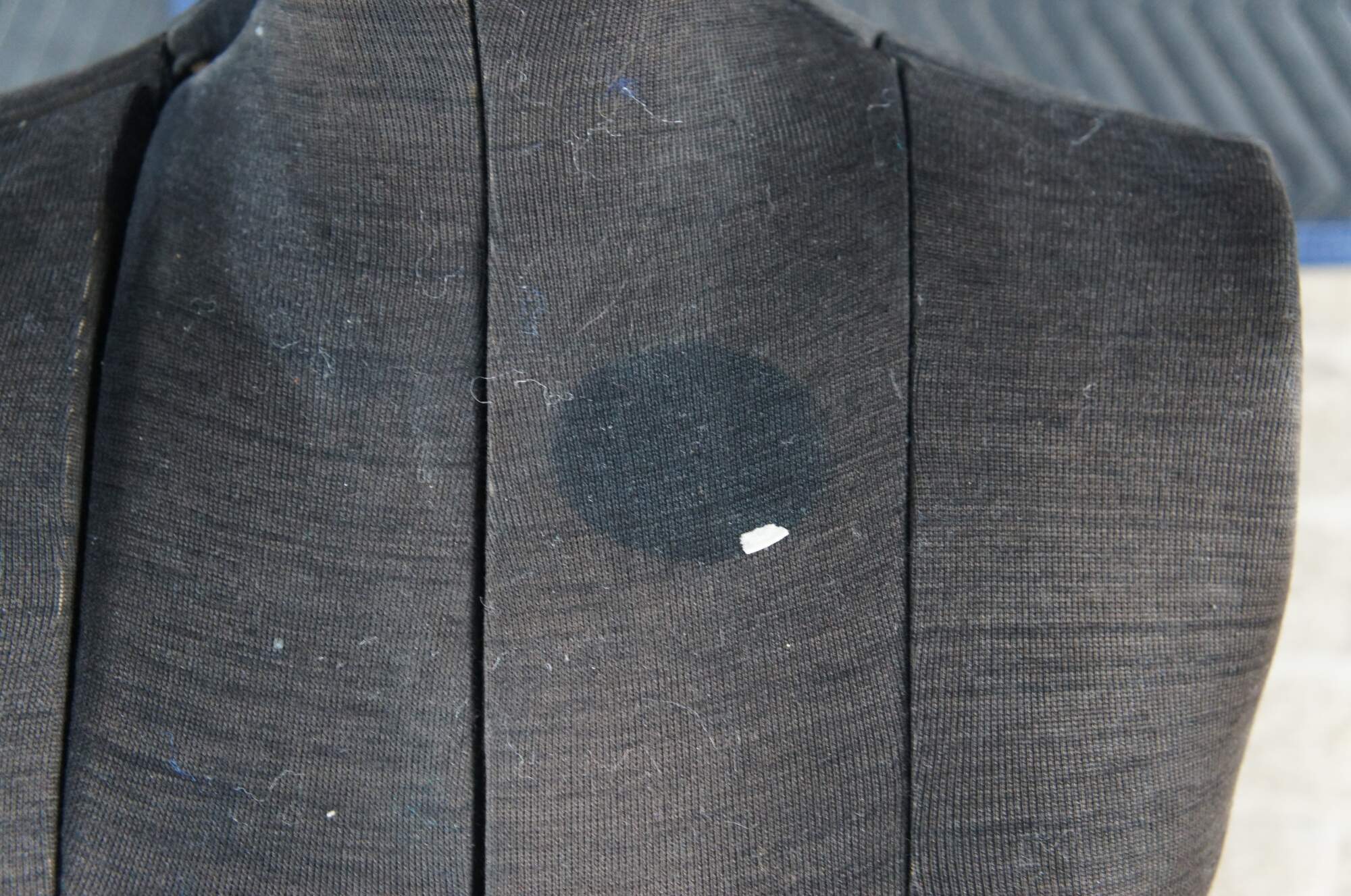 A fully adjustable dress form by White. Features an ornate cast iron base. The original tag for white has fallen off. It's outline can be seen on the breast plate