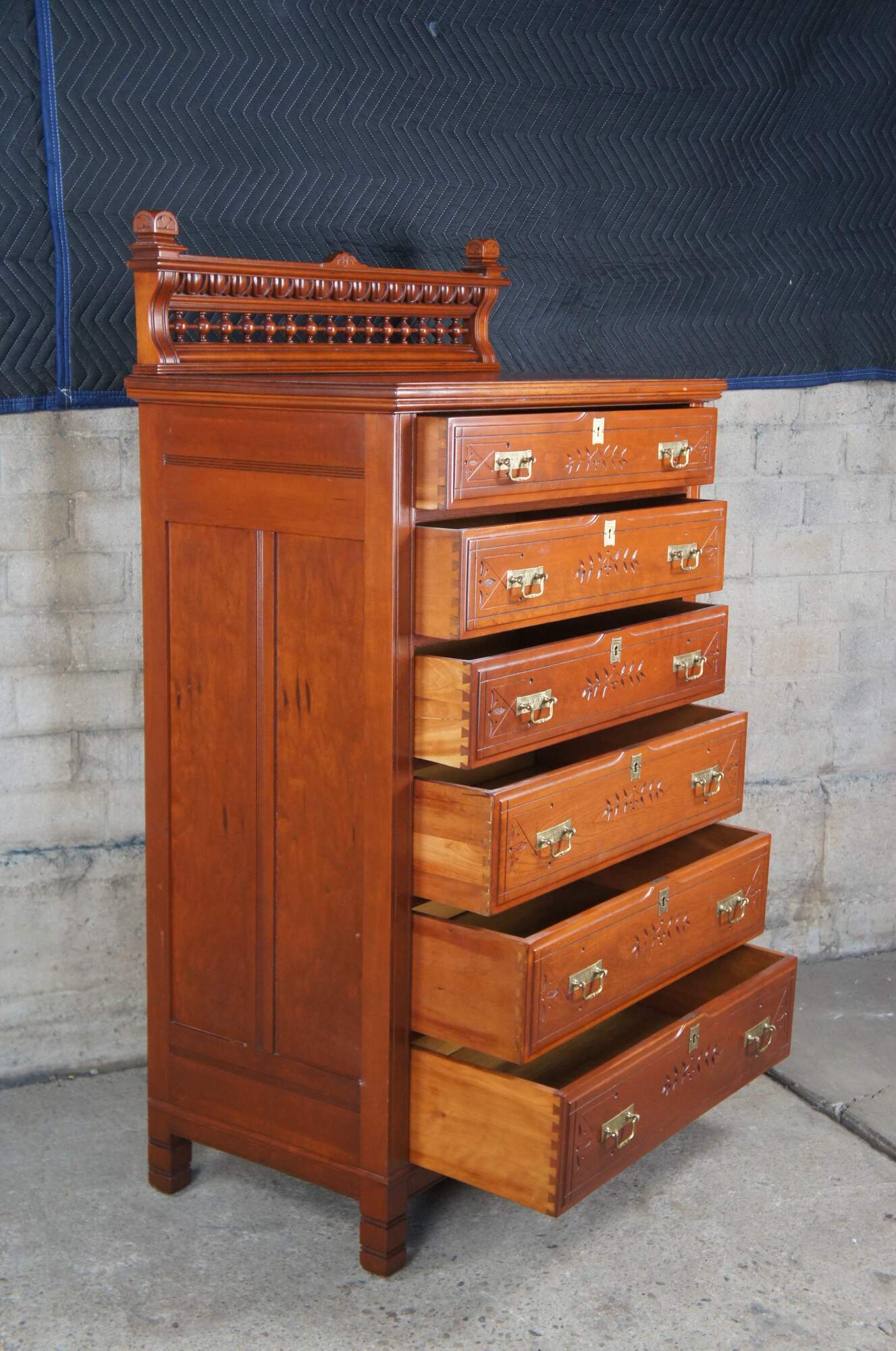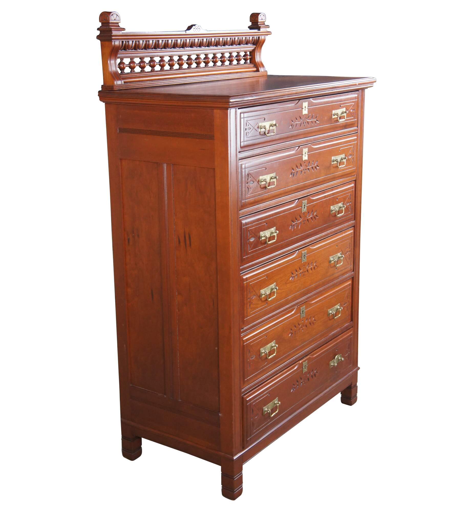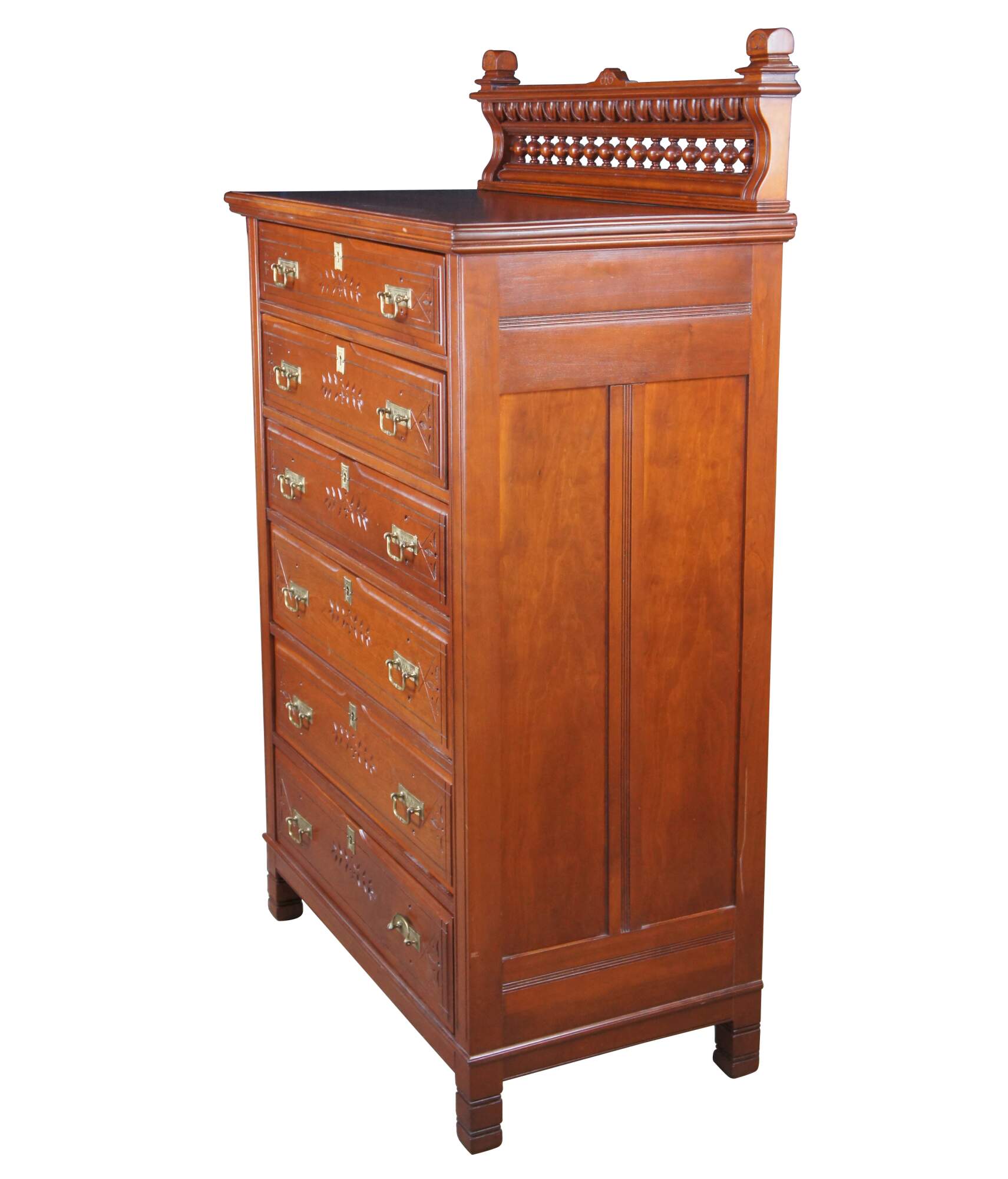 Impressive 19th century cherry highboy dresser, circa 1880s. Features 6 dovetailed drawers, carved with leaf and vine motif, ornate brass bale hardware and matching escutcheon plates. Stiles and drawer fronts have decorative shallow engraved lines giving reminiscent of cross hairs. The crown which is removable shows a beautiful mix of carvings methods with an egg and dart molding over pierced ball and stick center. Drawer locks patented in 1878 and 1882