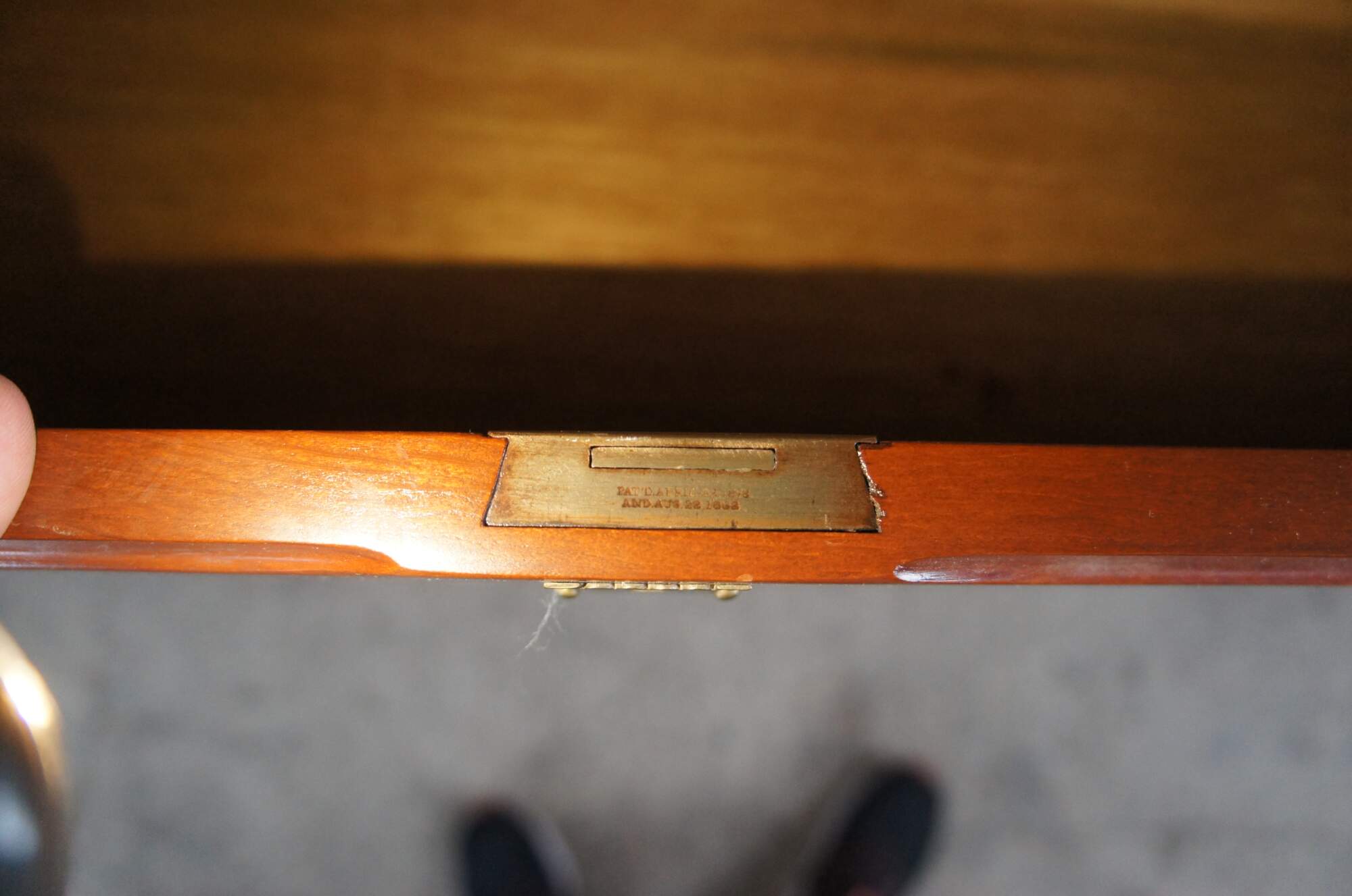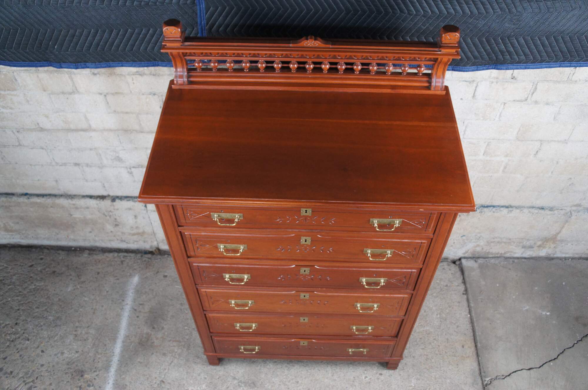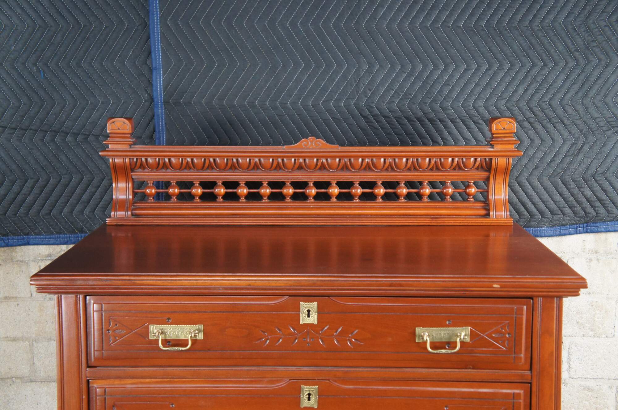 Impressive 19th century cherry highboy dresser, circa 1880s. Features 6 dovetailed drawers, carved with leaf and vine motif, ornate brass bale hardware and matching escutcheon plates. Stiles and drawer fronts have decorative shallow engraved lines giving reminiscent of cross hairs. The crown which is removable shows a beautiful mix of carvings methods with an egg and dart molding over pierced ball and stick center. Drawer locks patented in 1878 and 1882