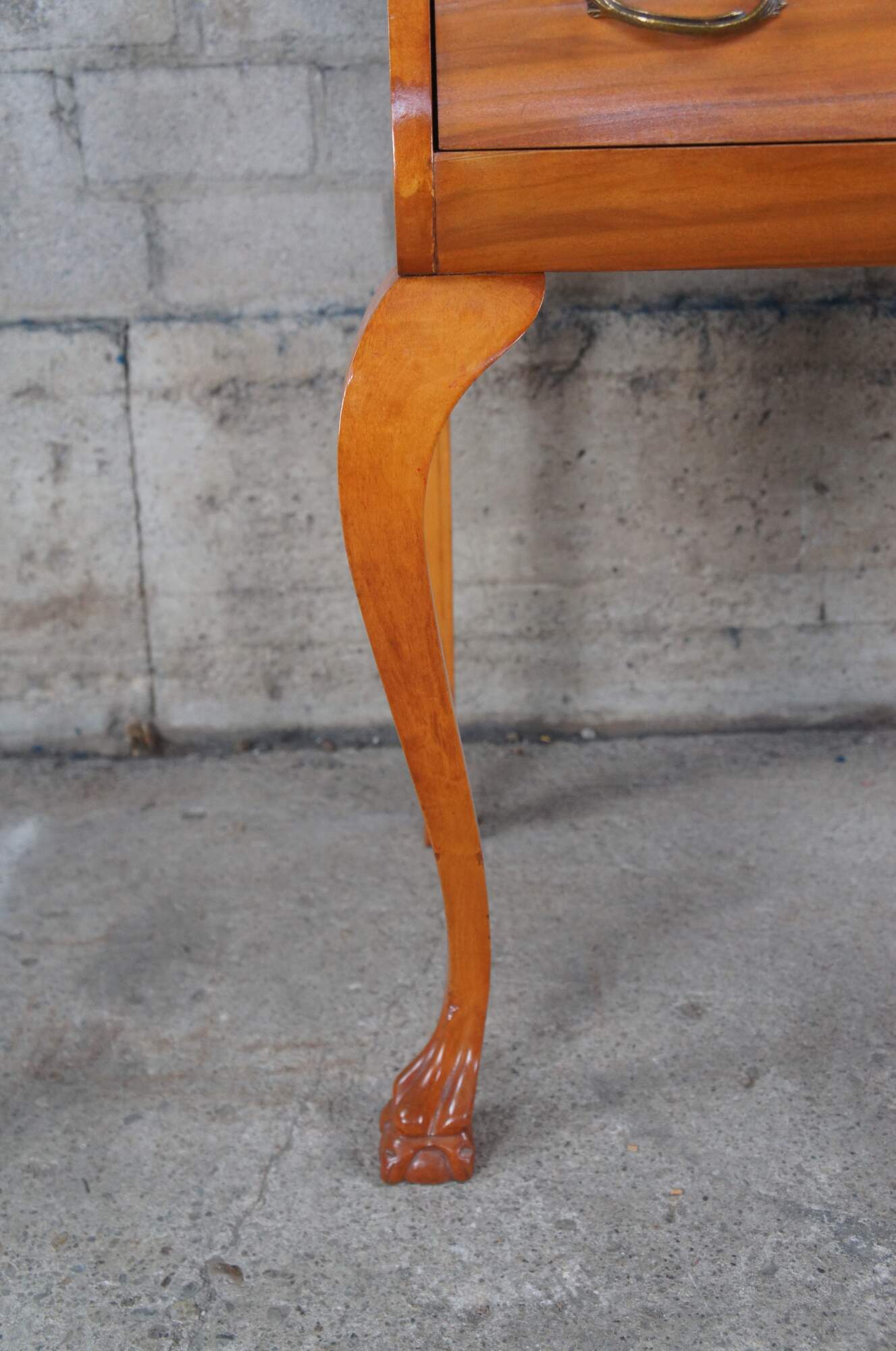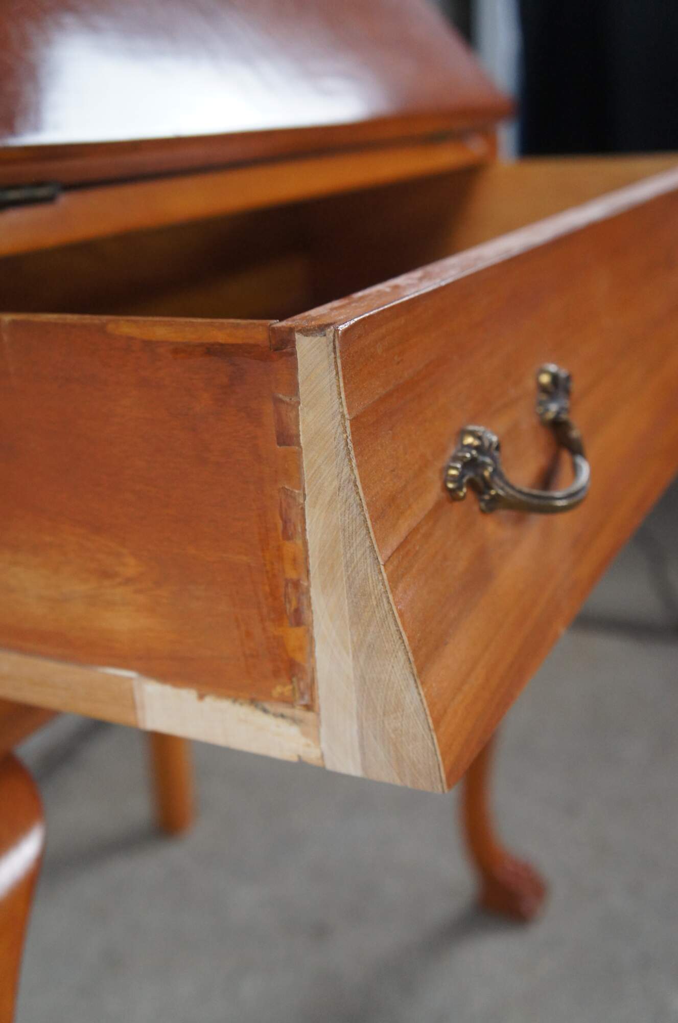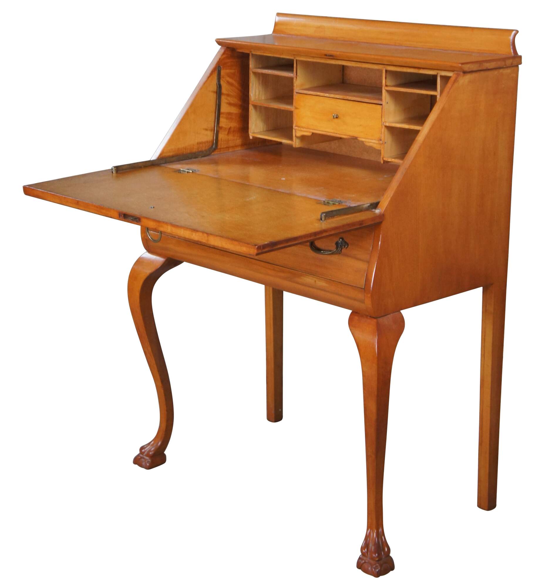 An antique early 20th century ladies secretary desk. Made from walnut with a maple writing surface. Features a drop front with neoclassical brass hardware over large central drawer with french pulls. Opens to seven pigeon holes and an accessory drawer. The case is supported by cabriole legs along the front with ball and claw feet and straight legs at the rear.