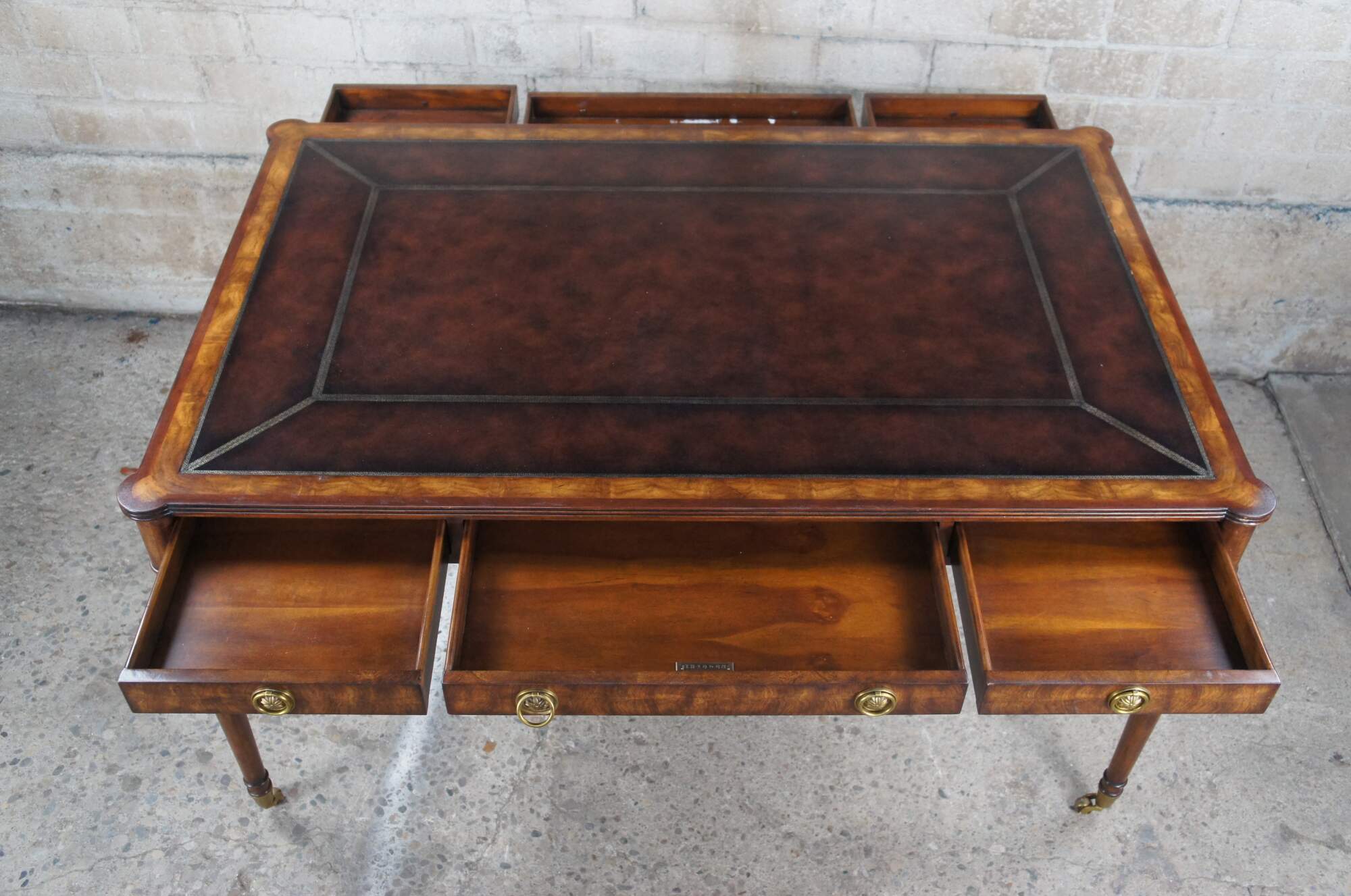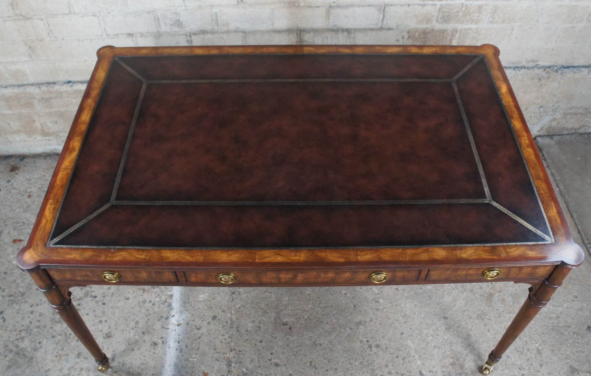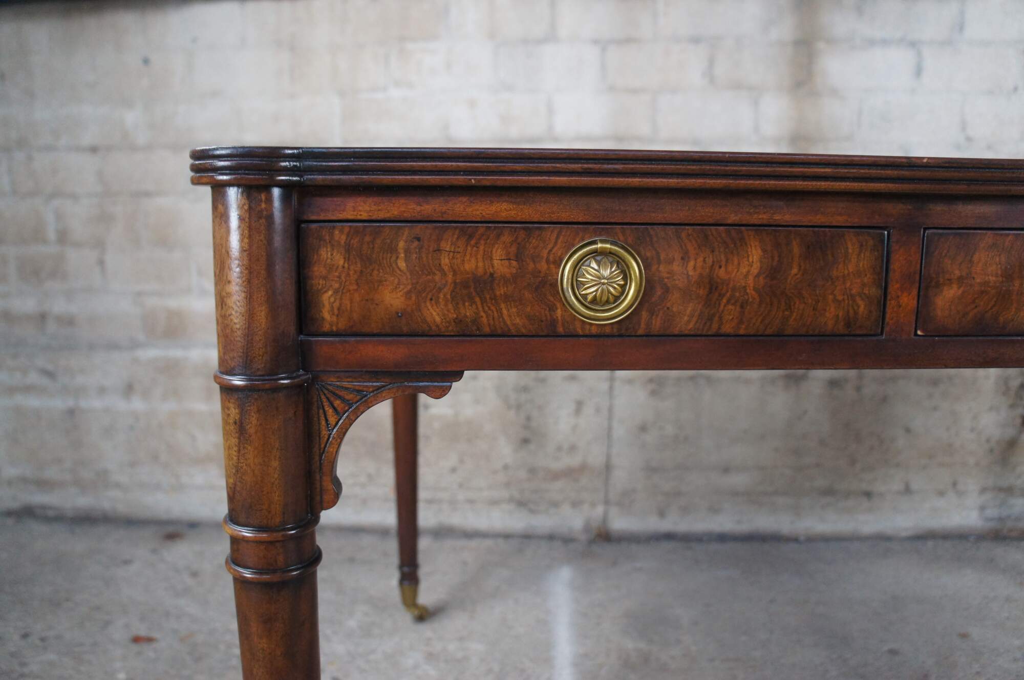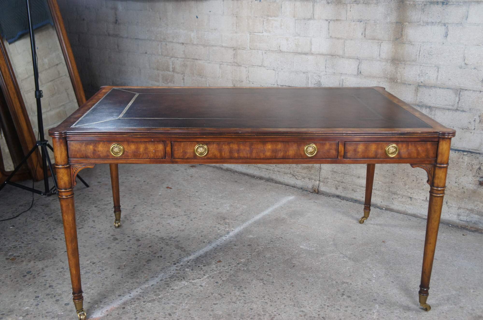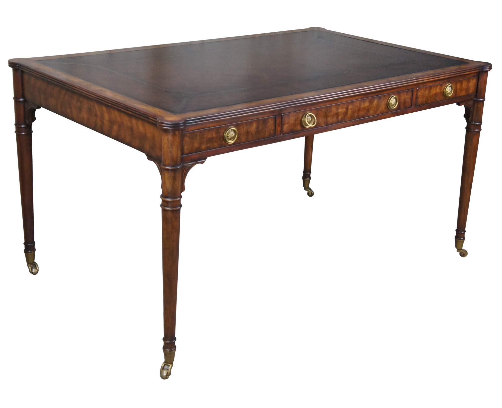Vintage Theodore Alexander ""A Man of Letters"" English Georgian writing table. Made of mahogany and flamed veneers with tooled Greek Key leather inset top with protruding rounded corners above double sided frieze drawers over long turned legs with brass castors. #7100-166HN