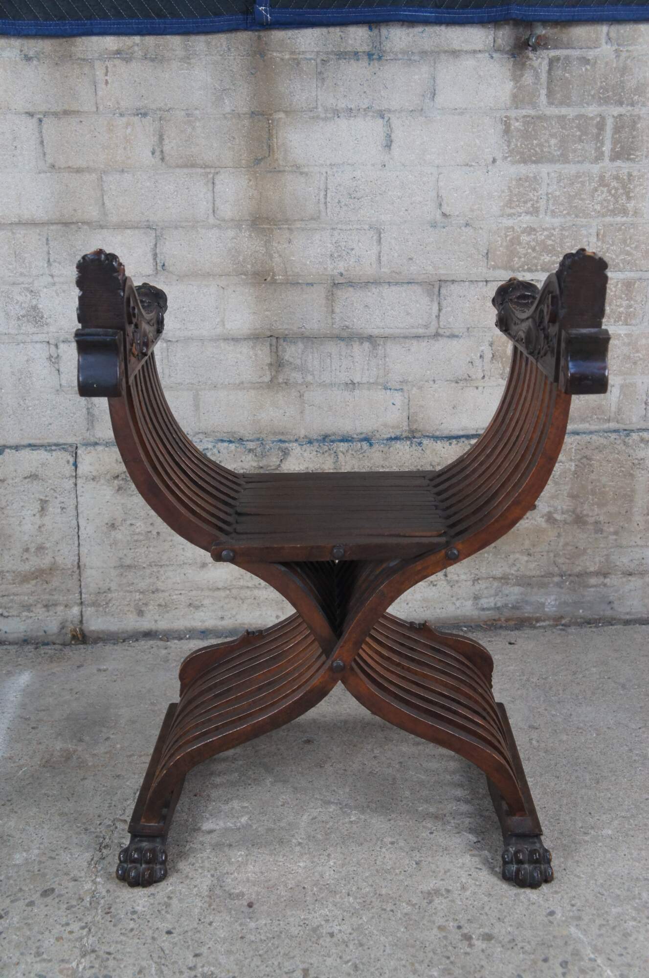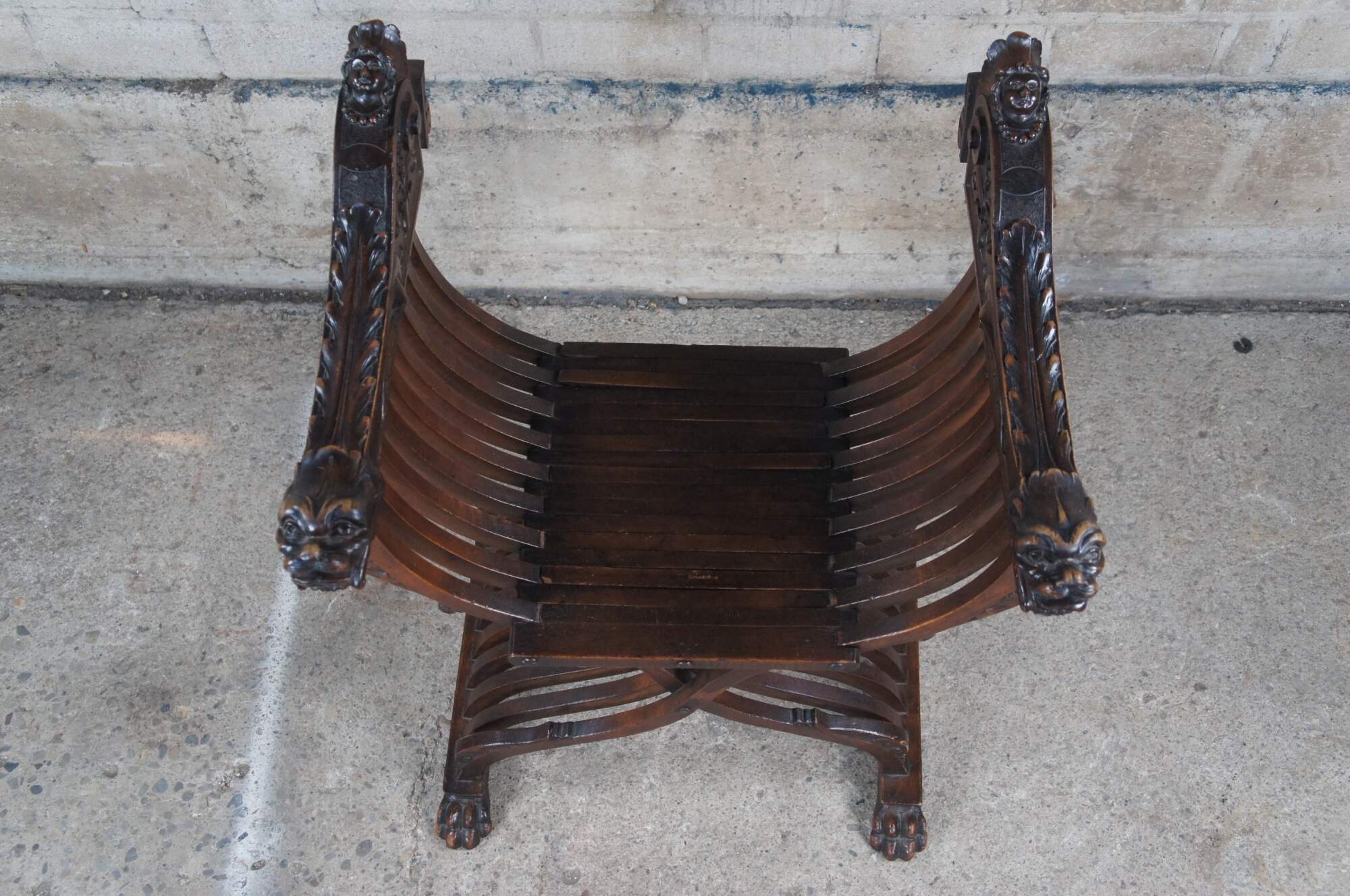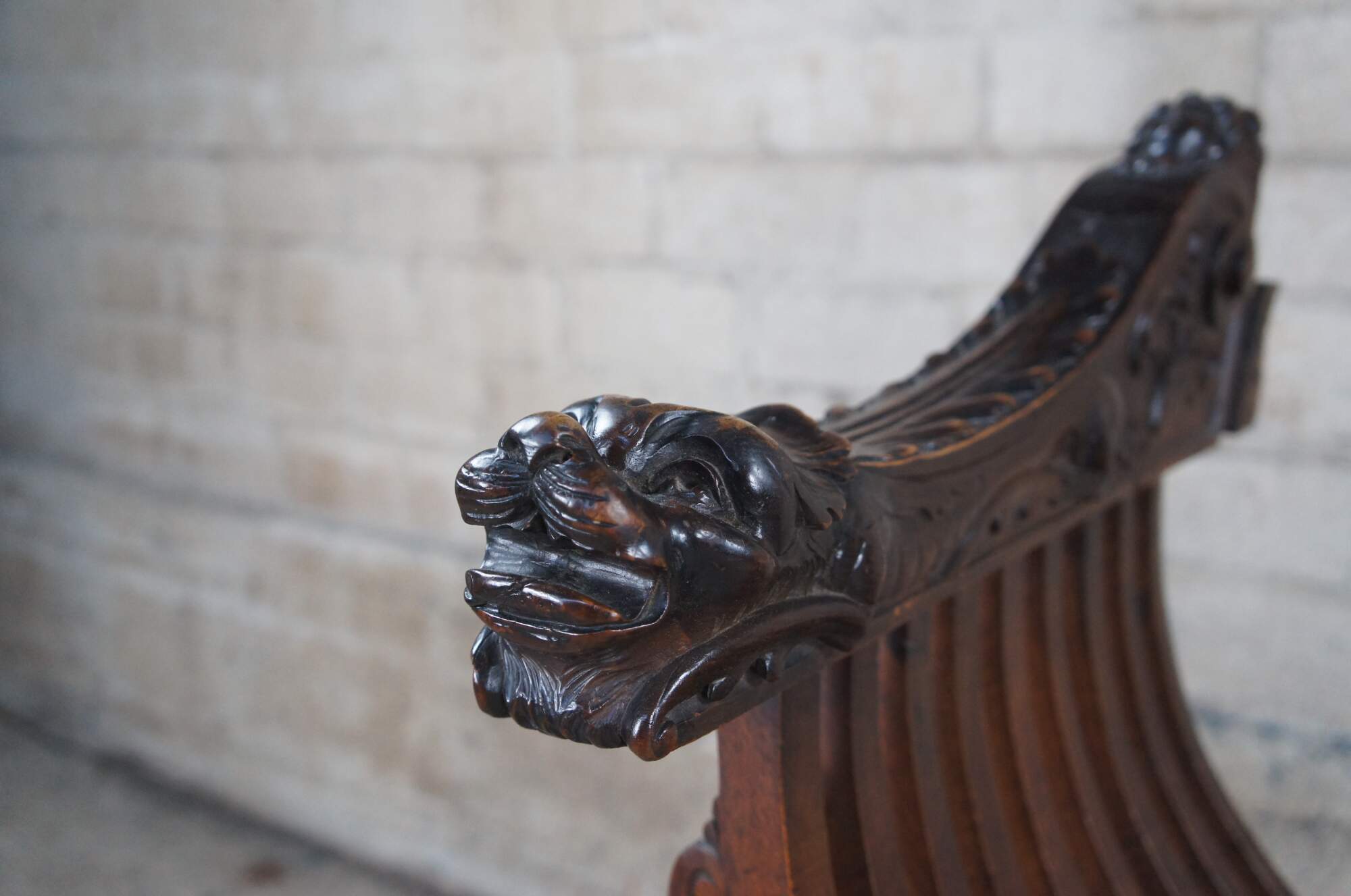 Antique Savonarola mahogany Campaign arm chair. Features a serpentine X frame with dragon / lion head arms featuring a figural female bust by the shoulder between an open back and paw / claw feet.
