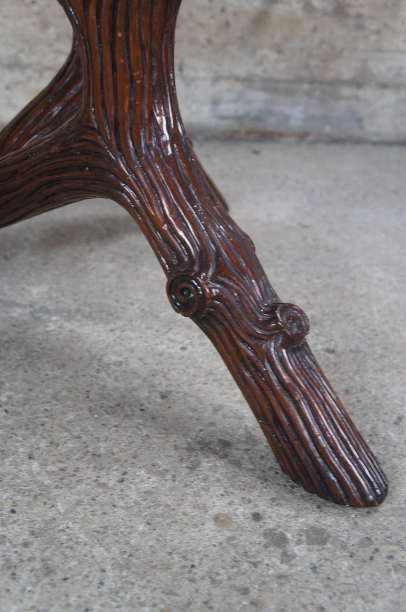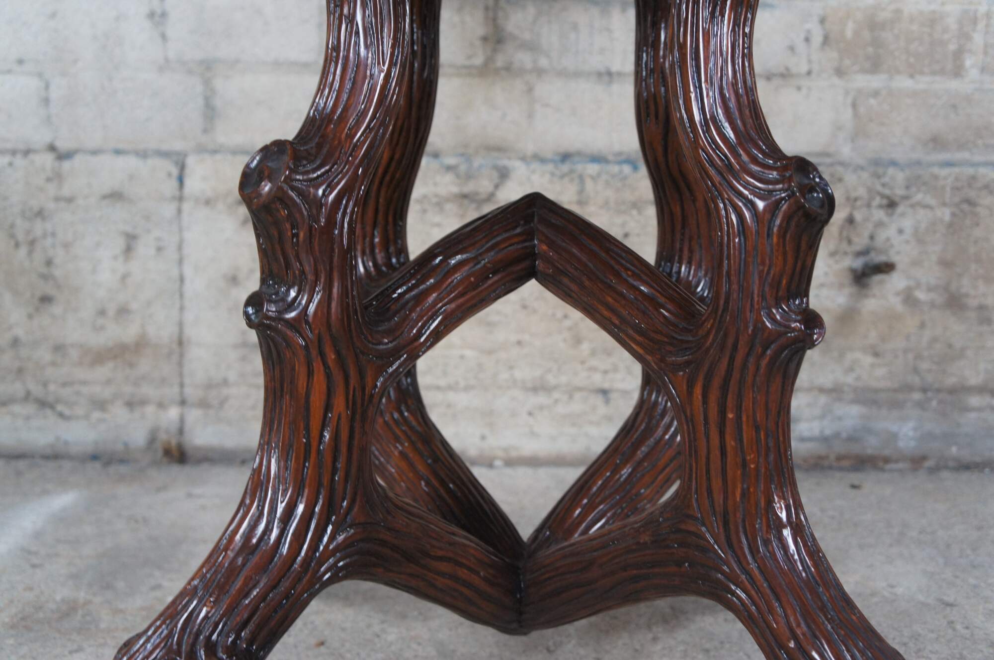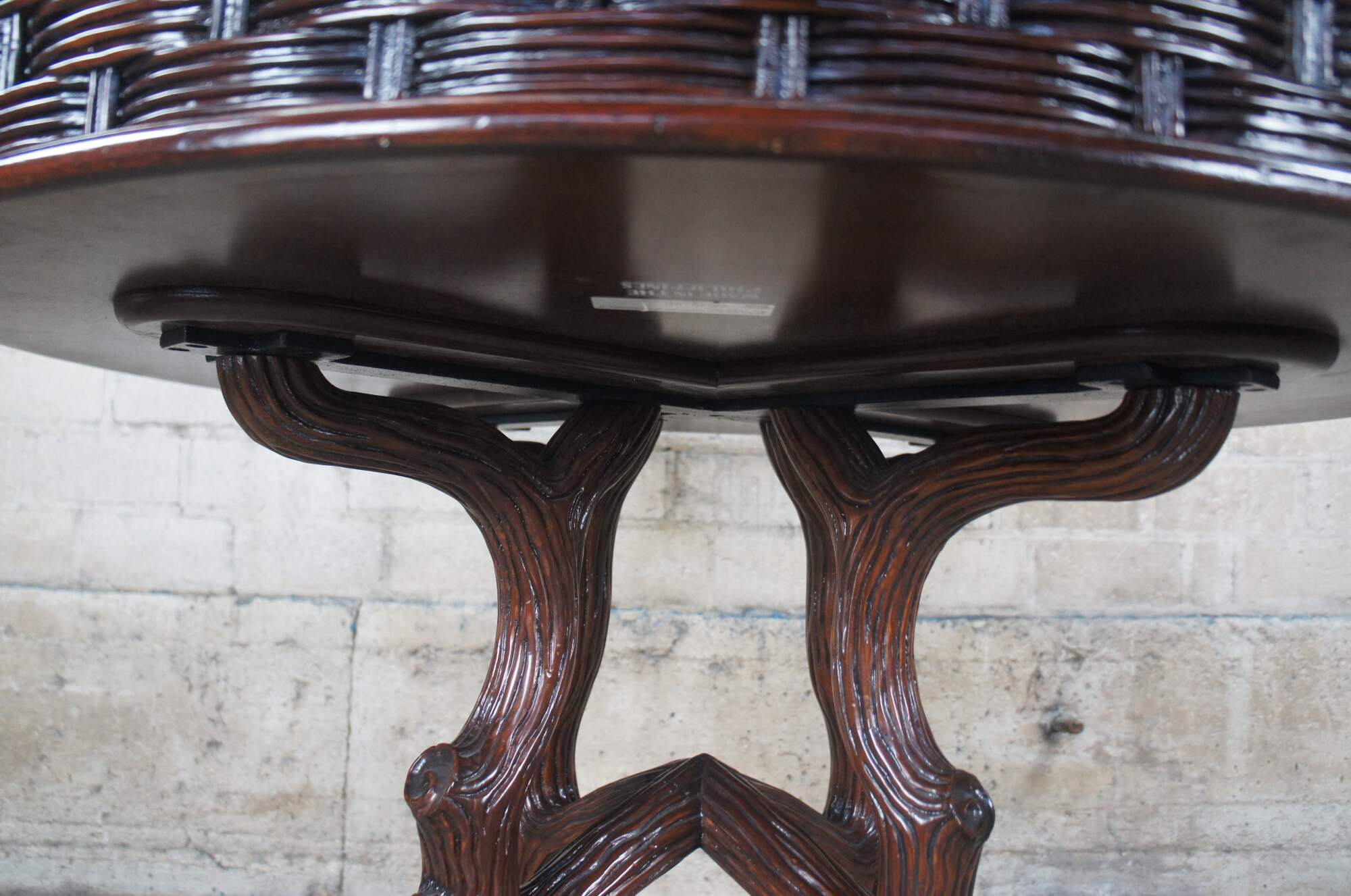Vintage EJ Victor for Ralph Lauren modern adirondack center table, circa last quarter 20th century. Made from oak with a wram brown finish. Features a round top with molded basketweave edge and one drawer, over a freeform tree or log molded base. An amazing find as these tables rarely make it to market.