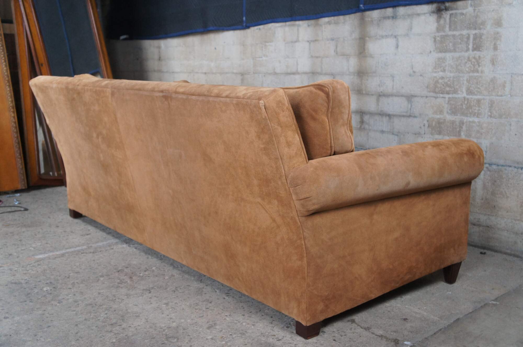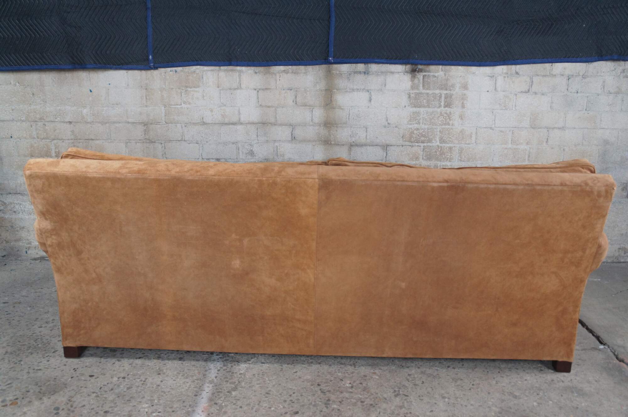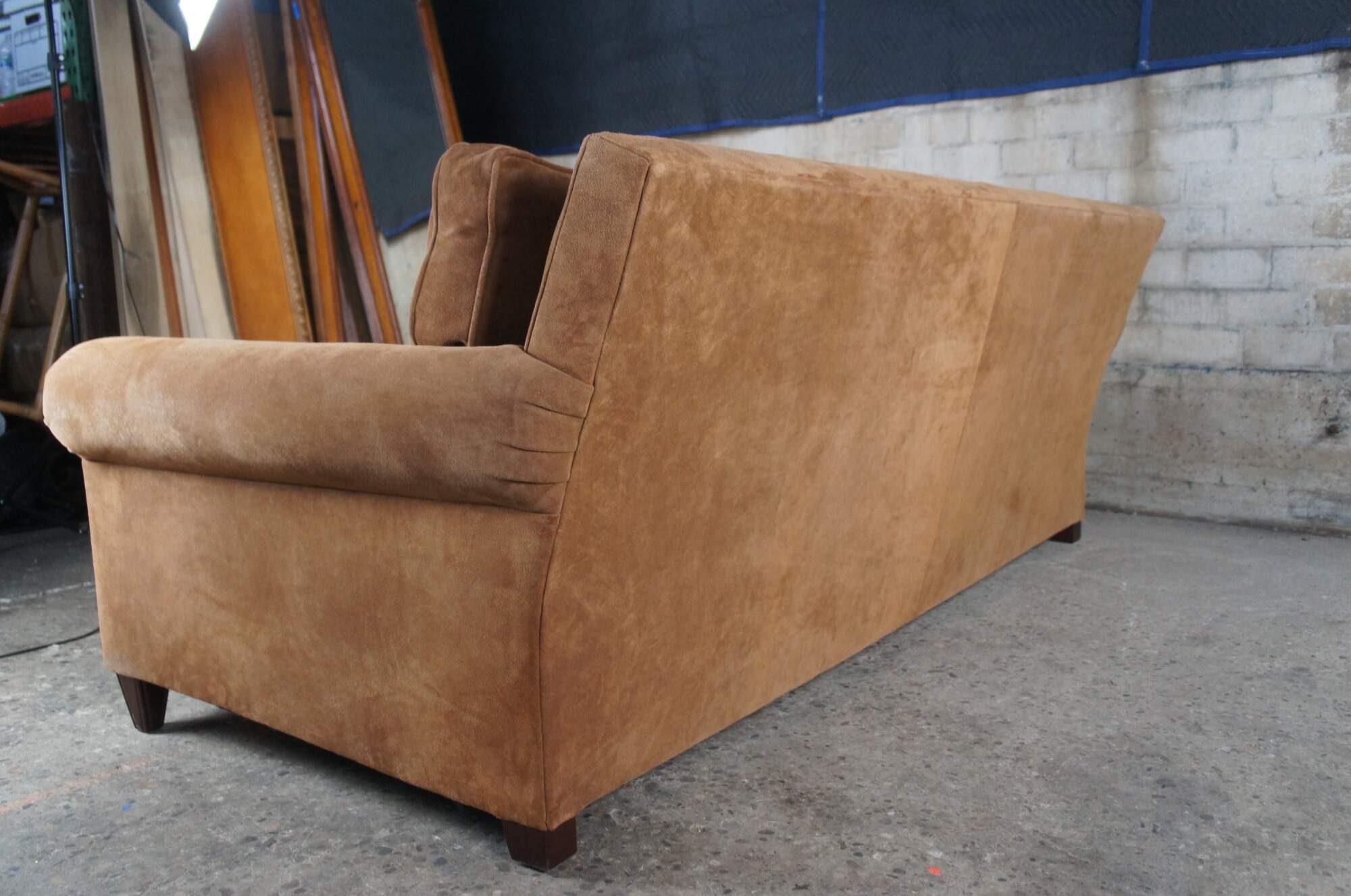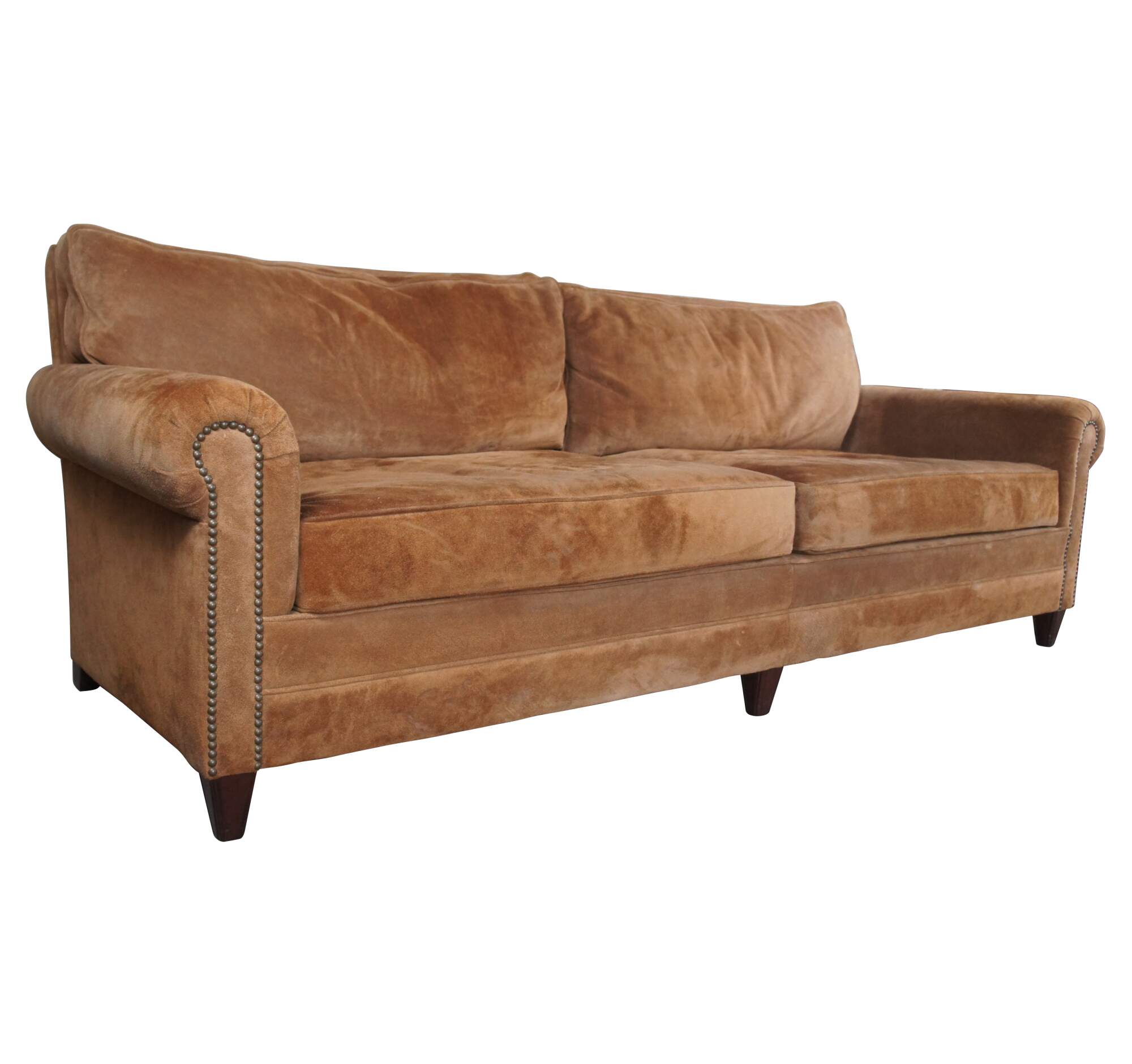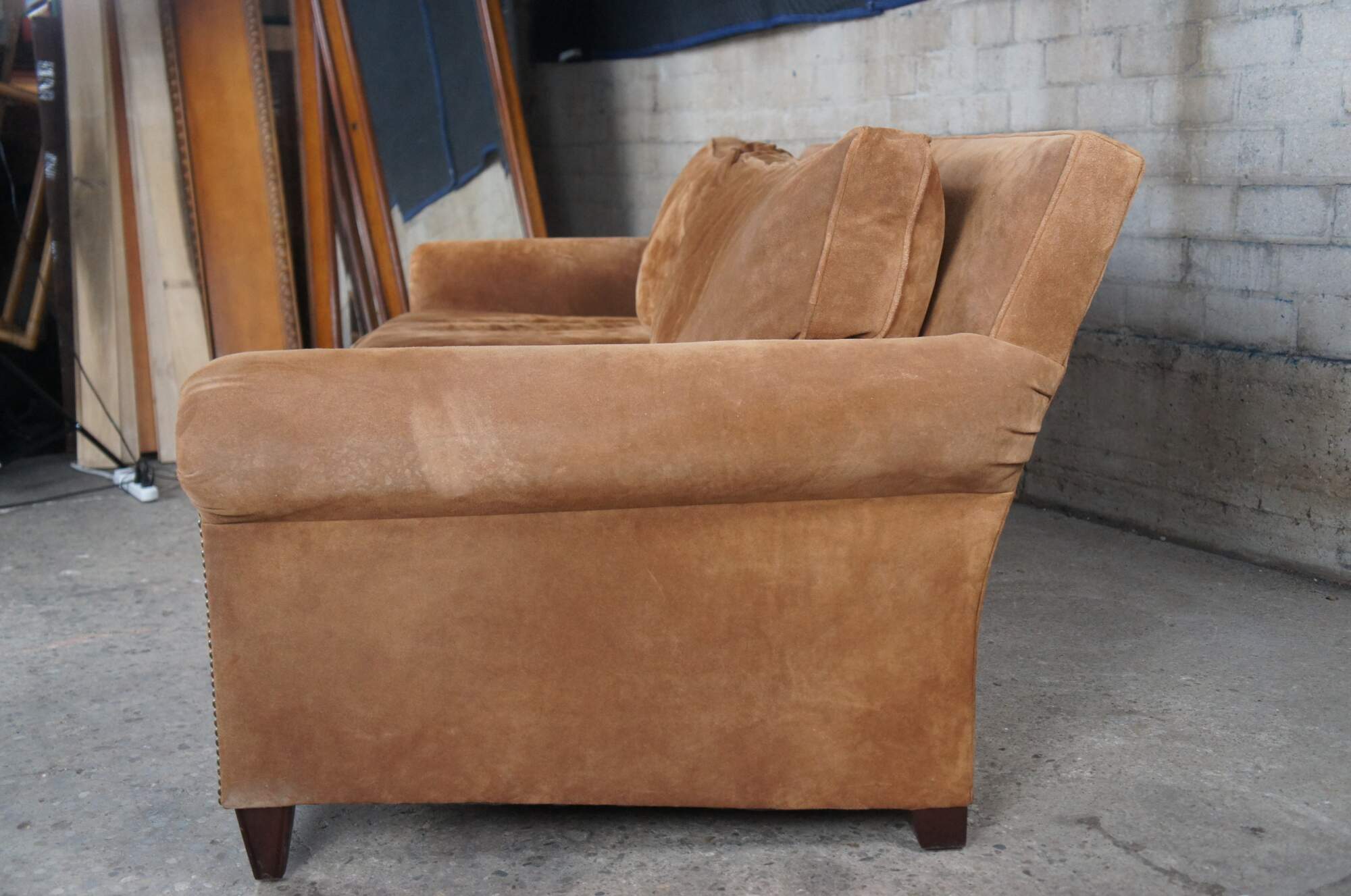 Vintage Ralph Lauren brown suede rolled arm sofa or couch featuring nailhead trim and deep luxury depth. MSRP $15,000