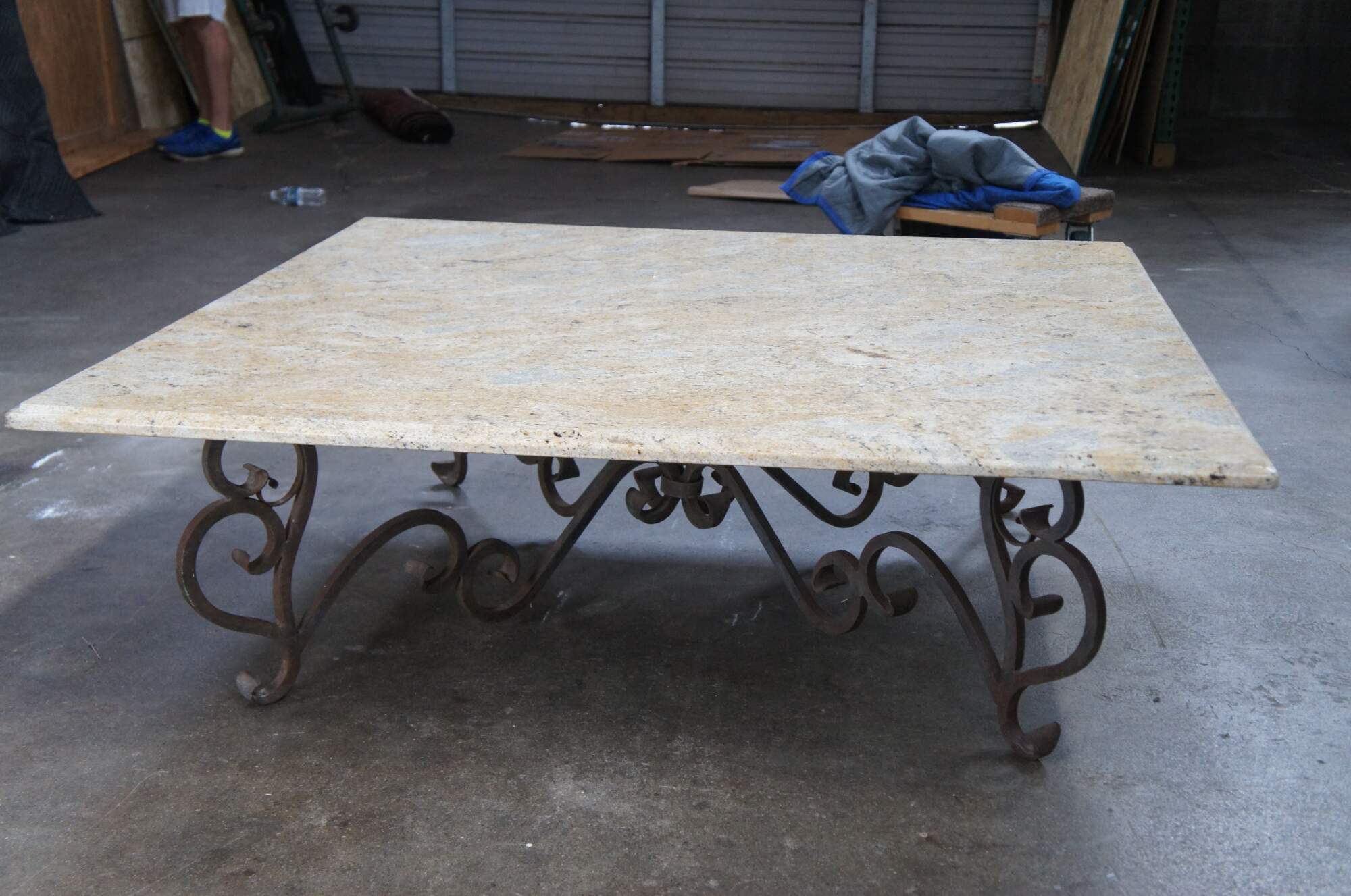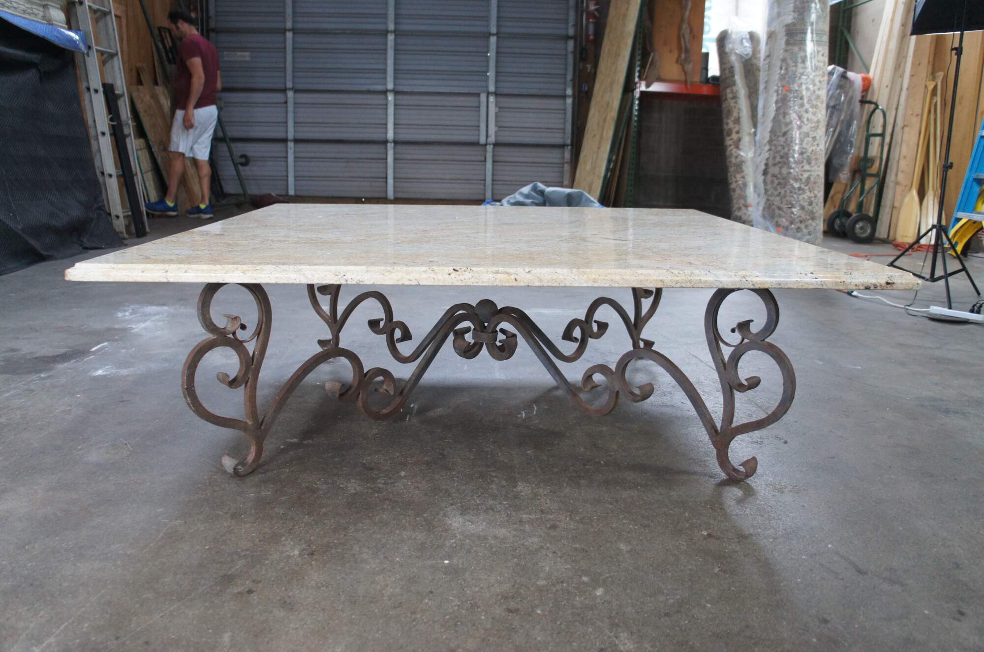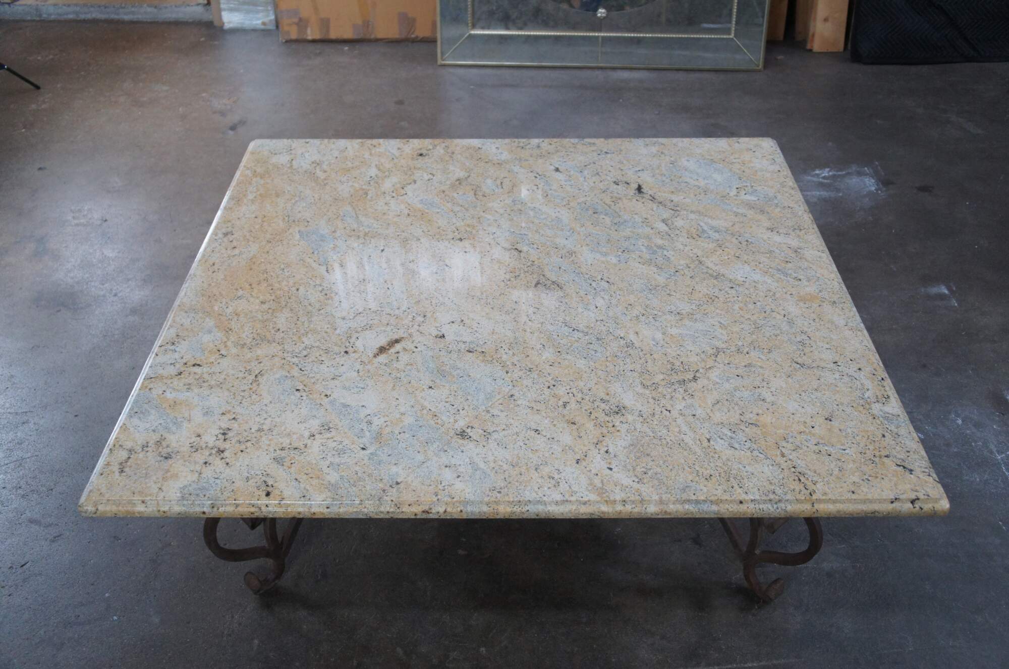 A large and impressive coffee table featuring square form with French scrolled / serpentine wrought iron base and heavy Granite stone top with beveled edge. Very heavy.