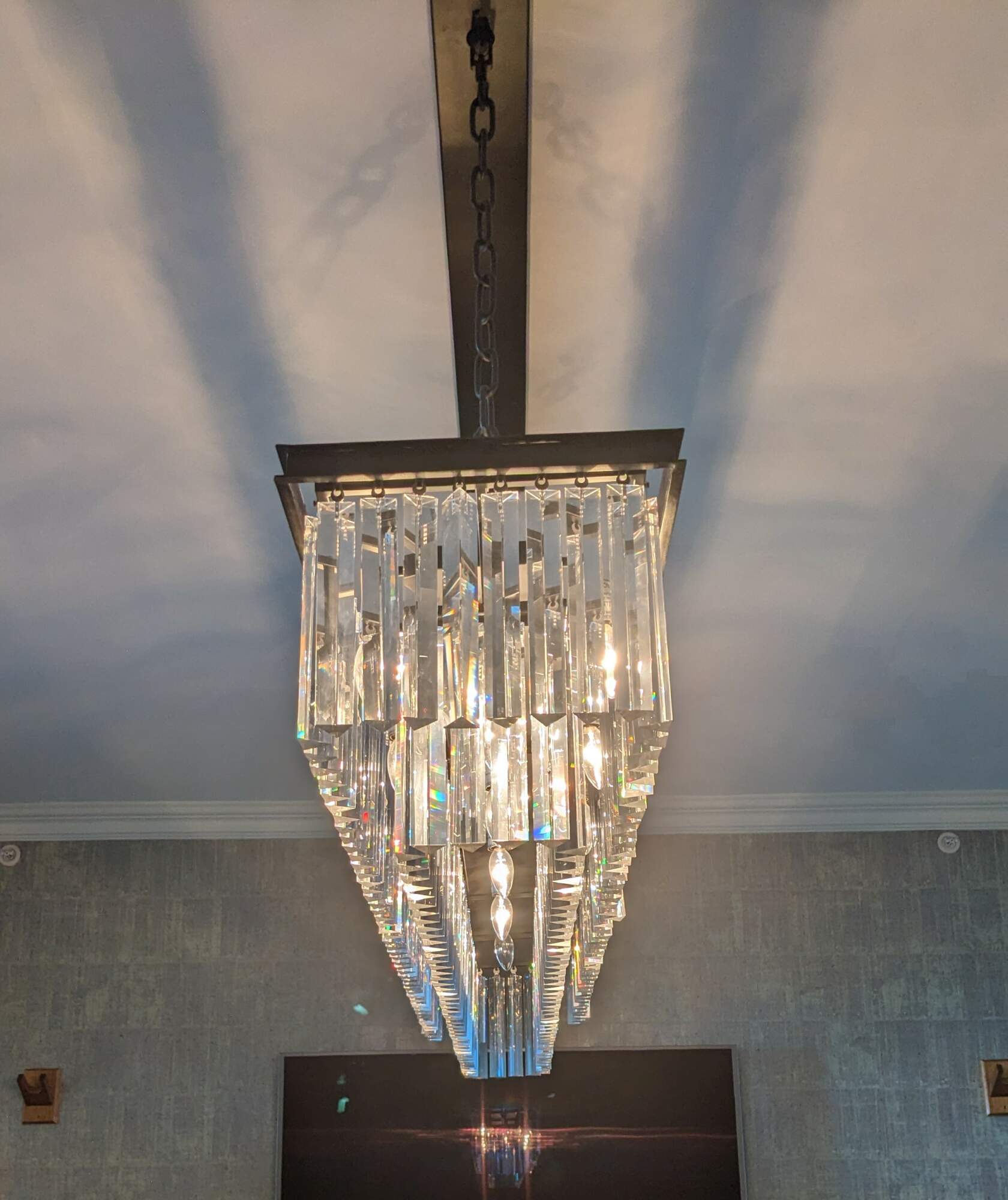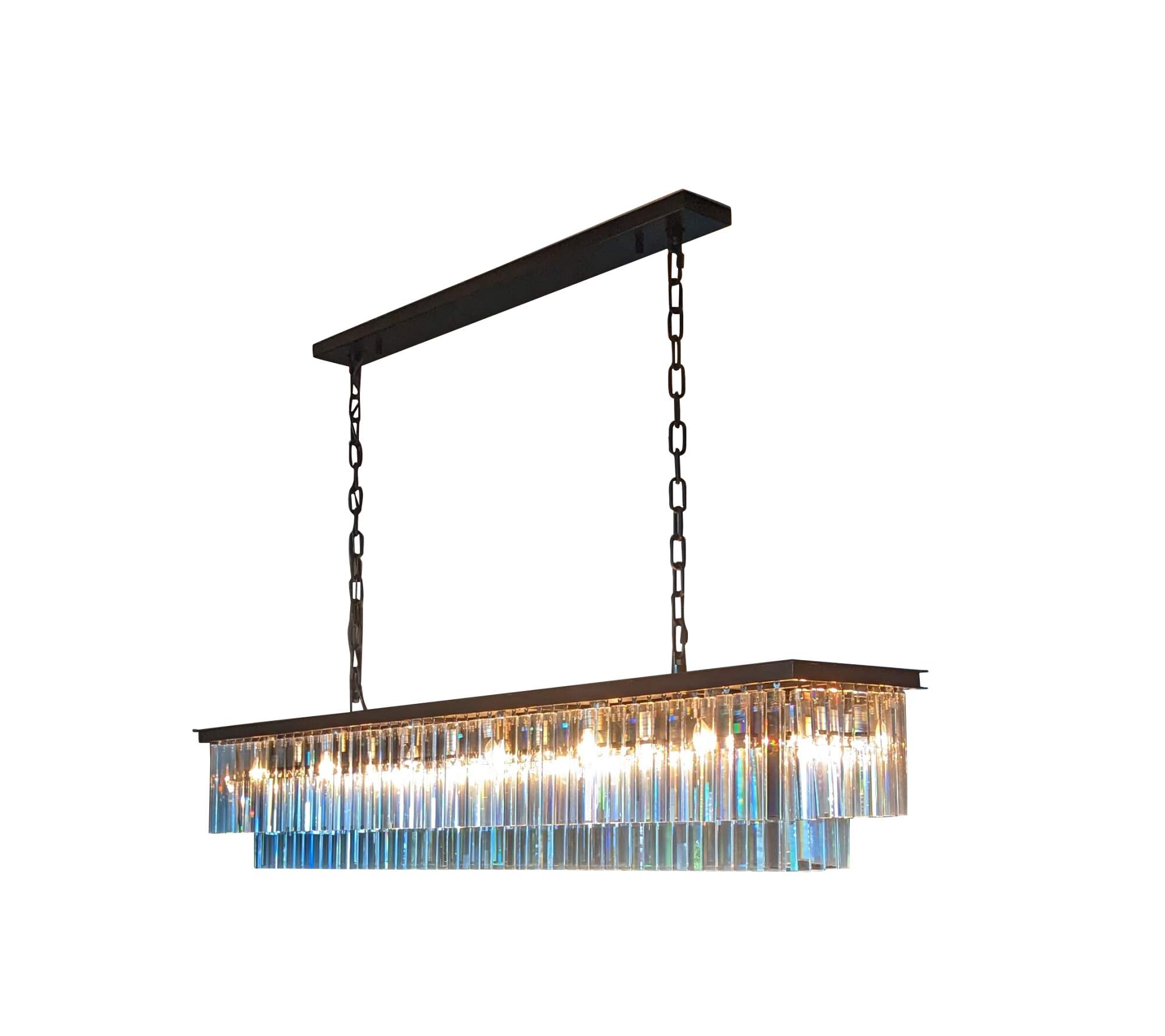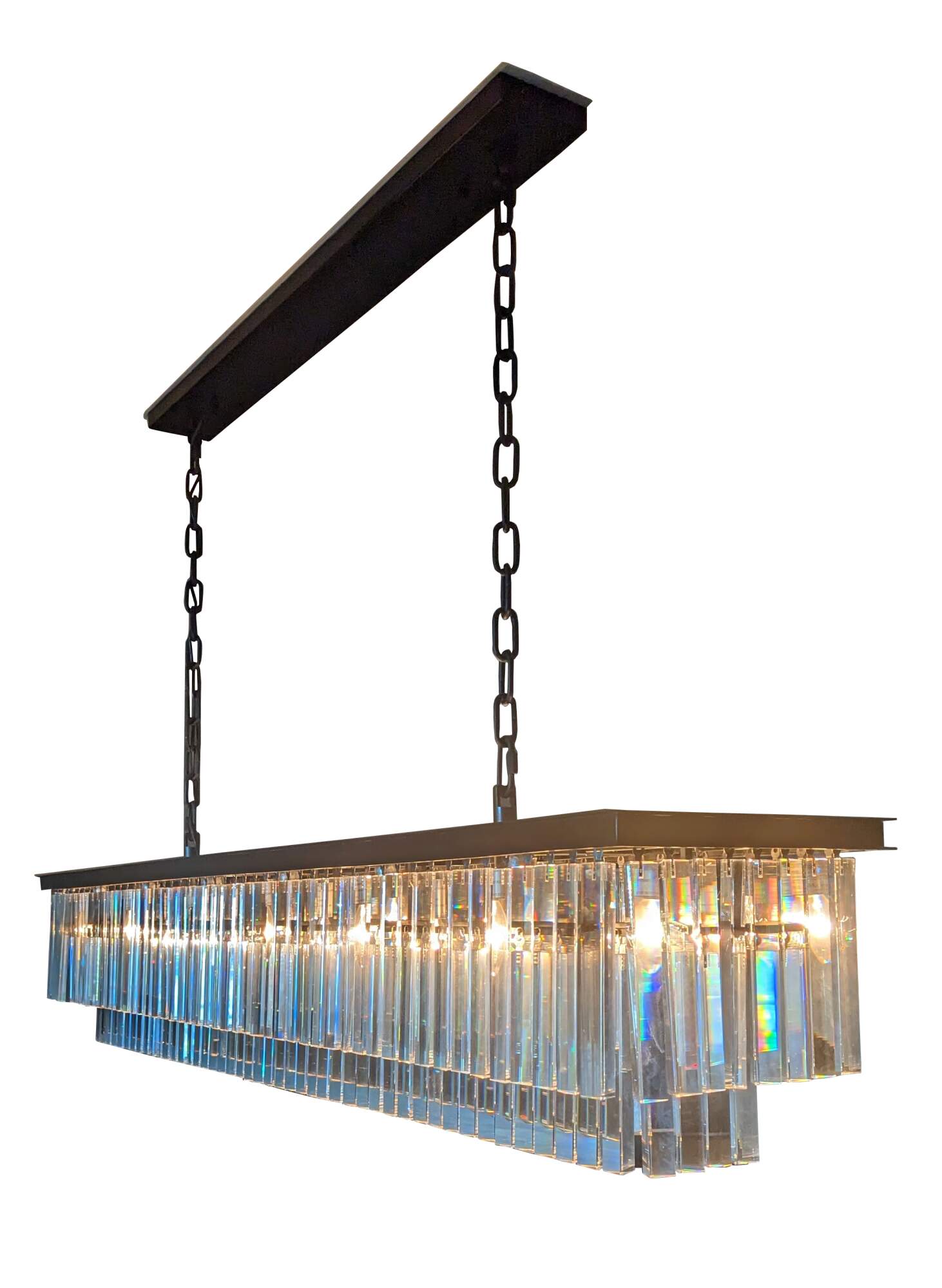 Inspired by the Art Deco style of 1920s Paris, our collection from Timothy Oulton captures the period's fascination with geometric forms. Masterfully refracting the light, hundreds of faceted, dynamic prisms evoke the allure of the era. Hanging like lush fringe from a welded iron frame, the angular glass juxtaposes elegance and industrialism. MSRP $8,715.