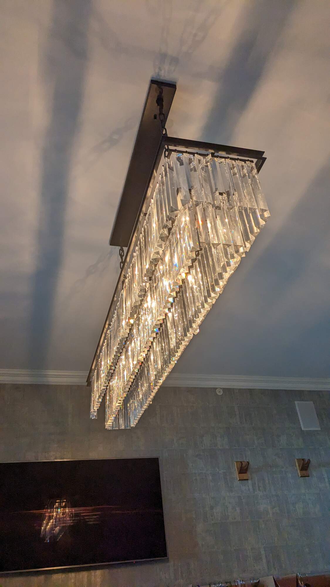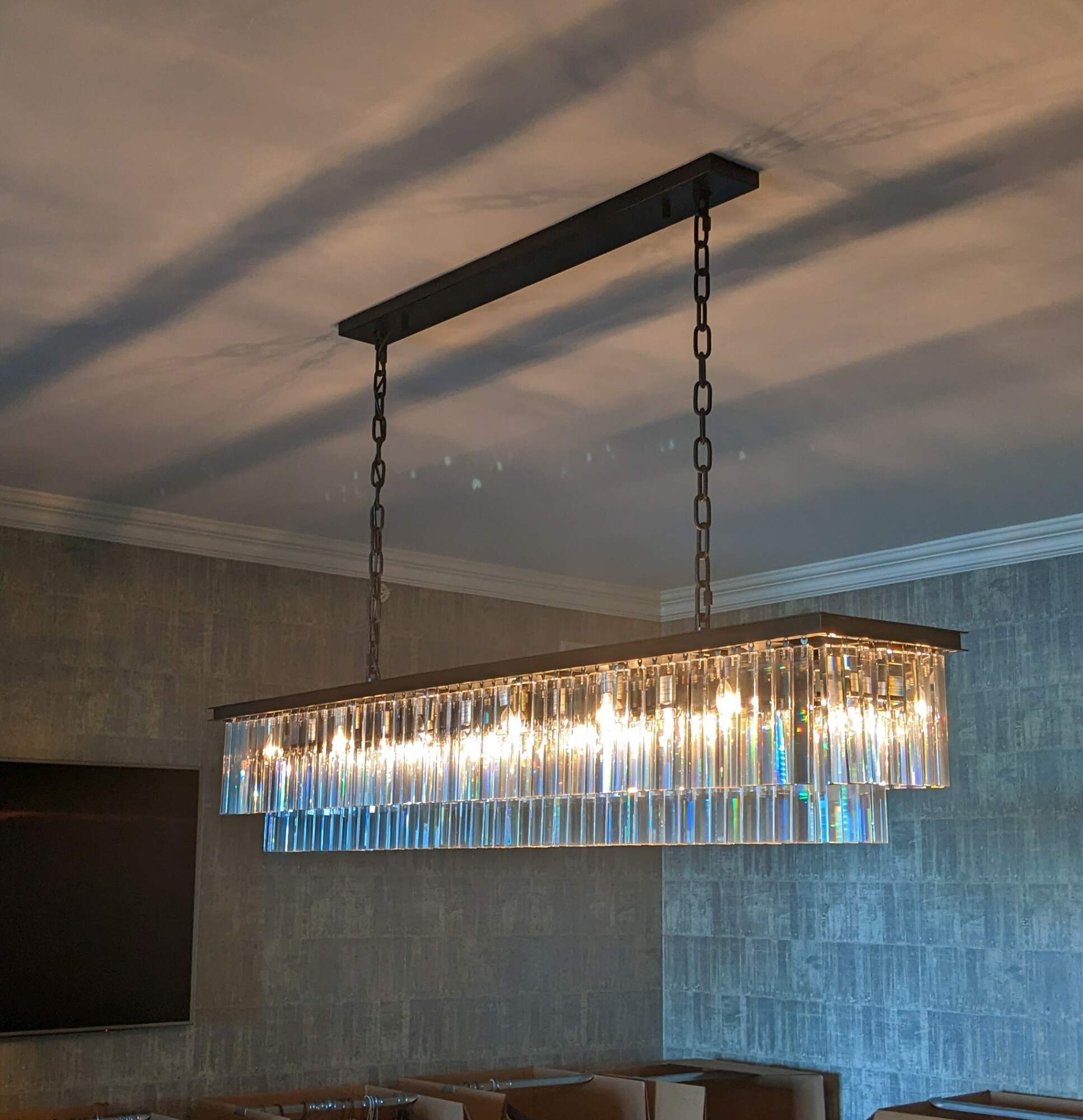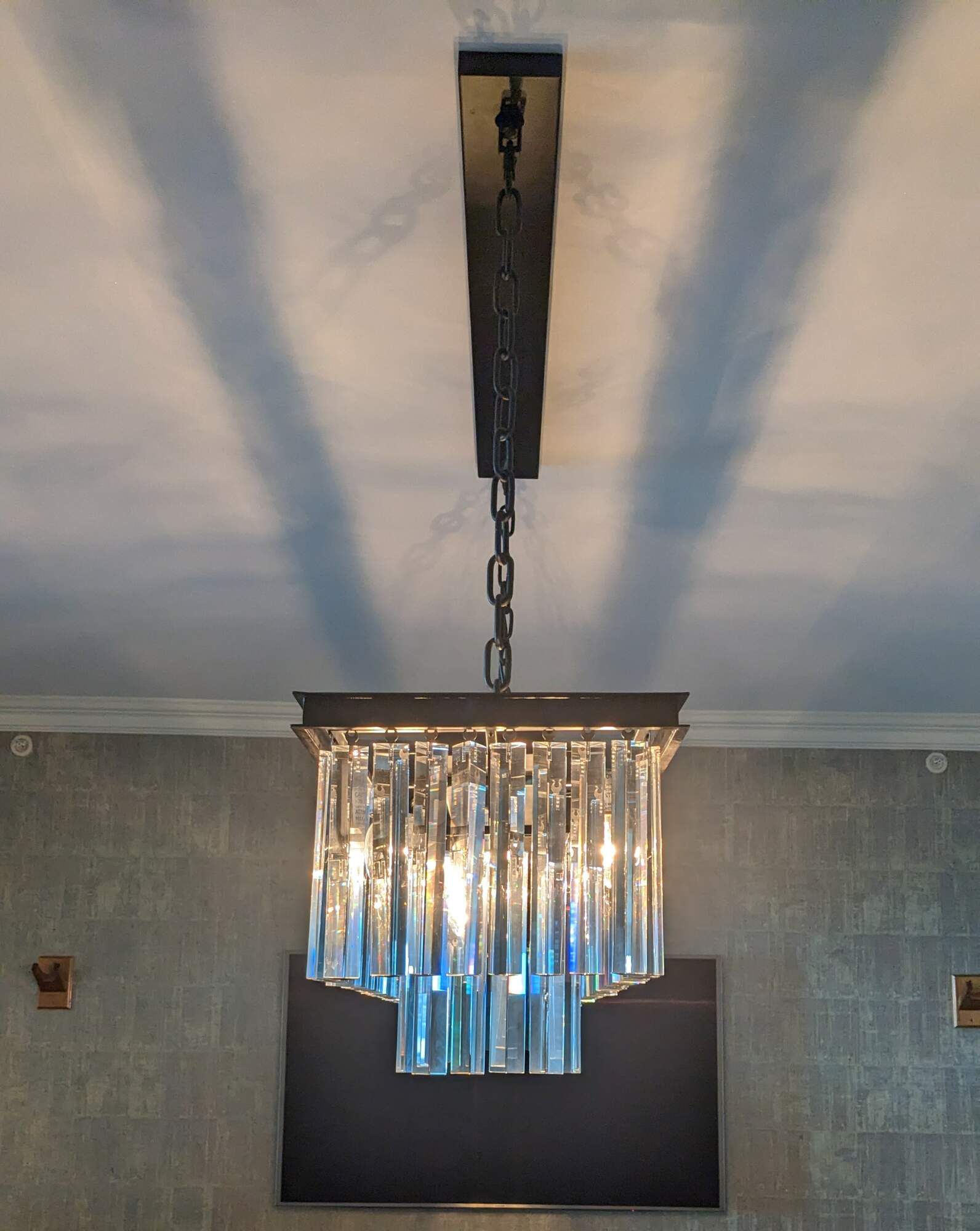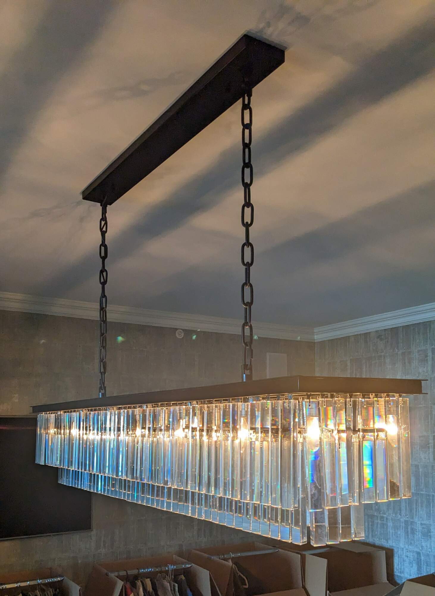 Inspired by the Art Deco style of 1920s Paris, our collection from Timothy Oulton captures the period's fascination with geometric forms. Masterfully refracting the light, hundreds of faceted, dynamic prisms evoke the allure of the era. Hanging like lush fringe from a welded iron frame, the angular glass juxtaposes elegance and industrialism. MSRP $8,715.