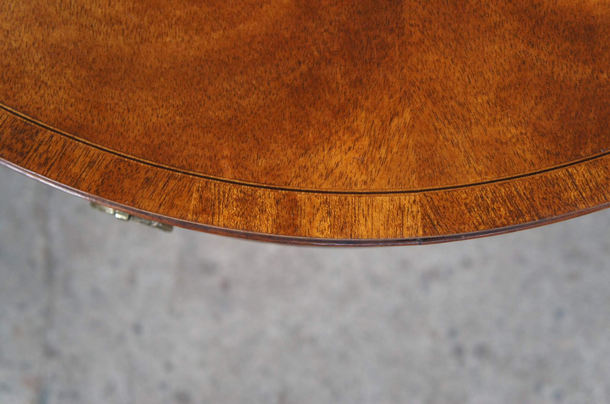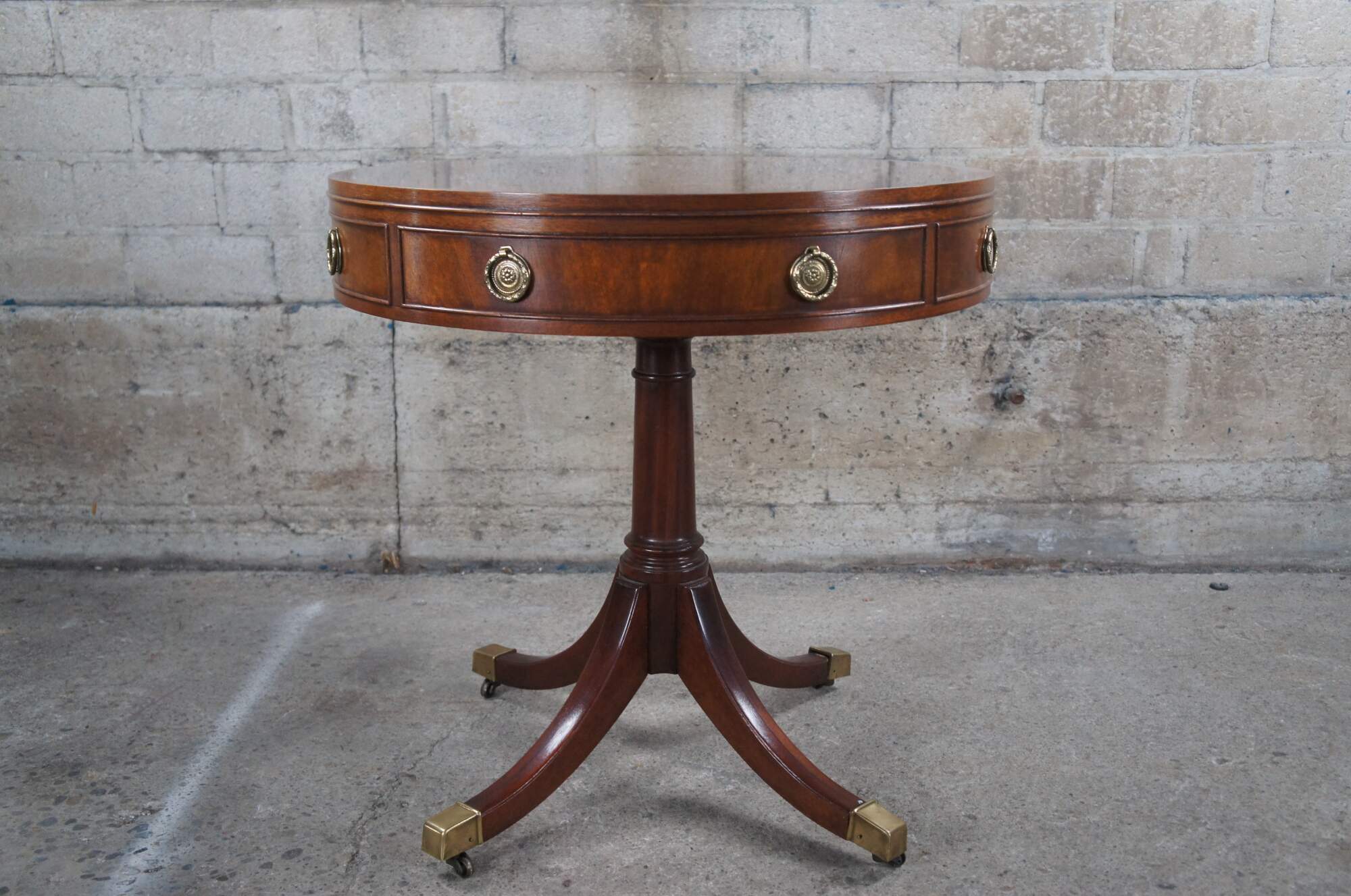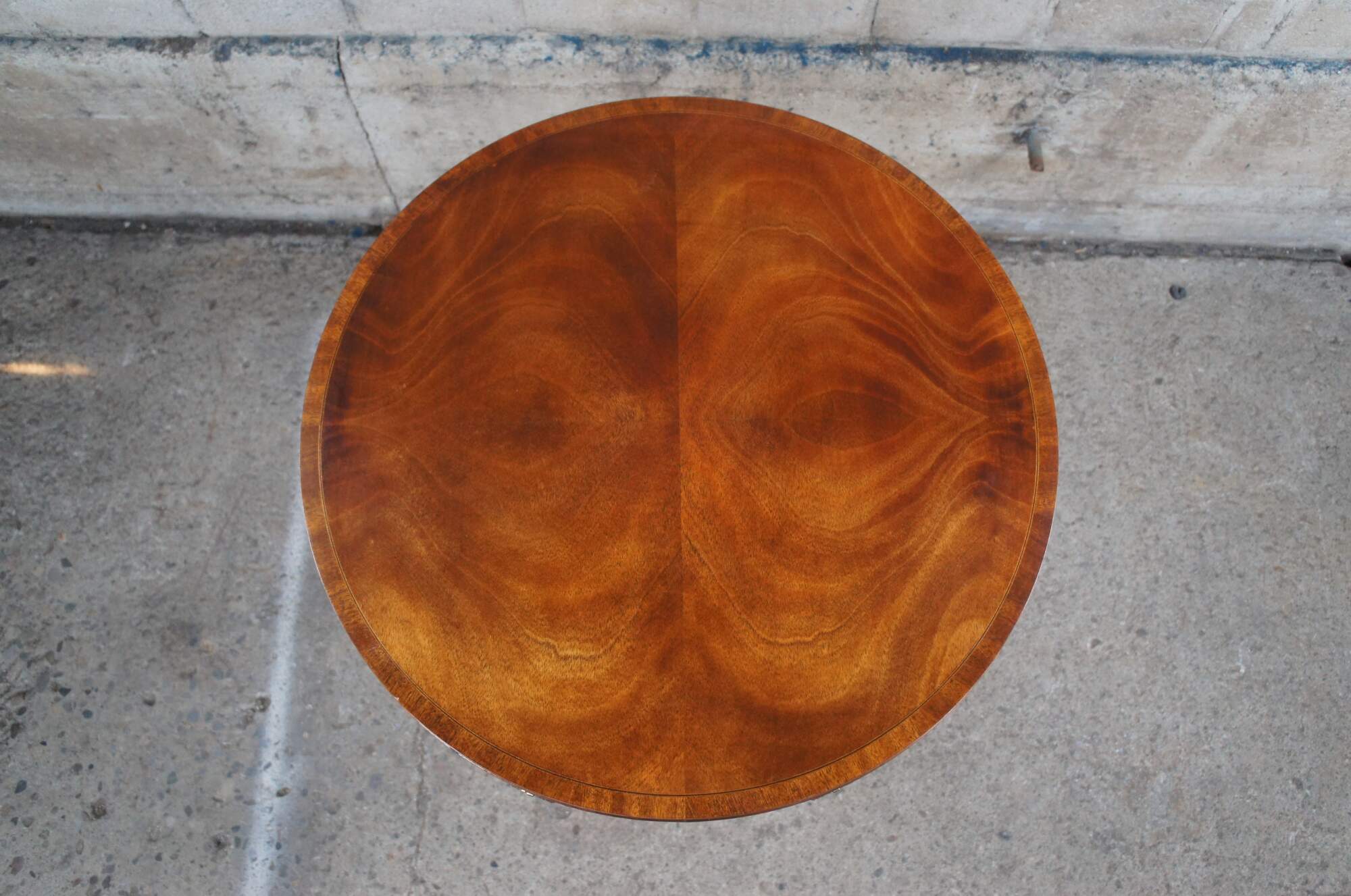 A gorgeous side or accent table by Baker Furniture, Circa last quarter 20th century. Drawing inspiration from English Georgian and Sheraton styling. Made from mahogany with a matchbook banded and inlayed top. The frieze features one dovetailed drawer amongst false drawers with neoclassical ring pulls. The table is supported by a turned graduated baluster support leadinig to four downswept legs with brass capped feet and casters. Marked Baker via metal tag within the drawer. Includes a polished glass top for protection.