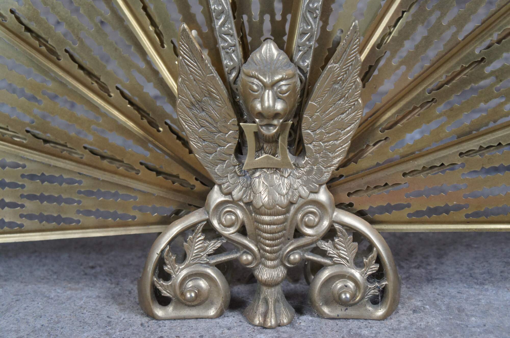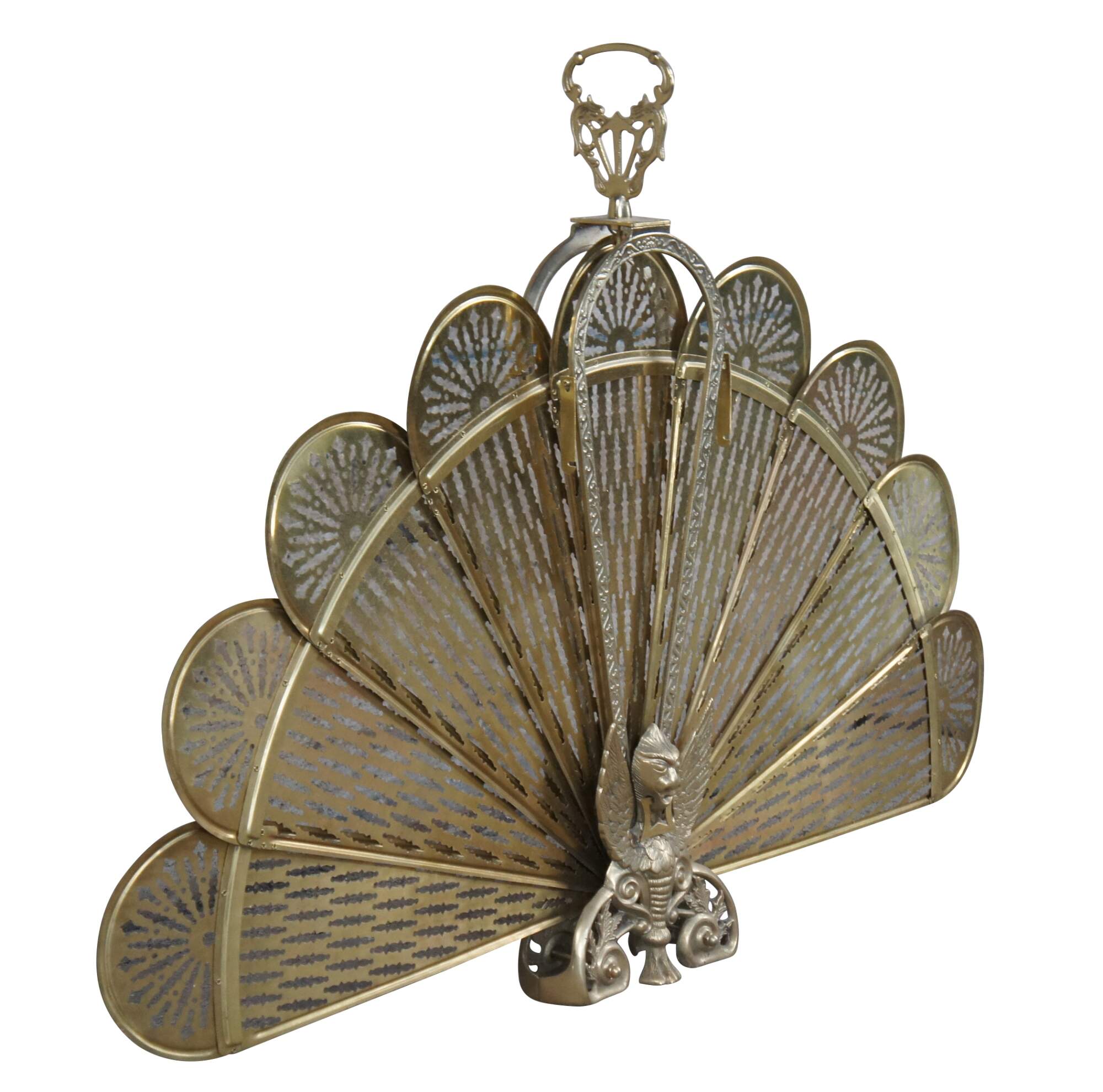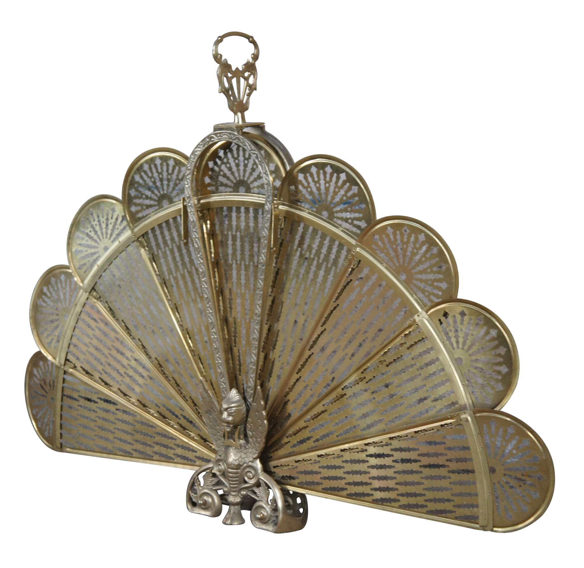 A vintage brass fireplace fan inspired by Art Deco & Victorian styling. Features a peacock design with pierced blades, ornate handle and scrolled figural Phoenix / Griffin foot. An eye catcher for any space!