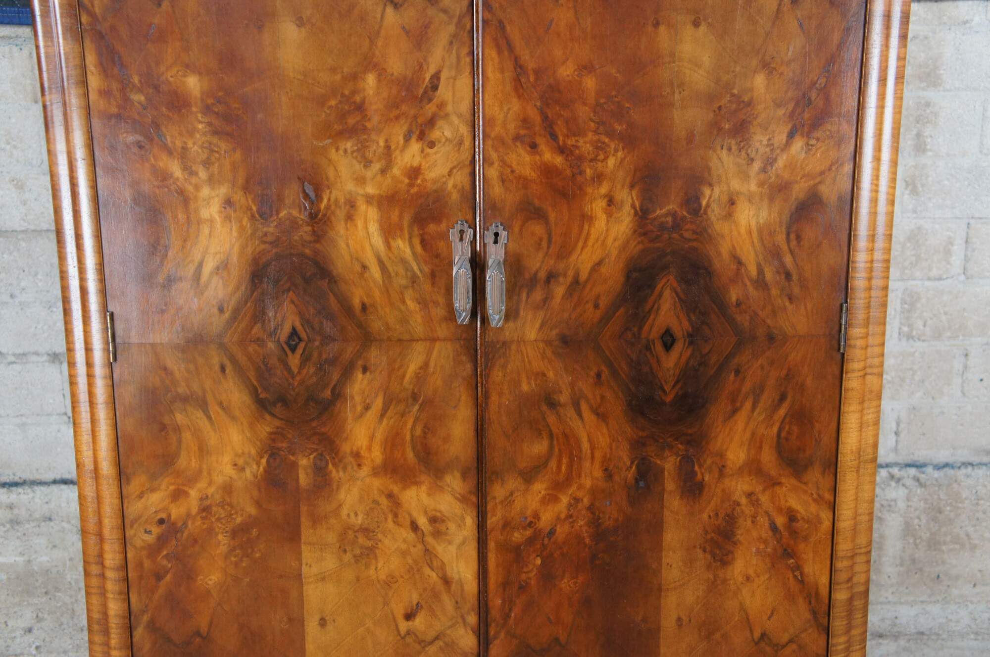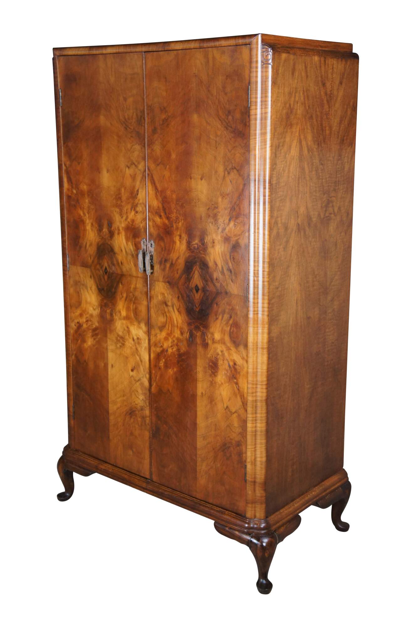 An elegant Art Deco era English wardrobe, circa 1920s. Features two beautifully burled matchbook walnut drawers that open to a spacious interior with room for hanging garments, a long upper shelf and cubbies along the side. The cabinet is accented by carved accents along the outer top corners and has a stepped waterfall edge. The case is raised over short cabriole legs. A charming addition to any space.
