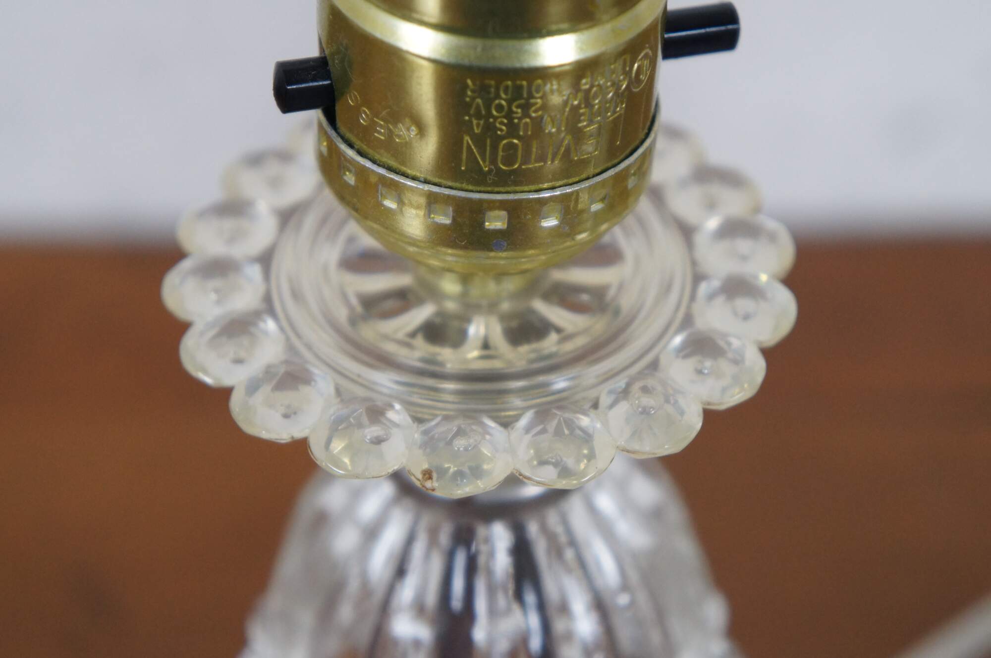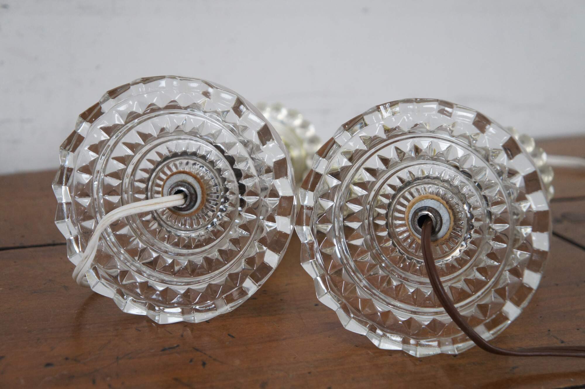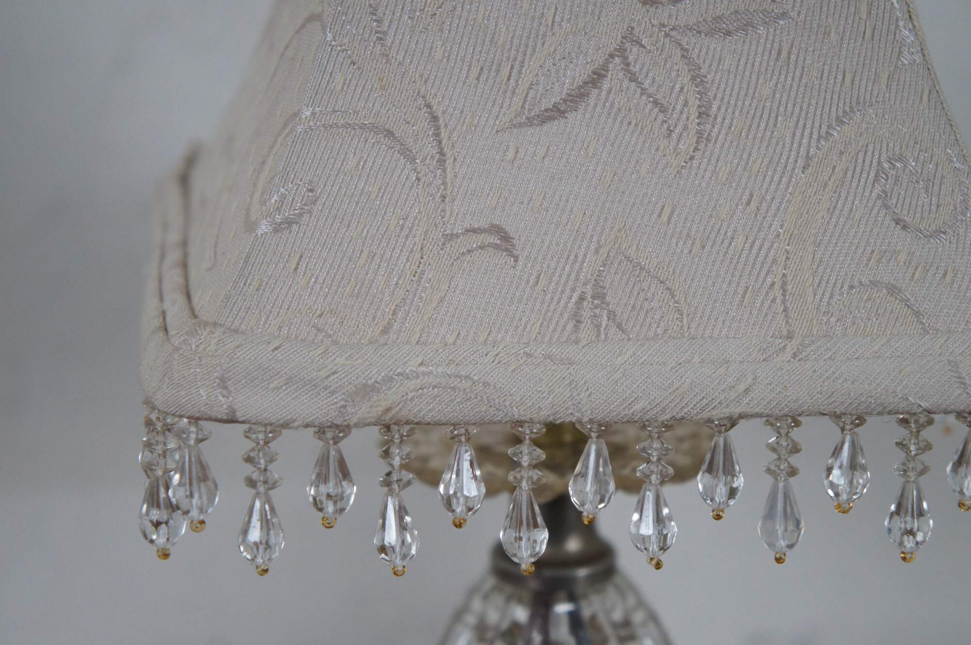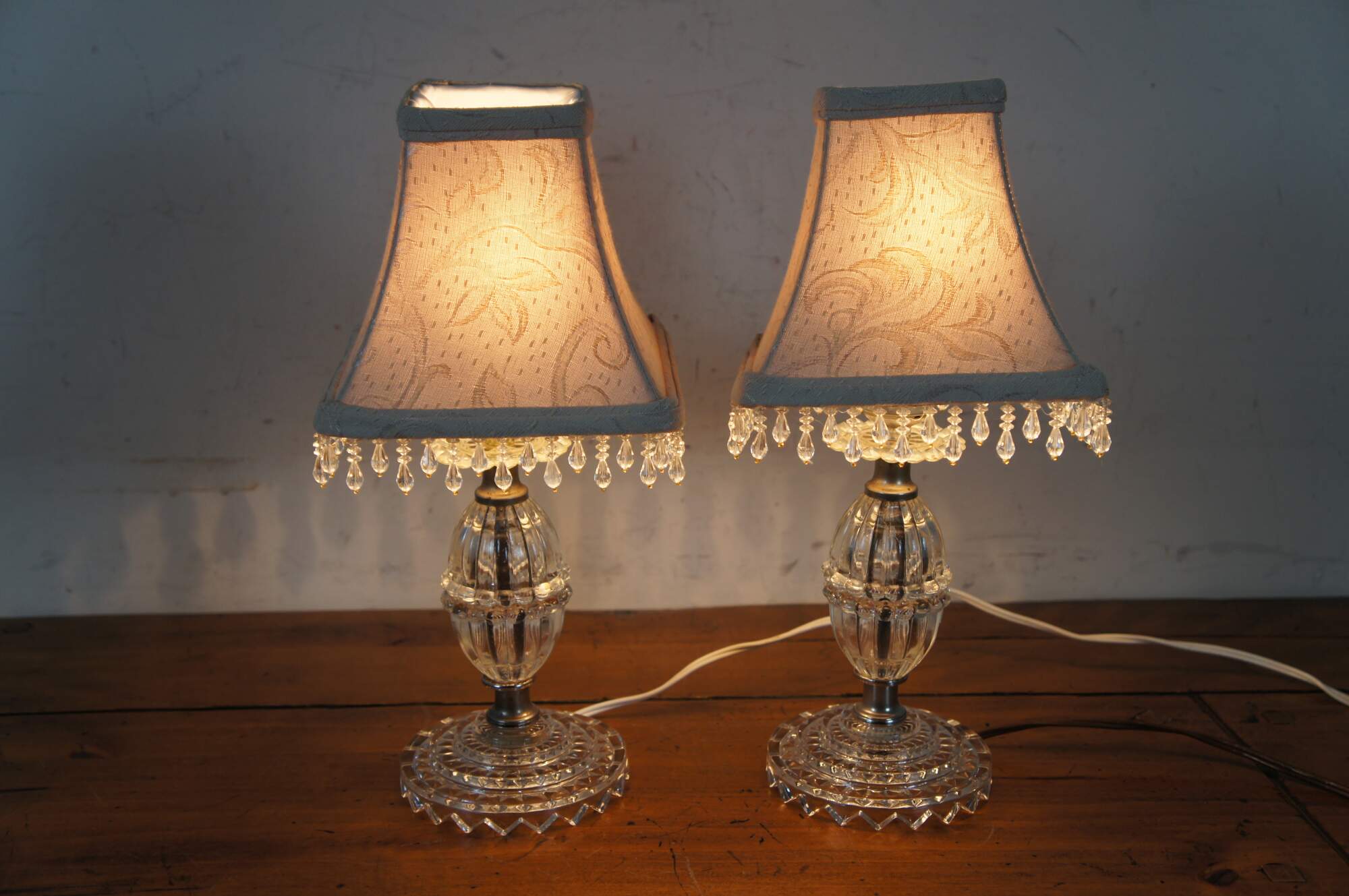 Pair of petite pressed glass Hollywood Regency budoir / table lamps circa mid 20th century, featuring tiered round sawtooth bases, fluted almond shaped body with bubble edge around the middle and topped with a bubble edge “drip catcher.” Lamps include modern, square, ivory brocade shades with beaded drop crystal style trim.