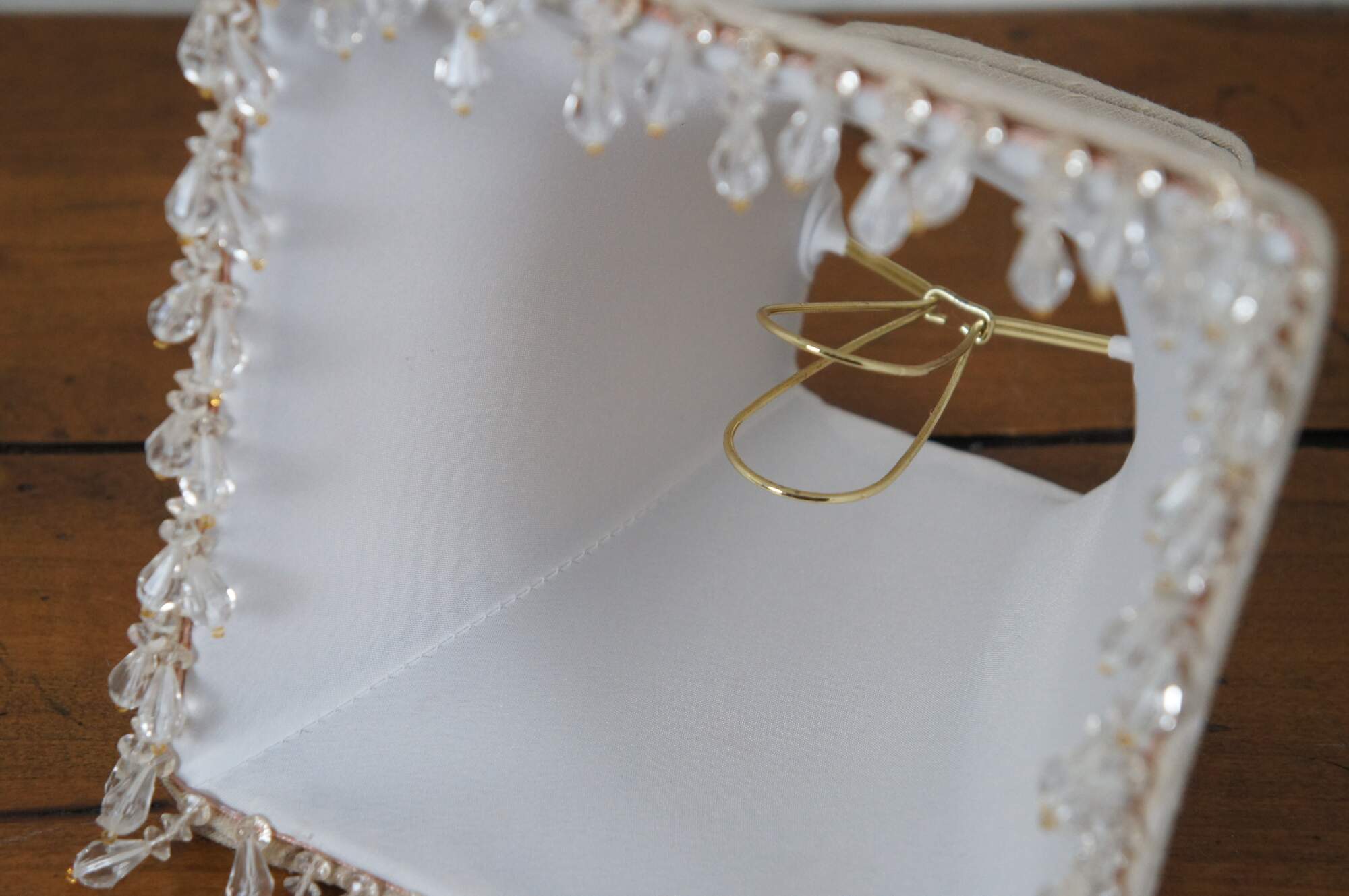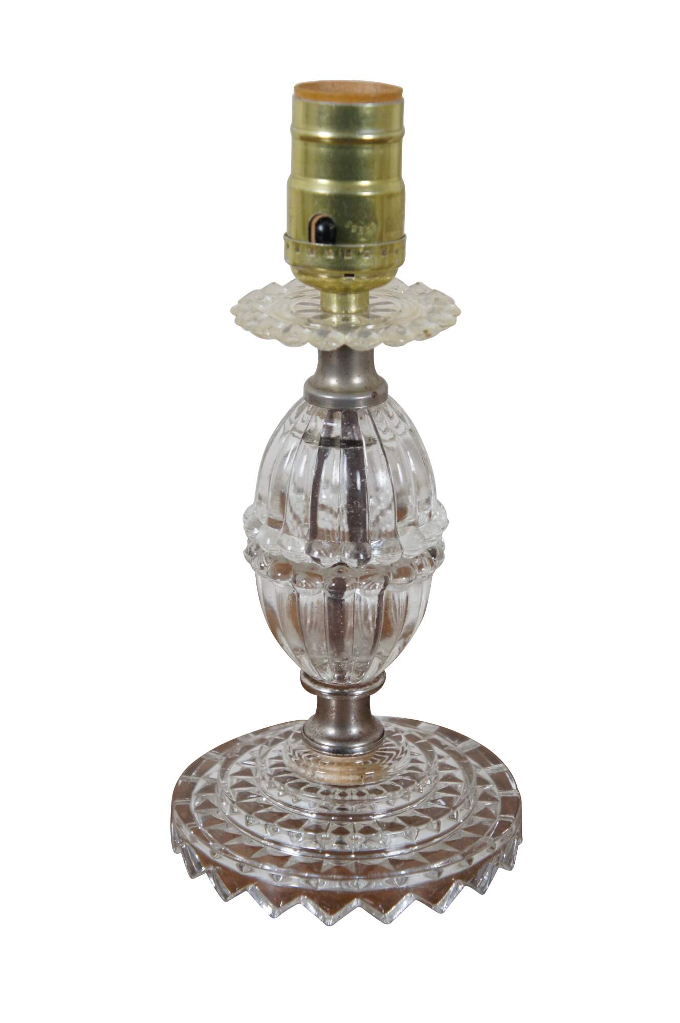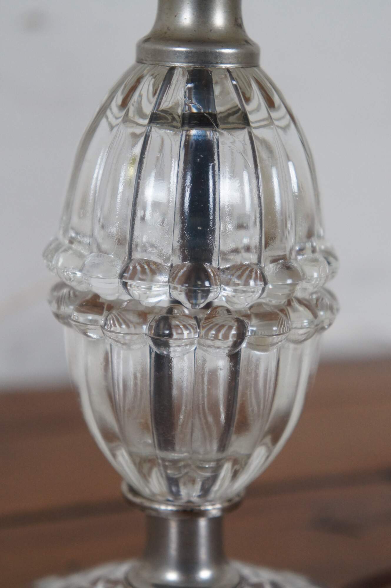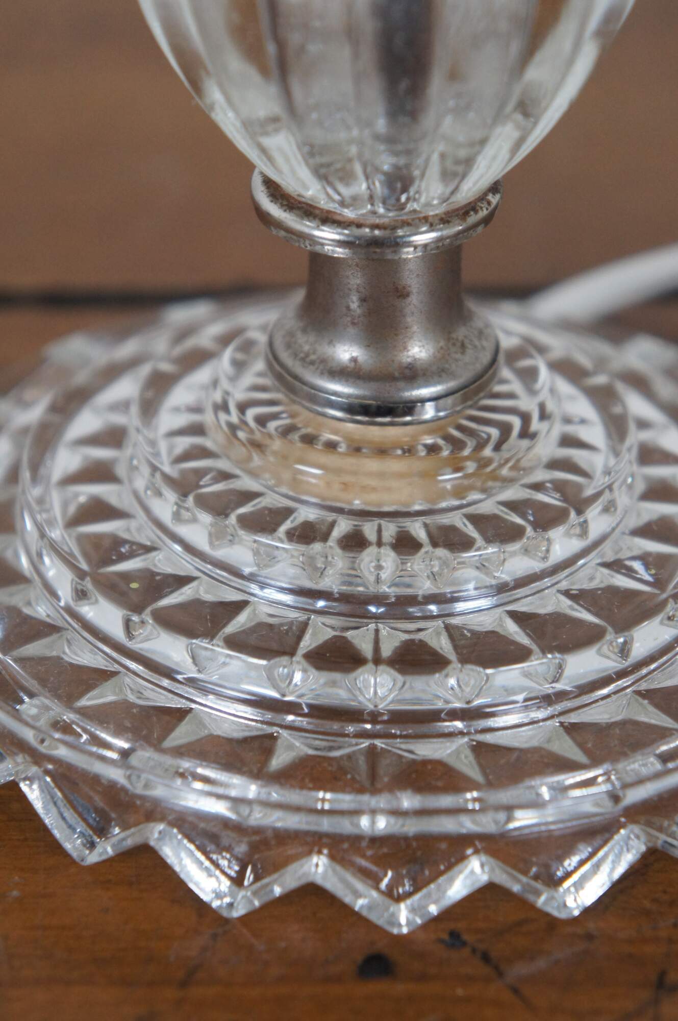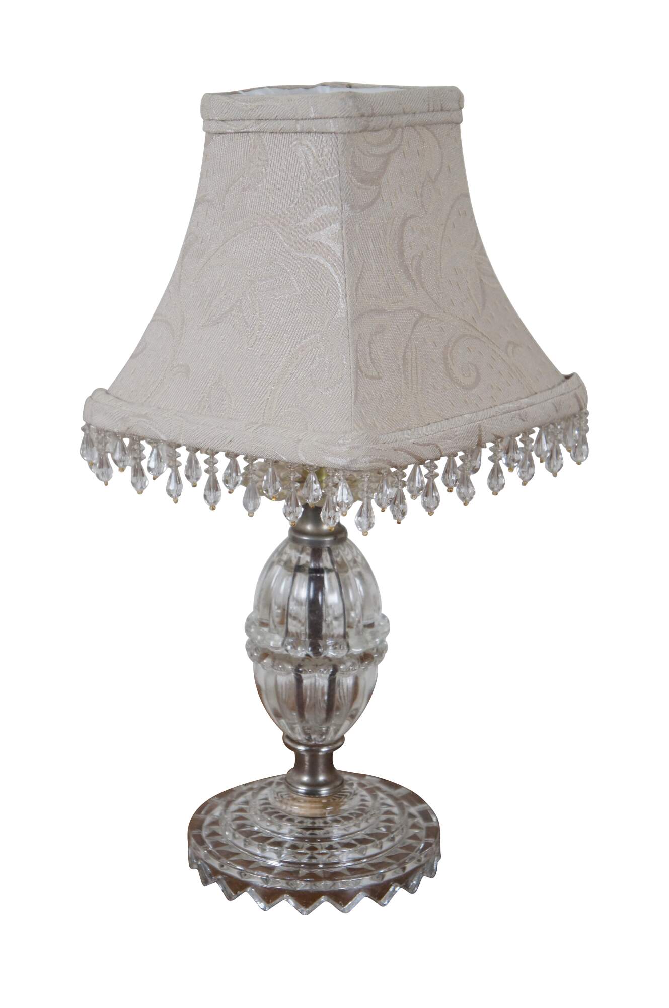 Pair of petite pressed glass Hollywood Regency budoir / table lamps circa mid 20th century, featuring tiered round sawtooth bases, fluted almond shaped body with bubble edge around the middle and topped with a bubble edge “drip catcher.” Lamps include modern, square, ivory brocade shades with beaded drop crystal style trim.