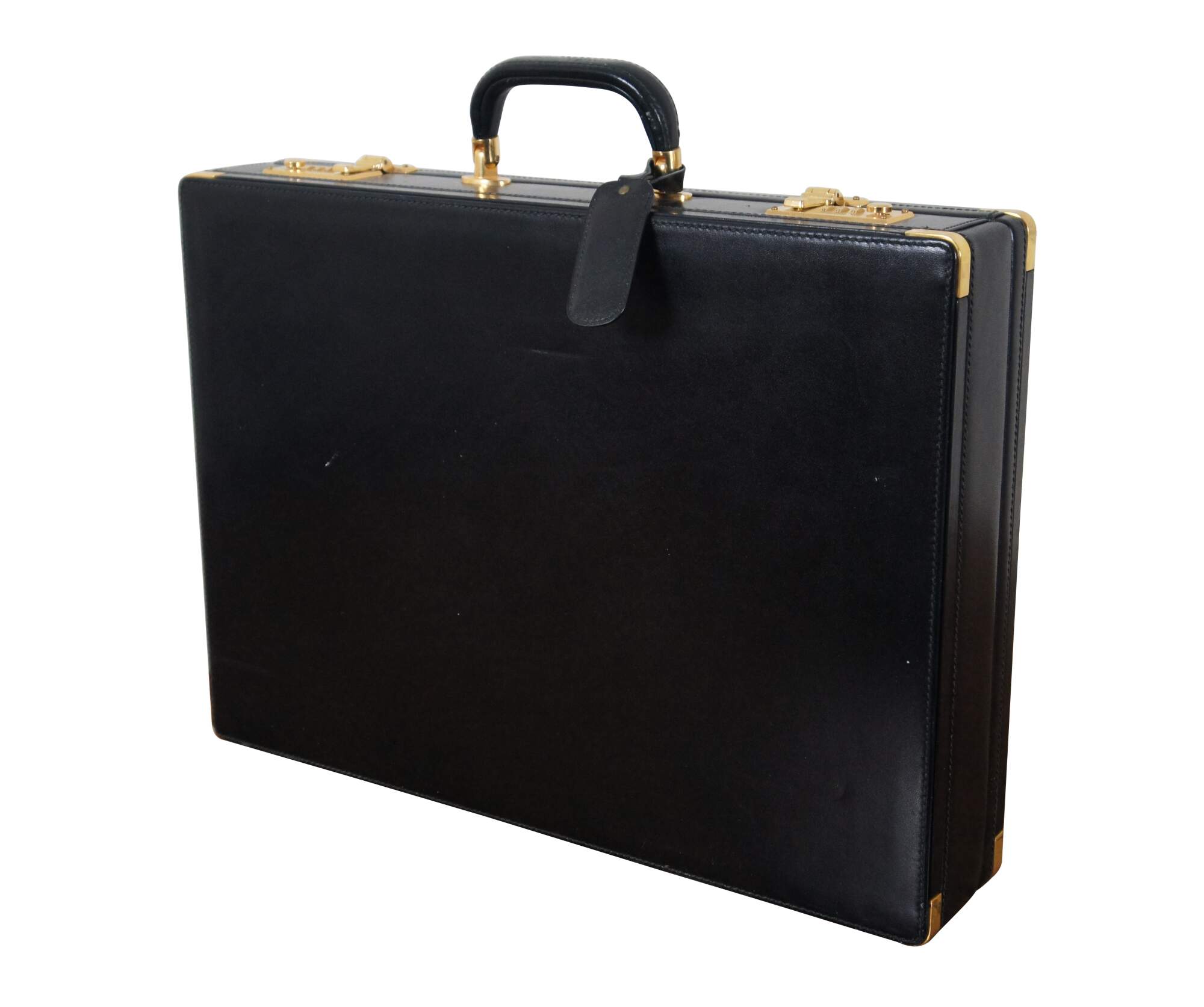 Vintage Bally black leather briefcase. Features single handle, brass feet, capped corners, and double latches with combination locks (currently set at default 000). Interior features beige suede lining, small slip pocket with removable ID card holder, attached wallet with slots for six cards and snap closure, two medium slip pockets, and two document compartments with latching strap. Includes luggage tag. Made in Italy. Original Price $700 circa 1983.