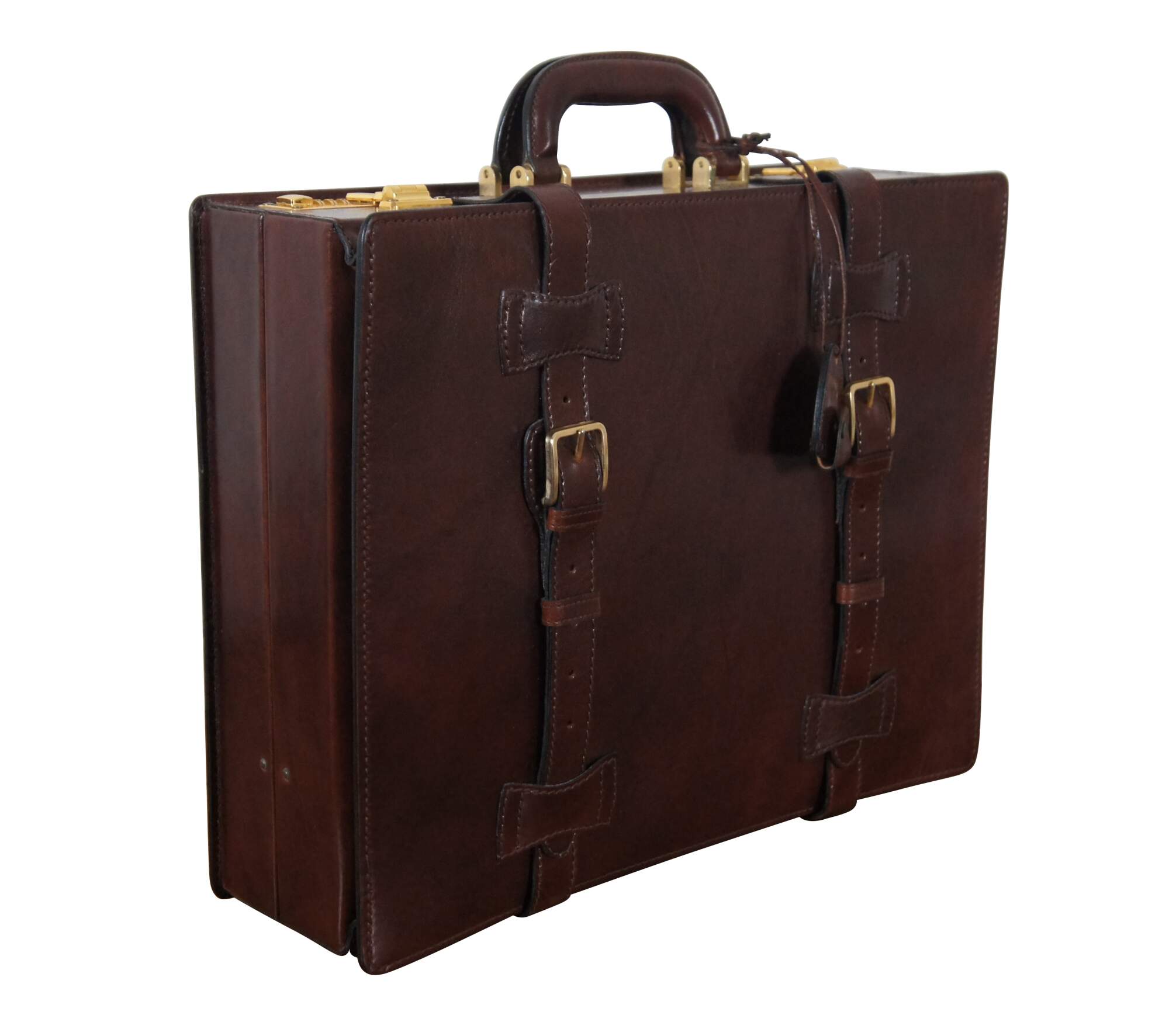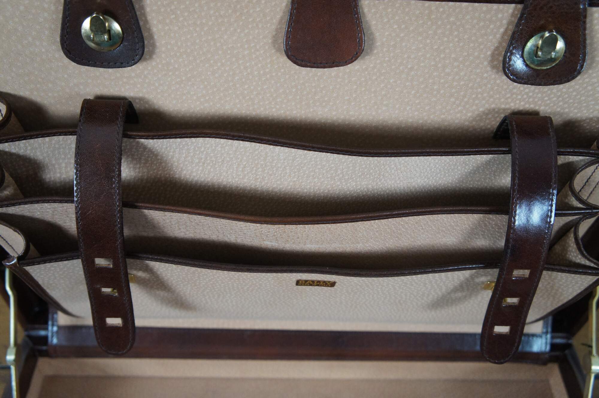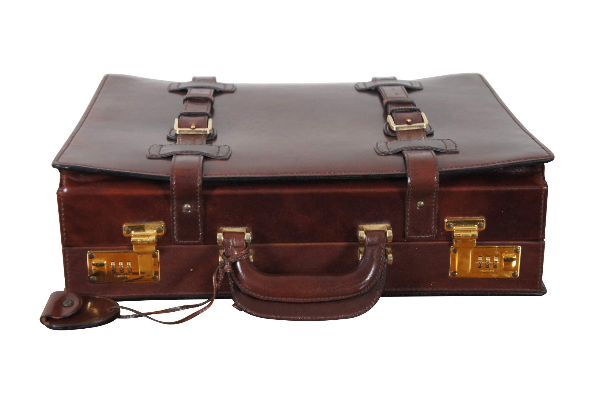Vintage Bally dark brown leather brief case. Features brass feet, expandable front with two decorative buckle straps, and double latches with Presto combination locks (currently set to default combination 000). Interior features beige / off white suede ostrich leather lining, three slip pockets with adjustable latching straps, and a flip down expandable compartment with latching strap. Includes luggage tag / coin purse with snap closure and dust bag. Made in Italy. Original Price $475.