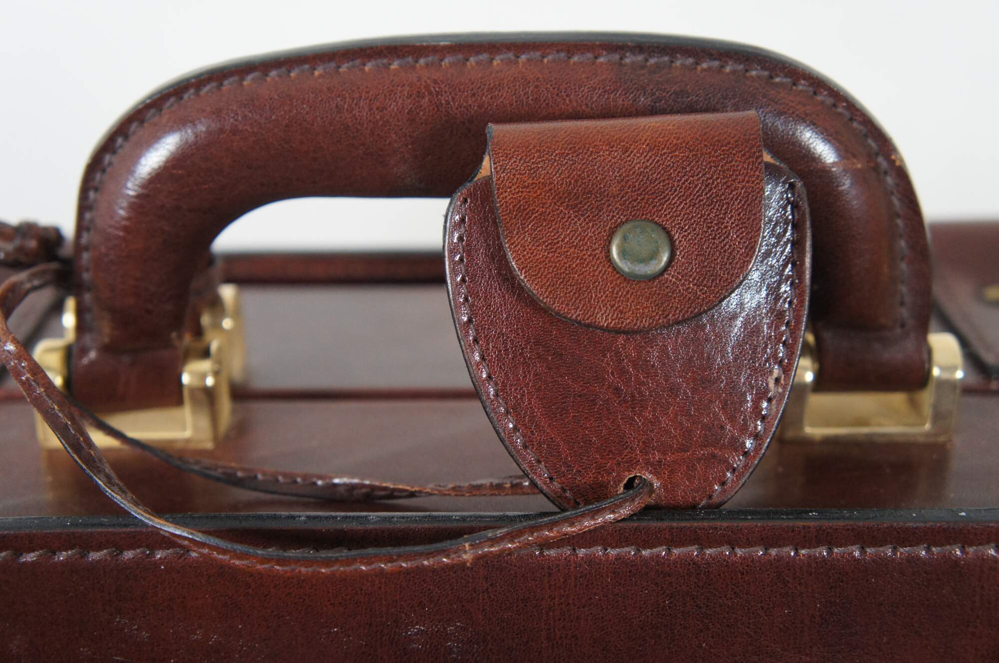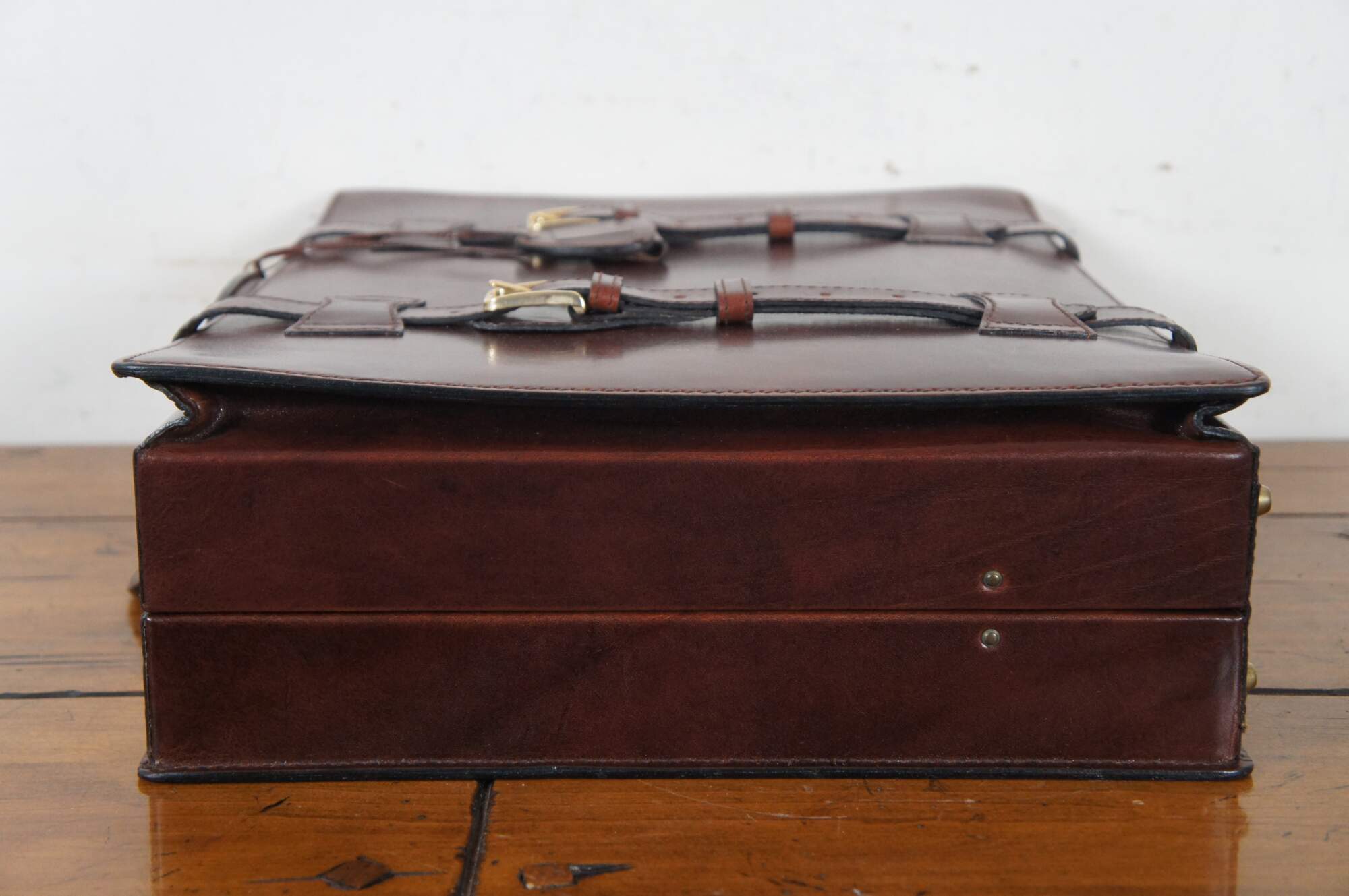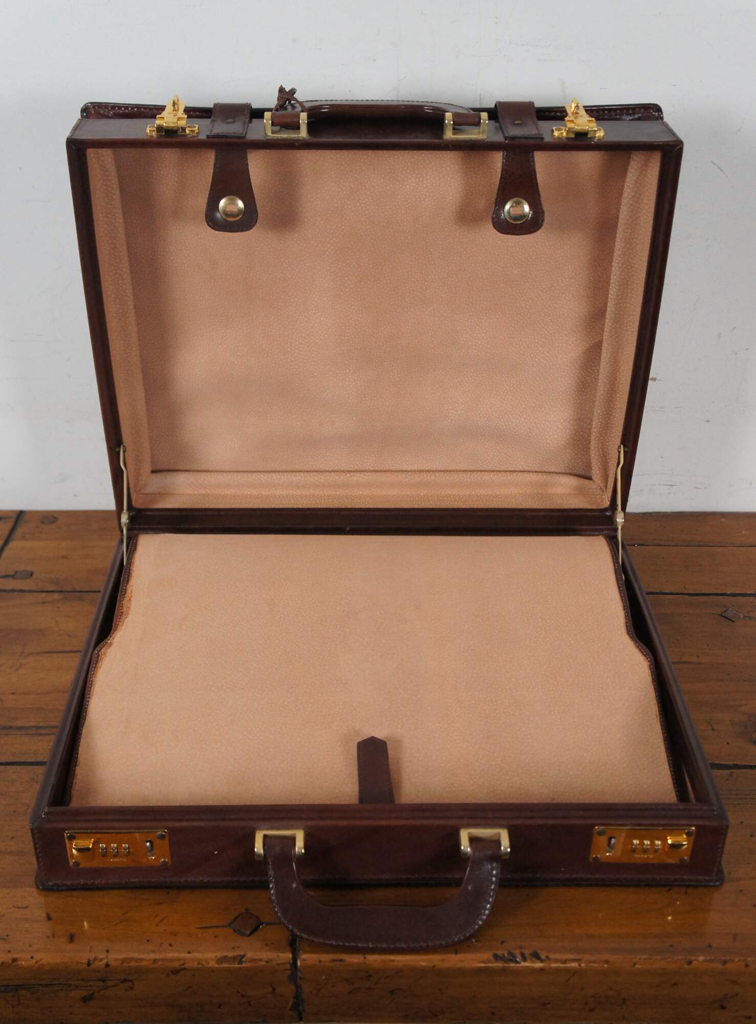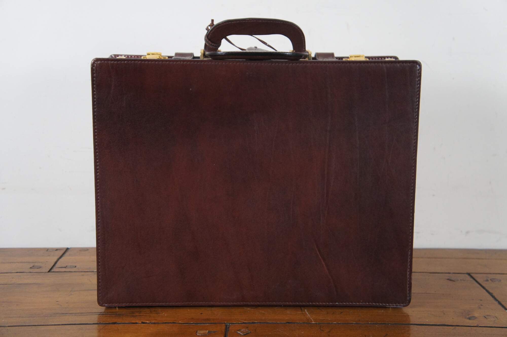 Vintage Bally dark brown leather brief case. Features brass feet, expandable front with two decorative buckle straps, and double latches with Presto combination locks (currently set to default combination 000). Interior features beige / off white suede ostrich leather lining, three slip pockets with adjustable latching straps, and a flip down expandable compartment with latching strap. Includes luggage tag / coin purse with snap closure and dust bag. Made in Italy. Original Price $475.