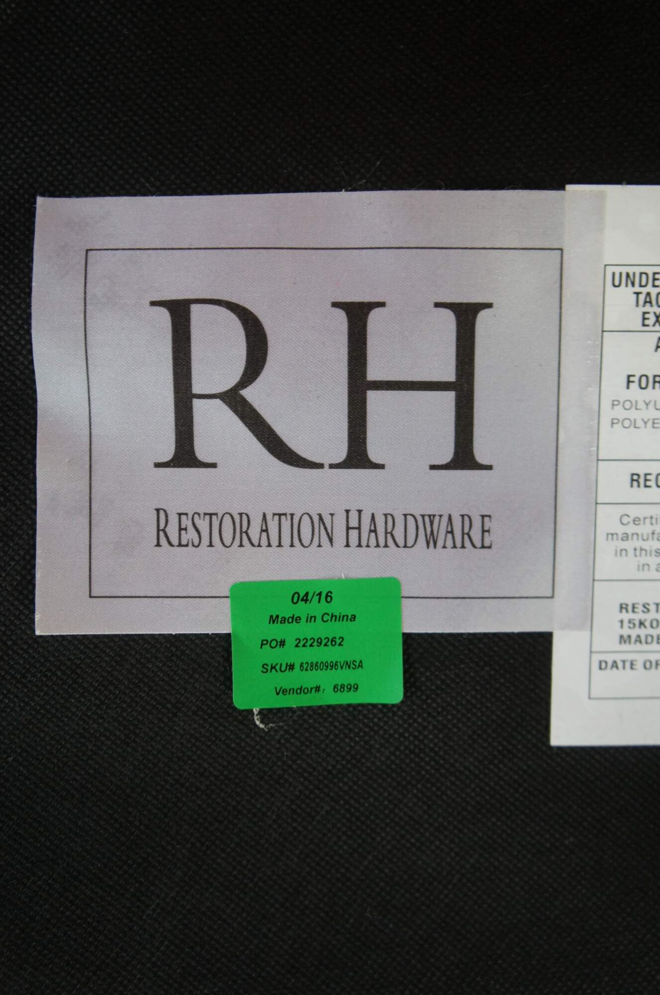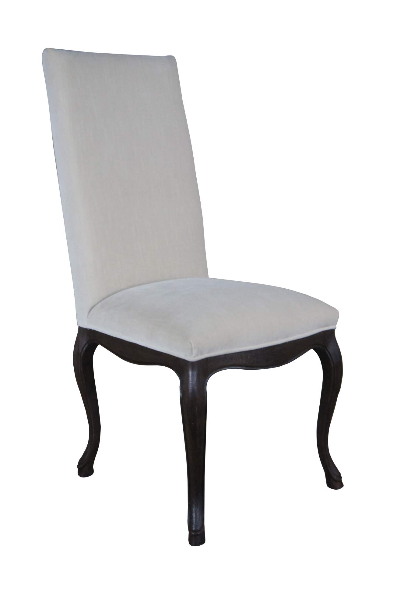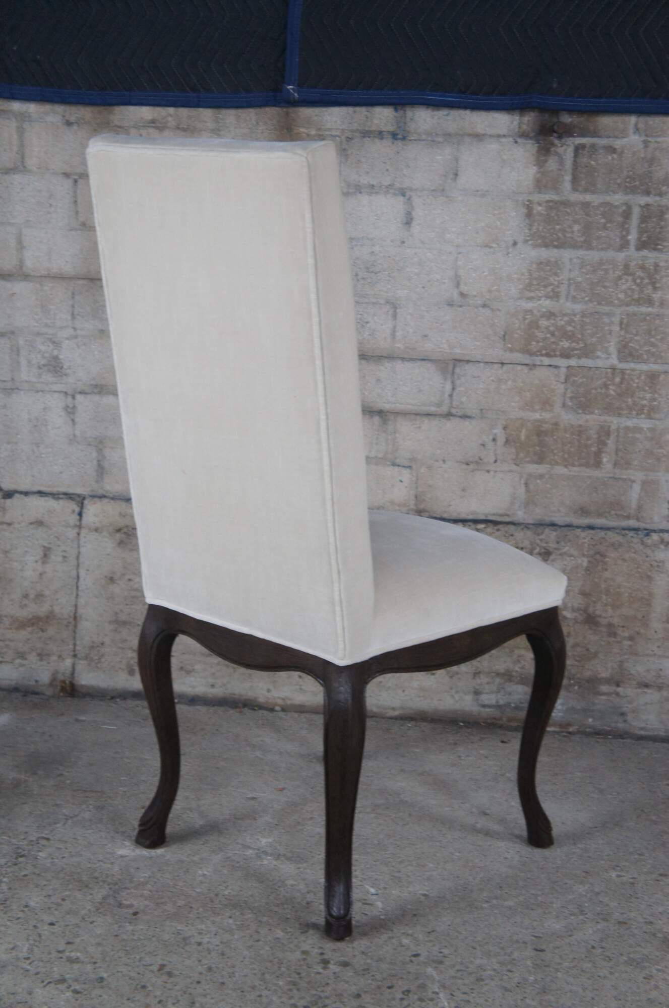 Ten Restoration Hardware French Louis XVI style dining chairs. Features a square back with velour / velvet upholstery and serpentine cabriole legs with hoof foot.