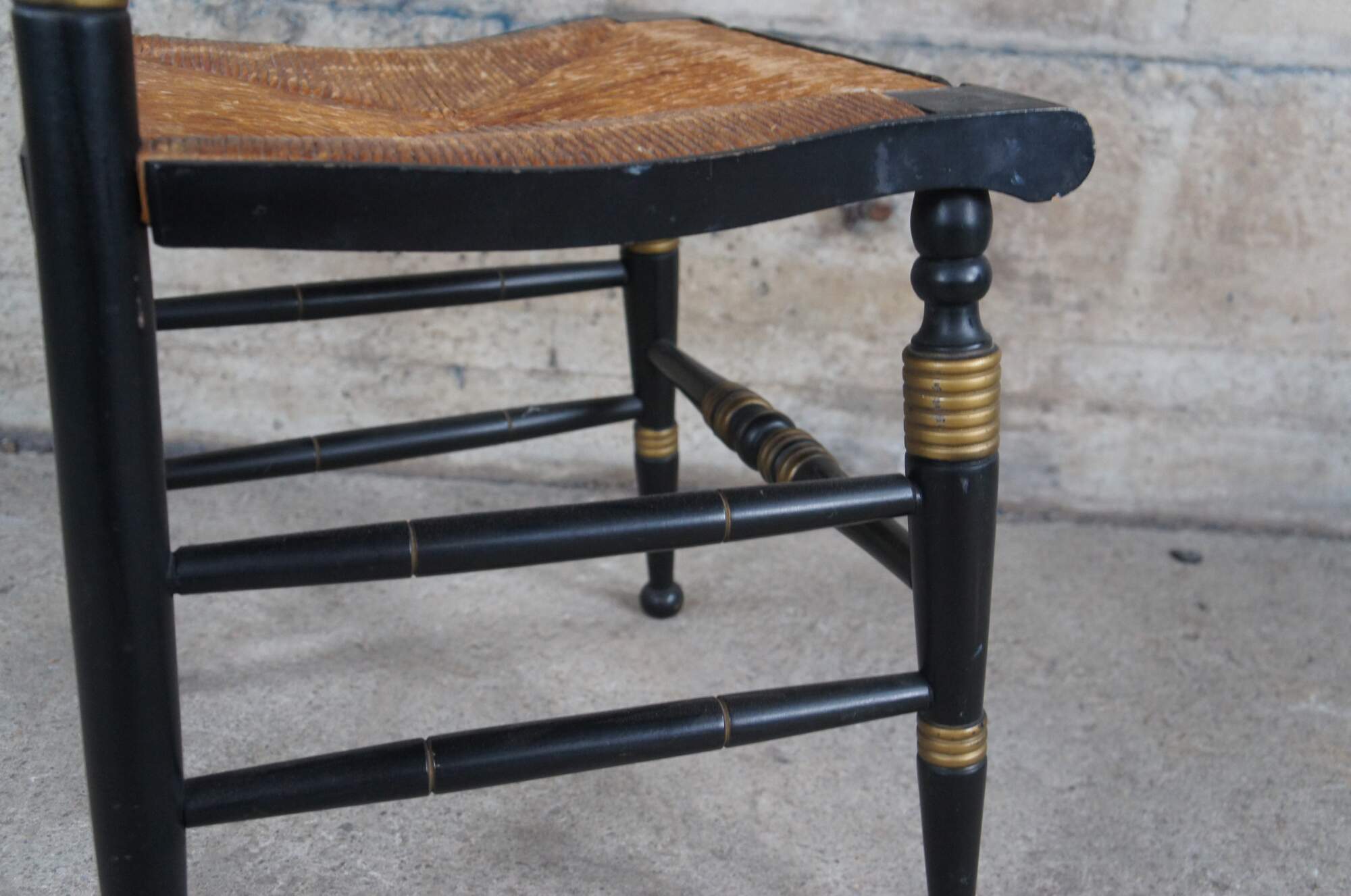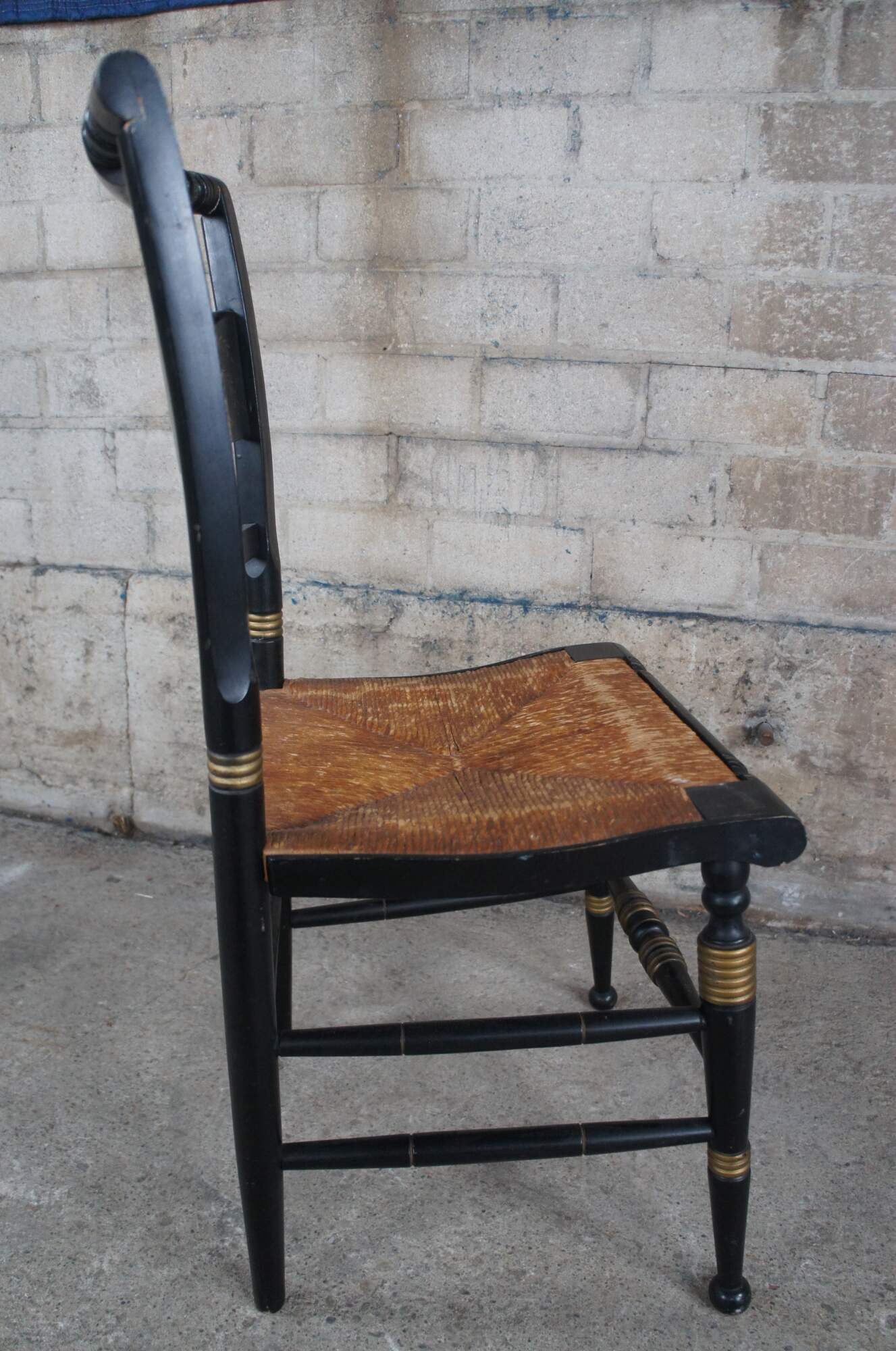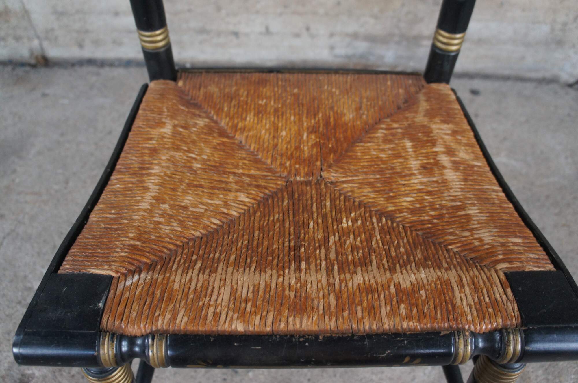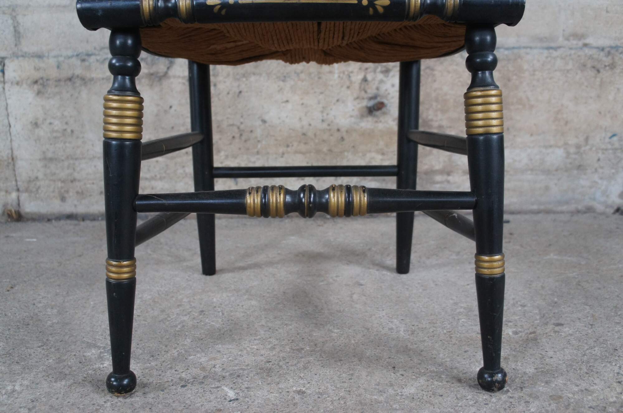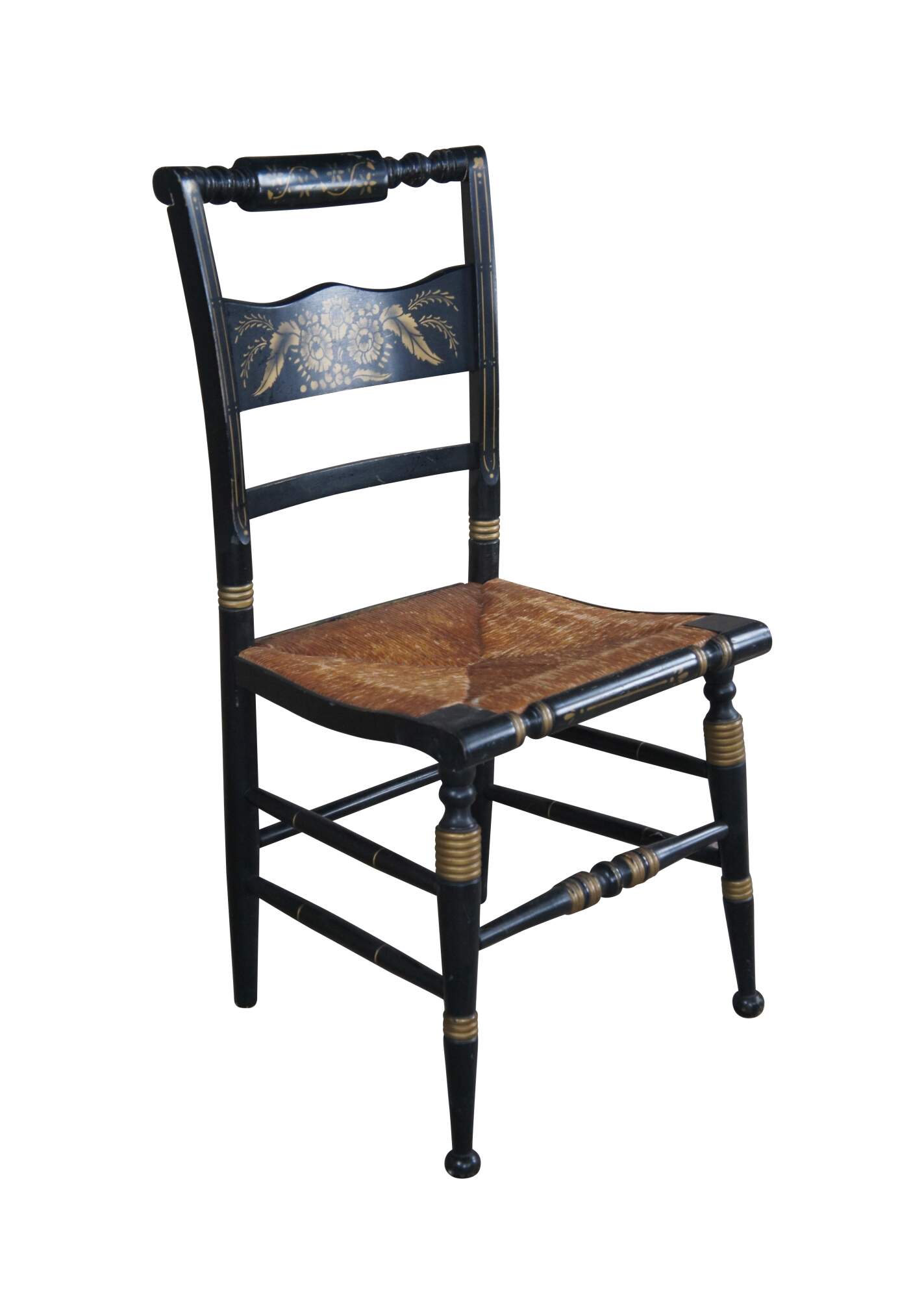 A turn of the 20th century Hitchcock stenciled farmhouse chair. Features a floral berry and leaf / foliate design, ribbed accents and rush seat.