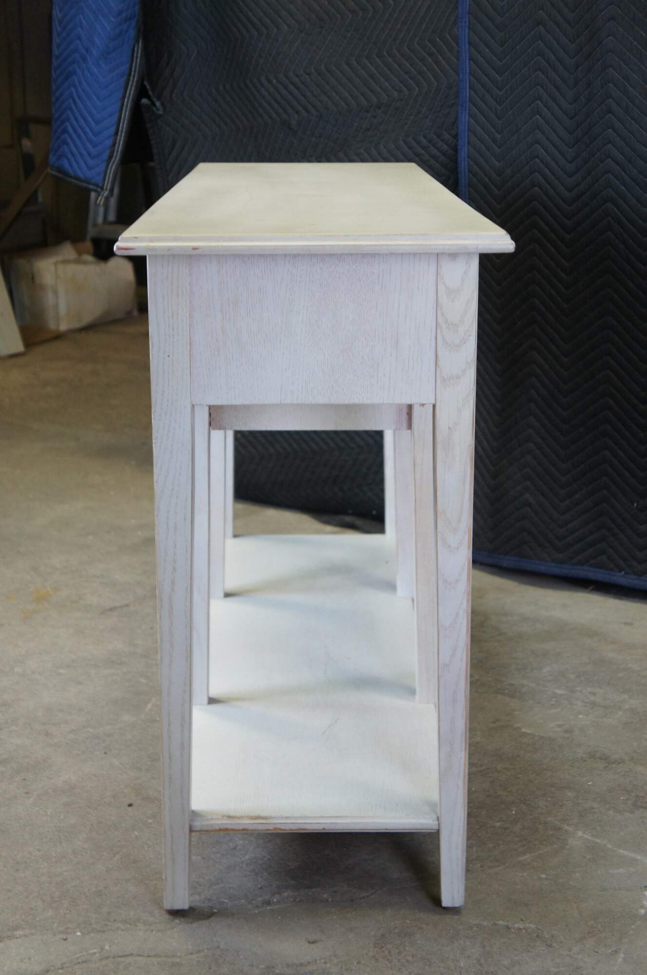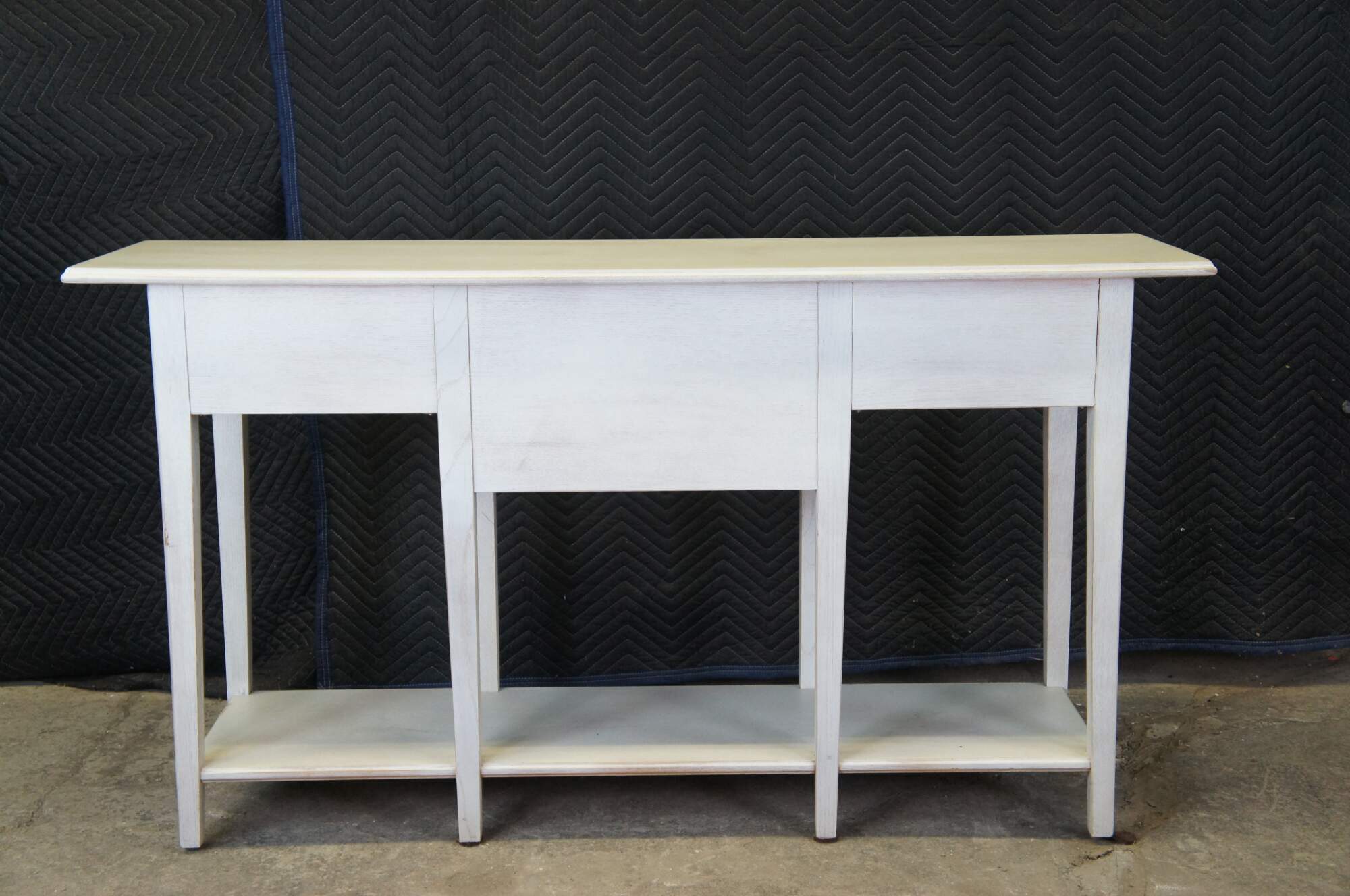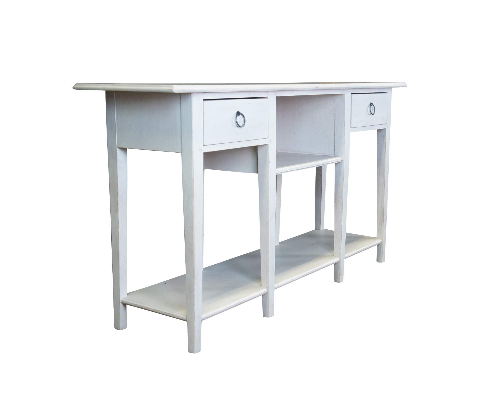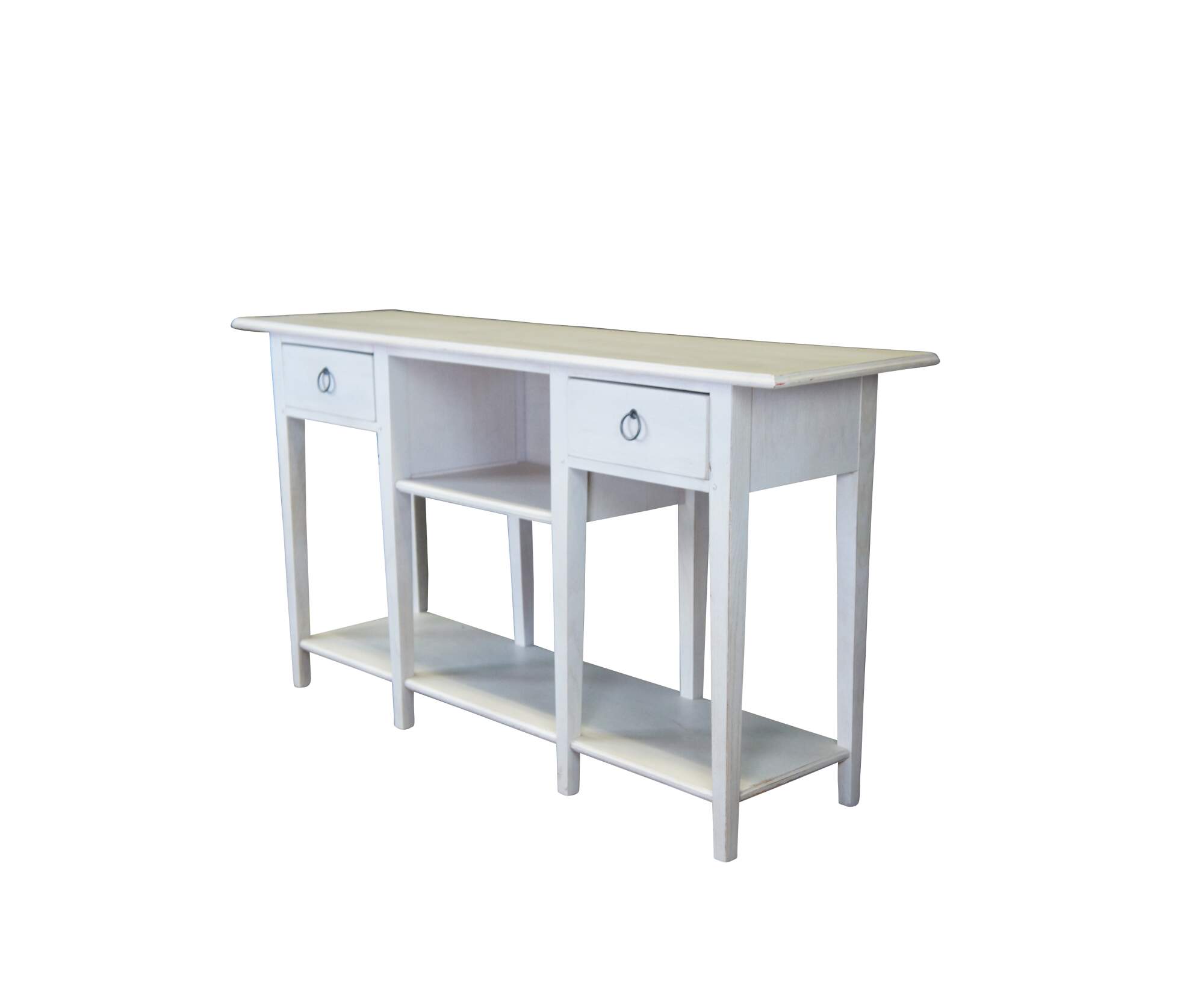 Lexington Furniture console or sofa table. Made from oak with a white painted finish. Features a rectangular top over a central cubby flanked by two dovetailed drawers, long lapered legs and lower shelf for accessory storage. Includes metal knocker style drawer pulls.