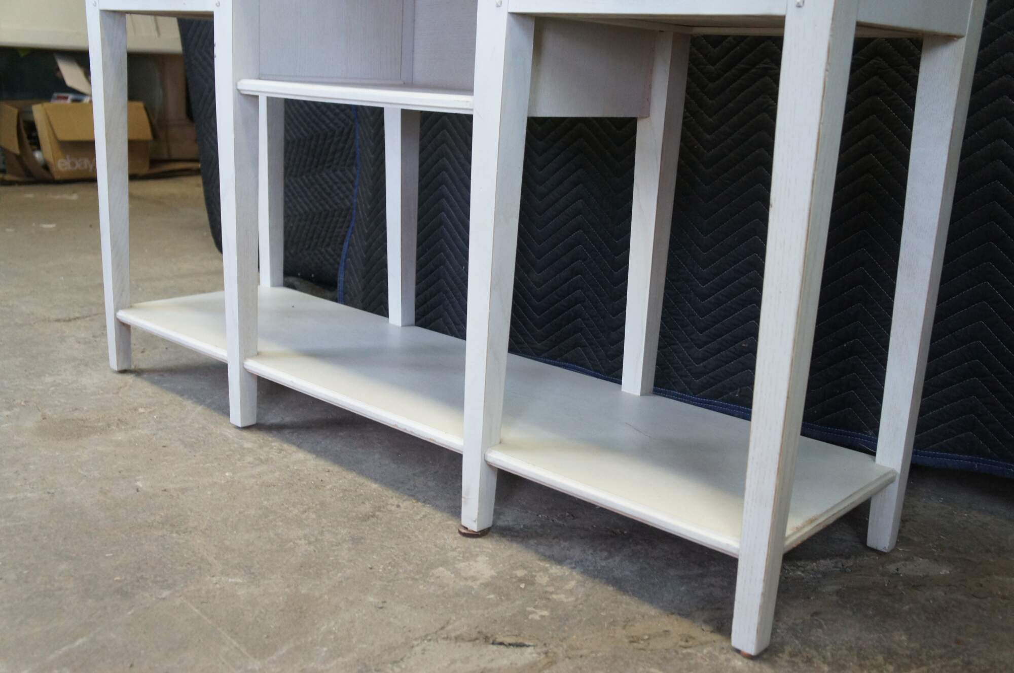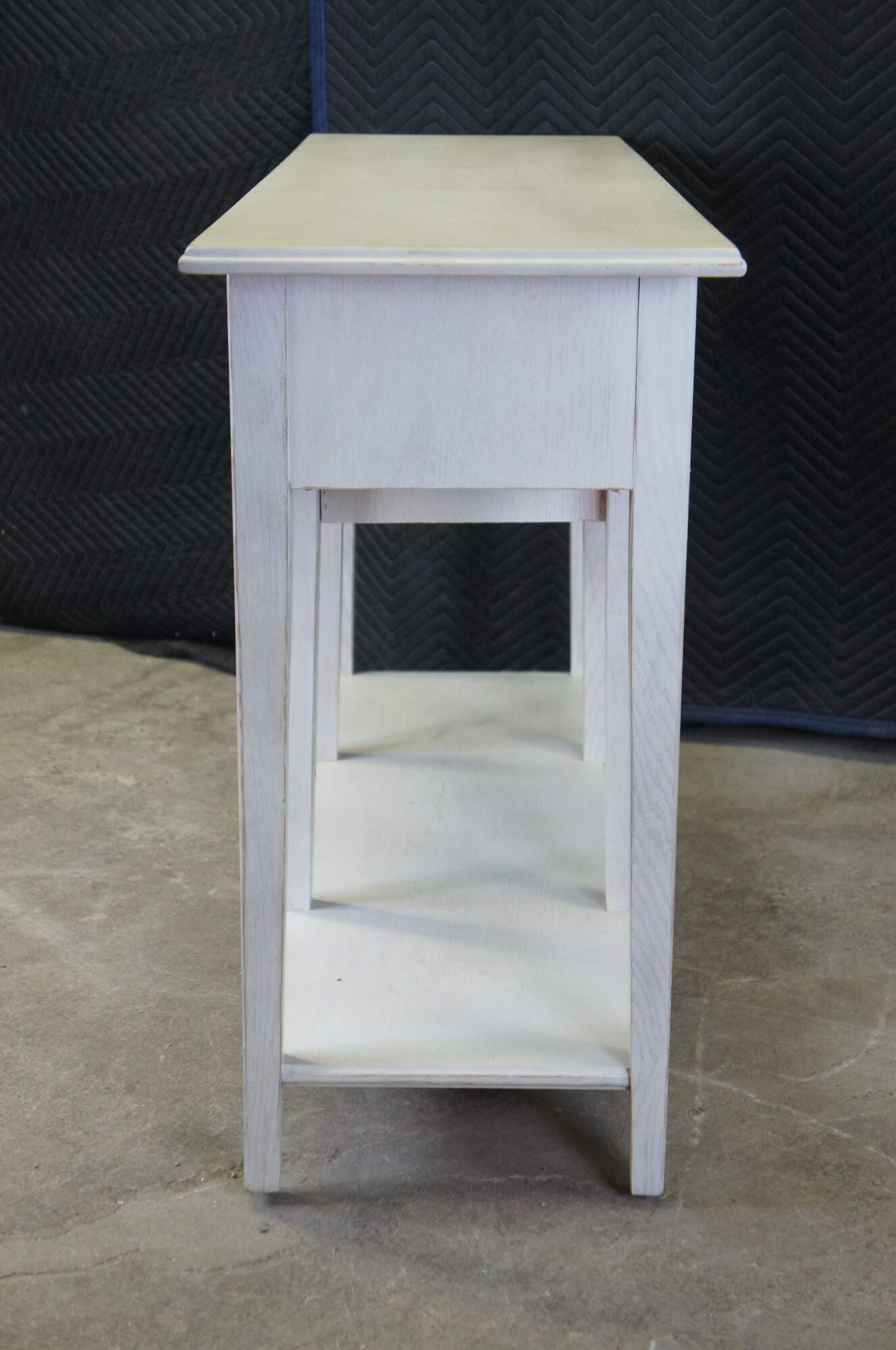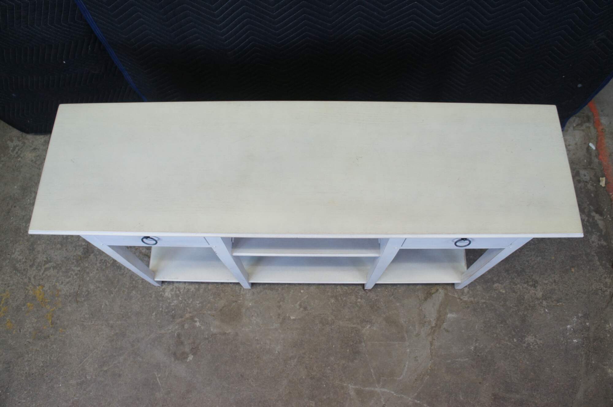 Lexington Furniture console or sofa table. Made from oak with a white painted finish. Features a rectangular top over a central cubby flanked by two dovetailed drawers, long lapered legs and lower shelf for accessory storage. Includes metal knocker style drawer pulls.