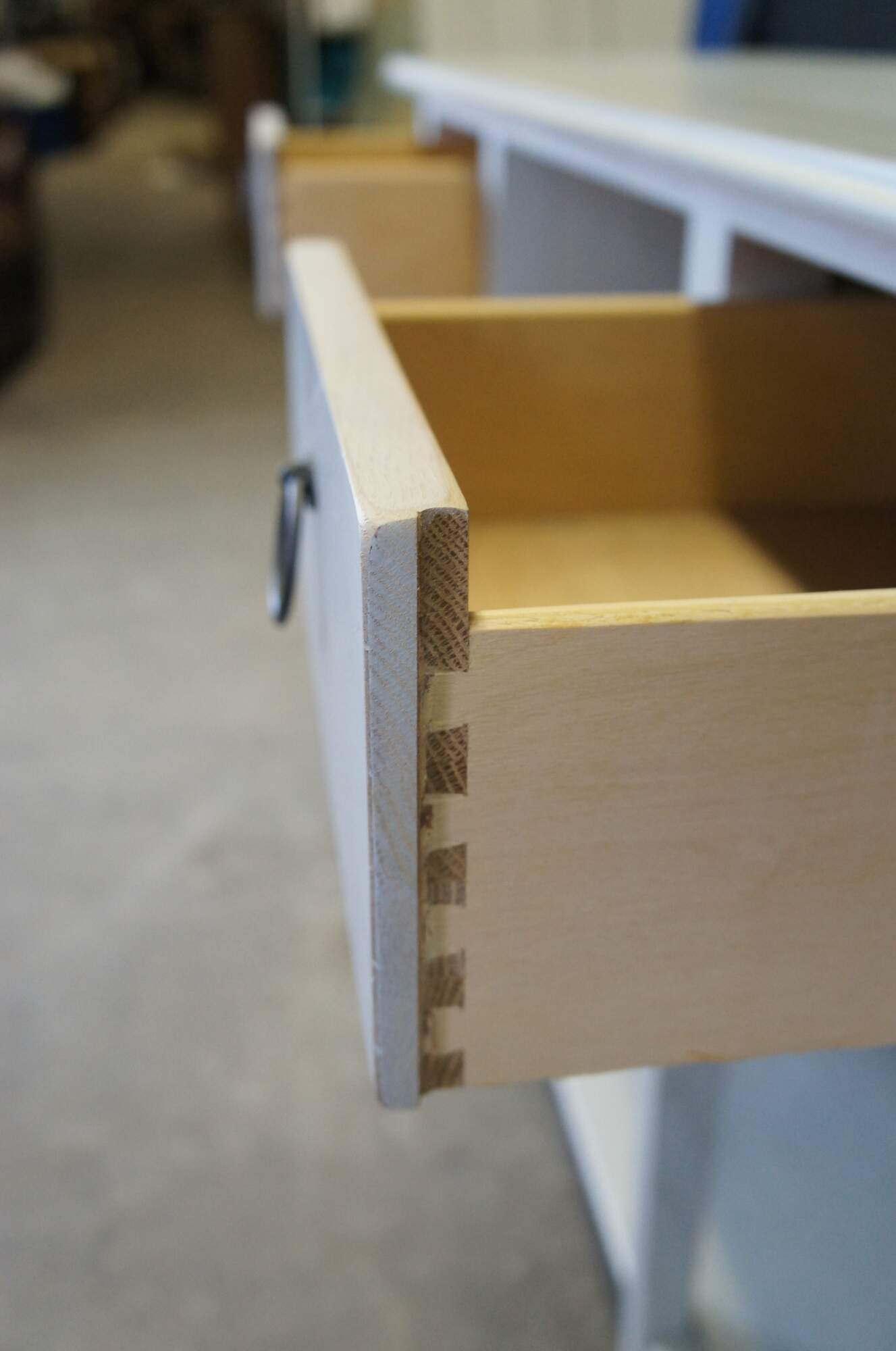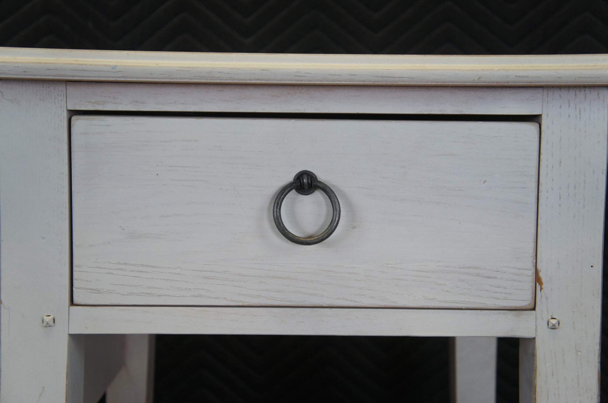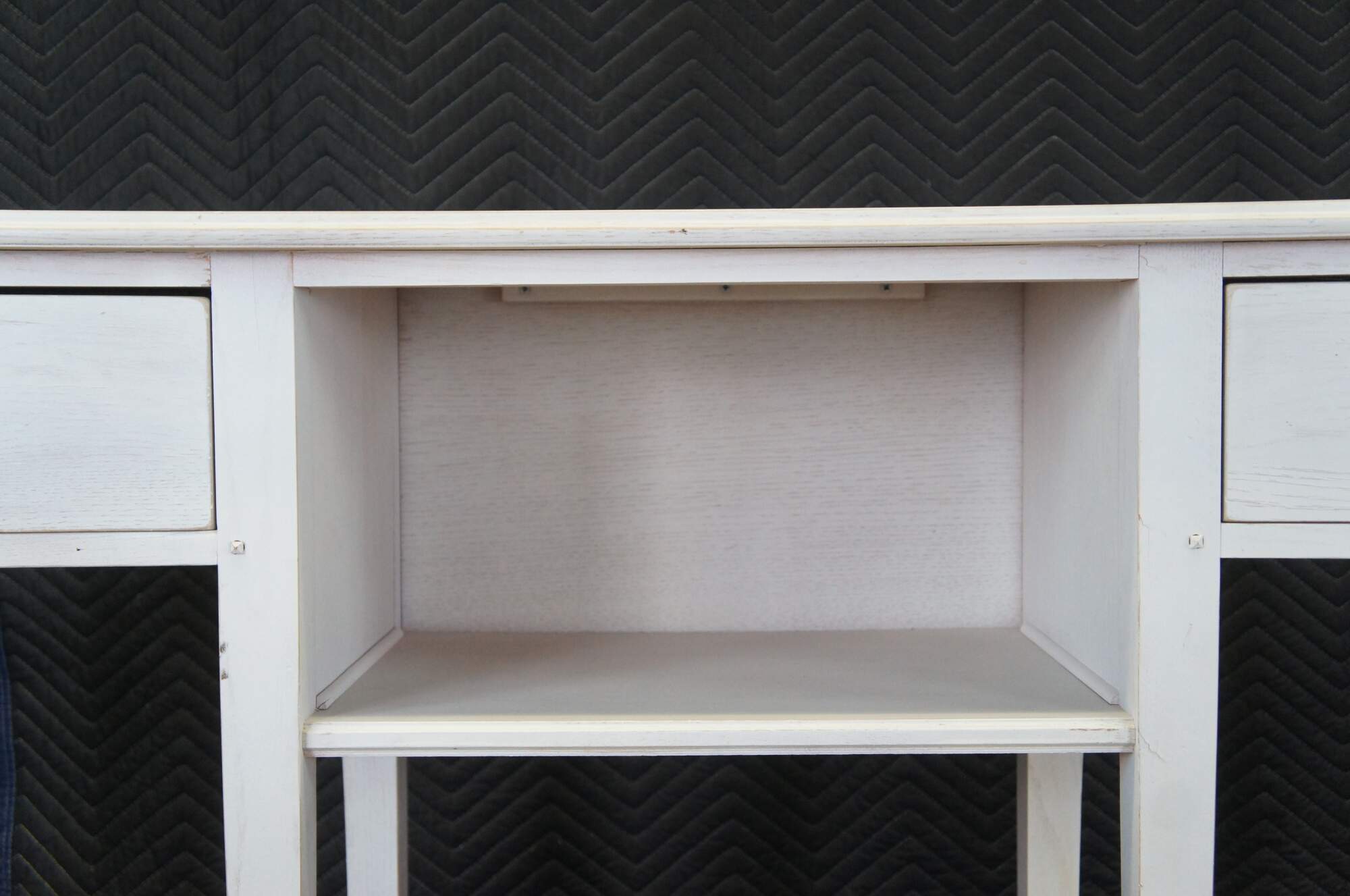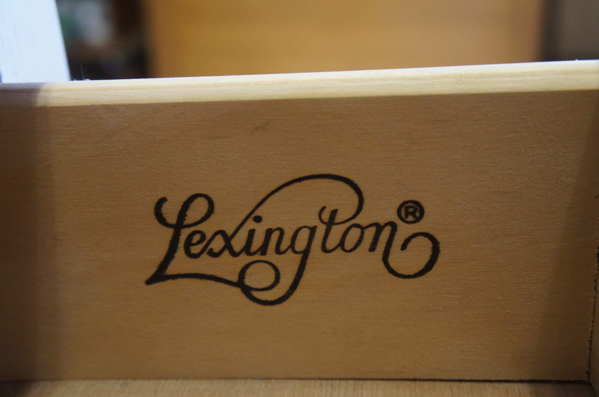 Lexington Furniture console or sofa table. Made from oak with a white painted finish. Features a rectangular top over a central cubby flanked by two dovetailed drawers, long lapered legs and lower shelf for accessory storage. Includes metal knocker style drawer pulls.