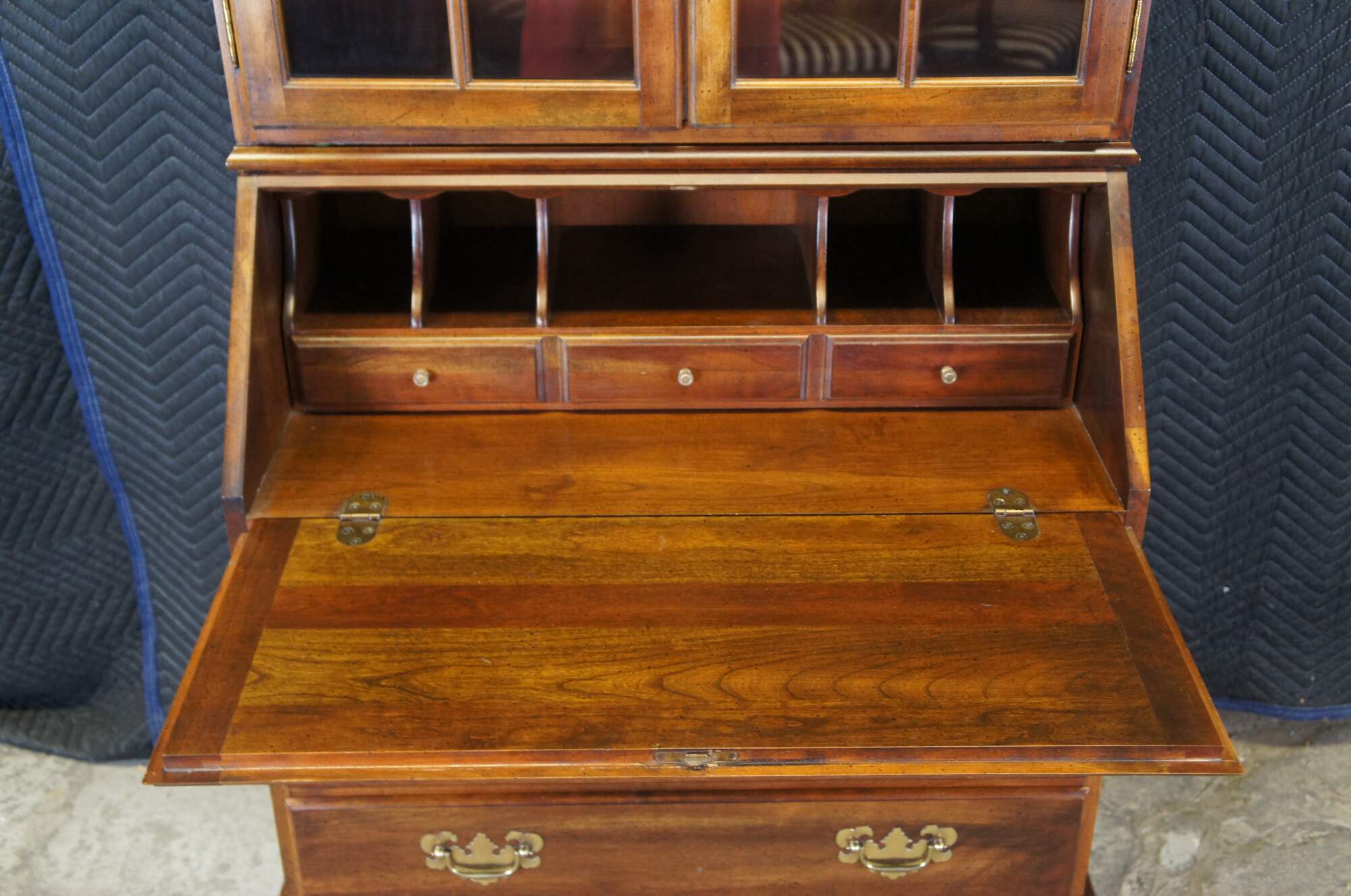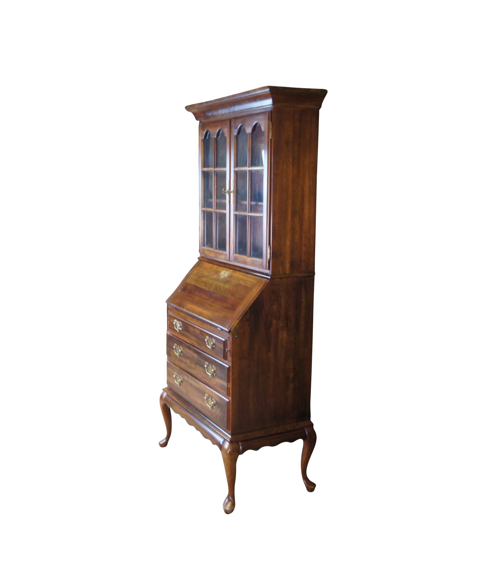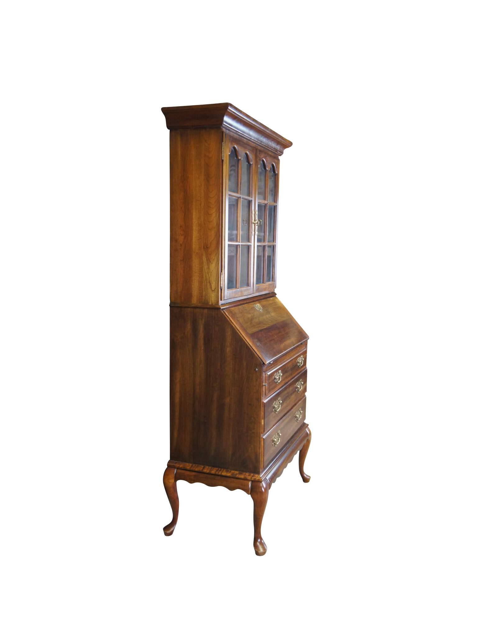 Beautiful Queen Anne style secretary desk and bookcase by Cresent Manufacturing Company, circa 1970s. Made from cherry with a natural distressed finish. Features an upper bookcase with two shelves and lattice covered glass doors with an arched arcade along the top. The drop front opens two one large drawer and pigeon holes. Base has three graduated dovetailed drawers. The cabinet is supported by cabriole legs. Colonial brass batwing hardware fiited to drawers and desk lid.