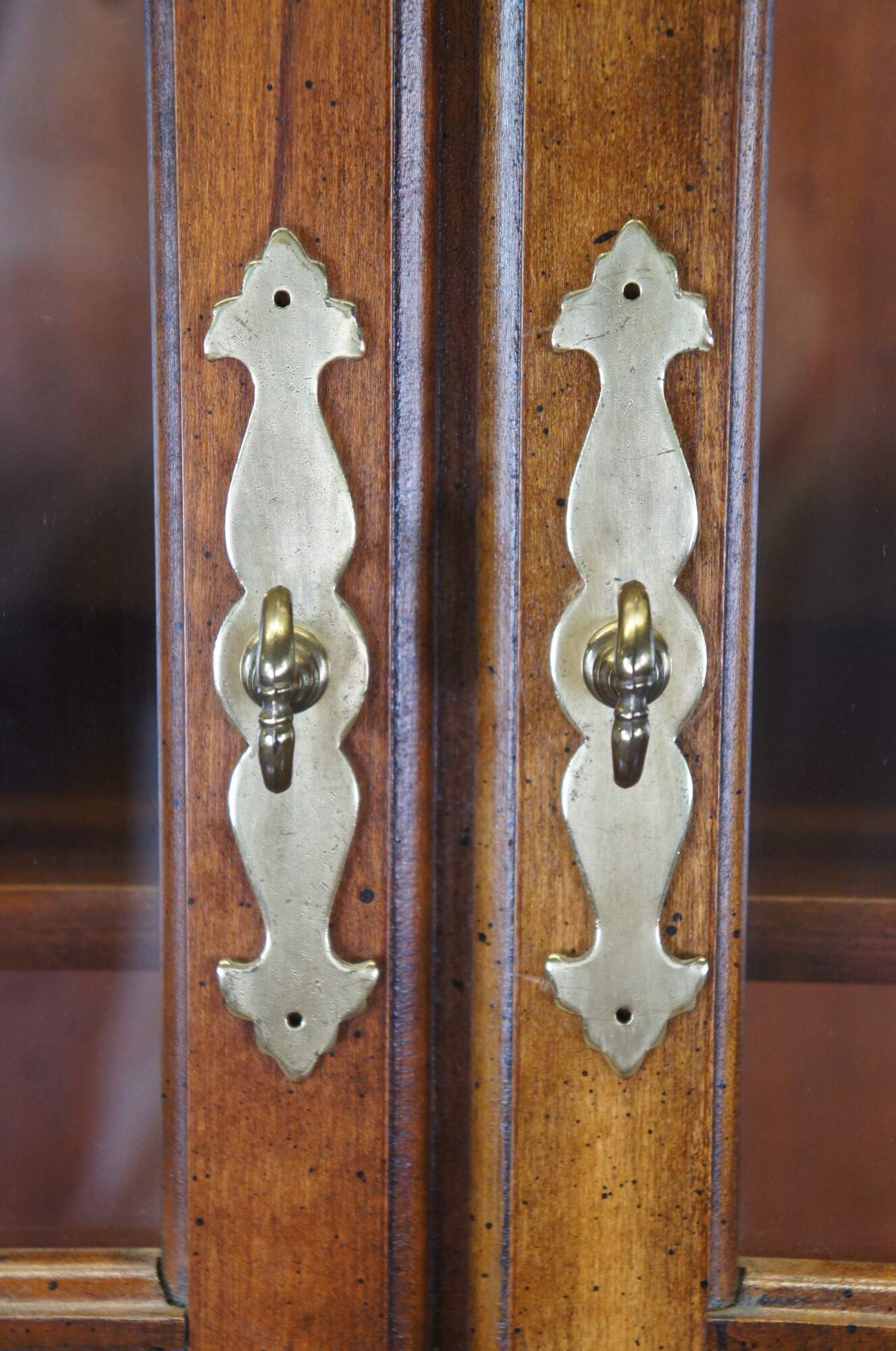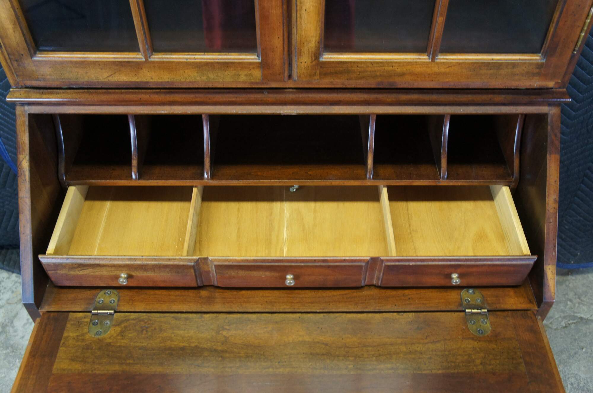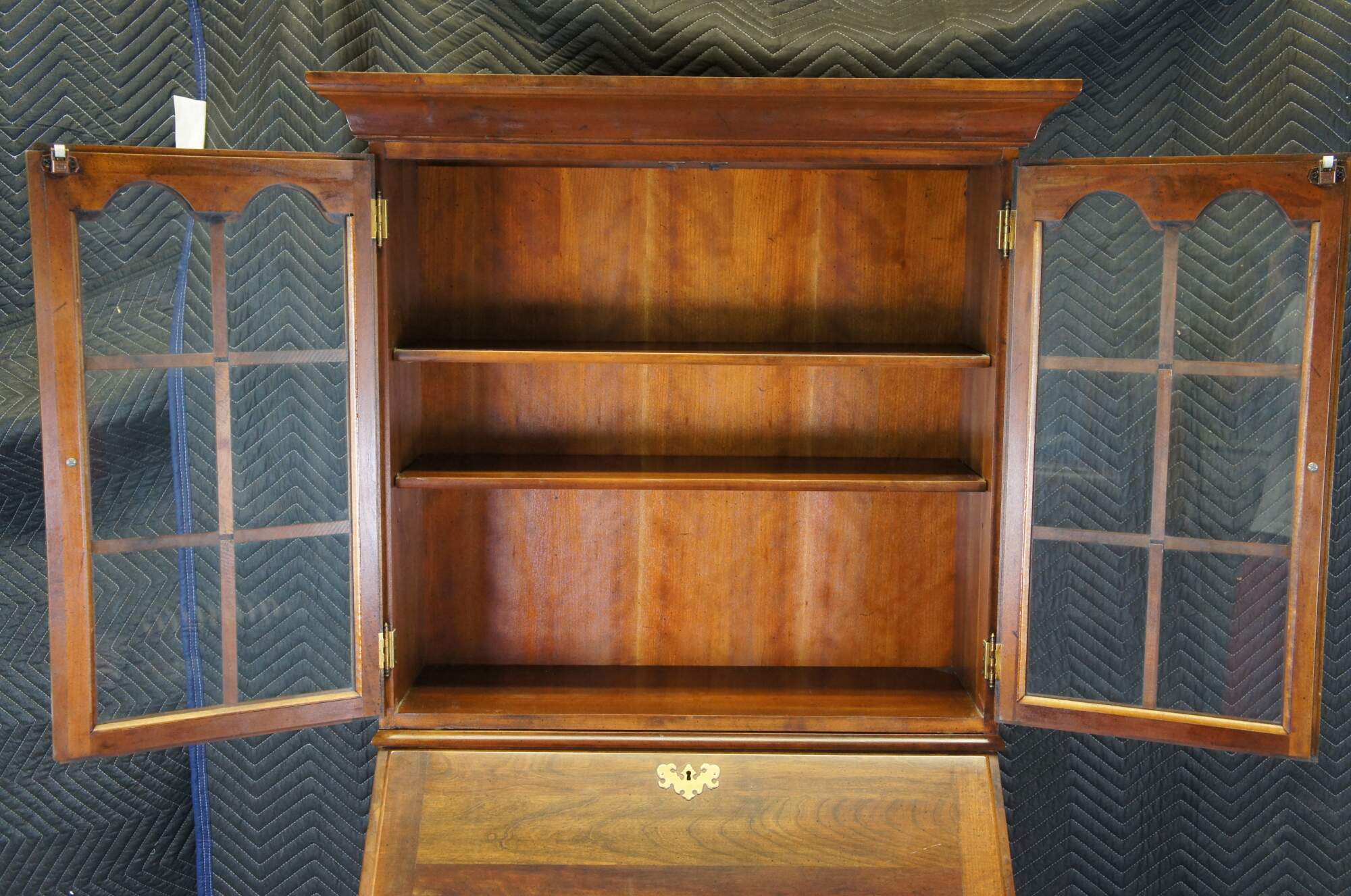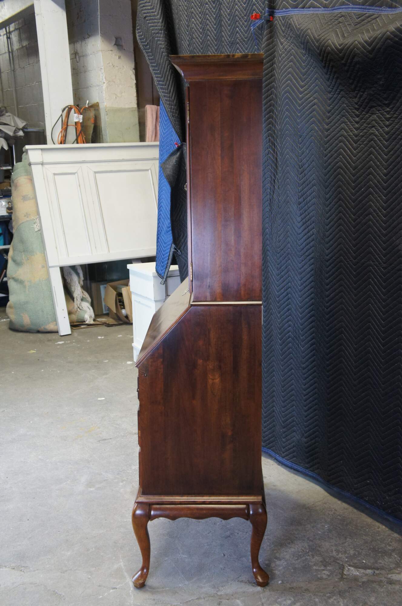 Beautiful Queen Anne style secretary desk and bookcase by Cresent Manufacturing Company, circa 1970s. Made from cherry with a natural distressed finish. Features an upper bookcase with two shelves and lattice covered glass doors with an arched arcade along the top. The drop front opens two one large drawer and pigeon holes. Base has three graduated dovetailed drawers. The cabinet is supported by cabriole legs. Colonial brass batwing hardware fiited to drawers and desk lid.