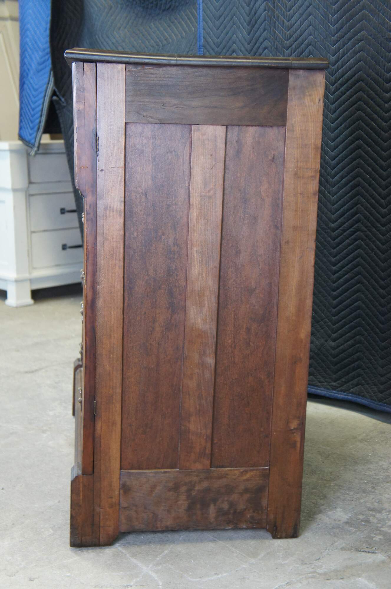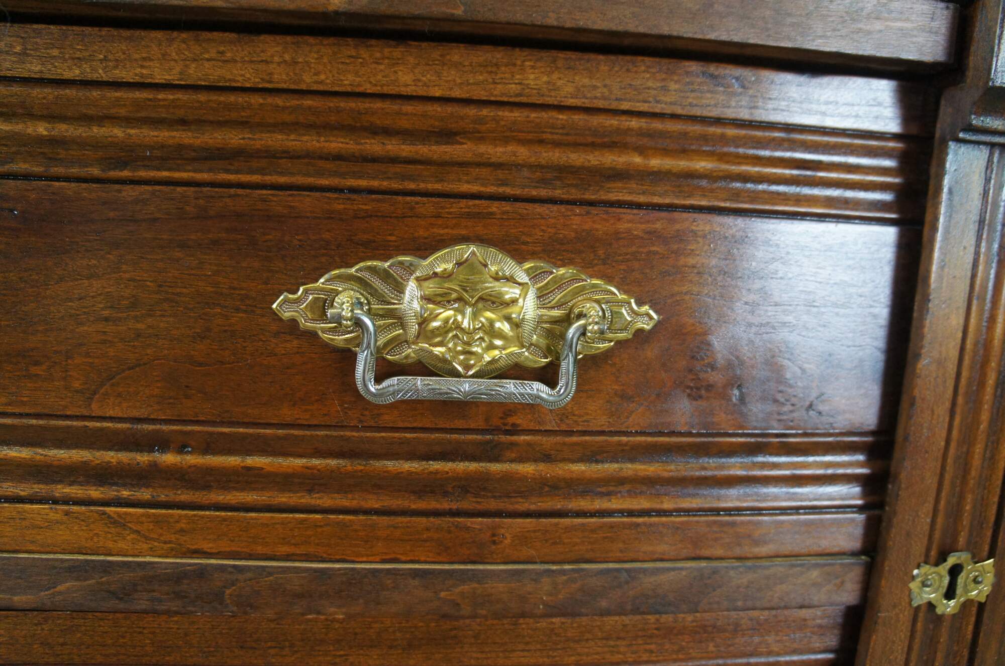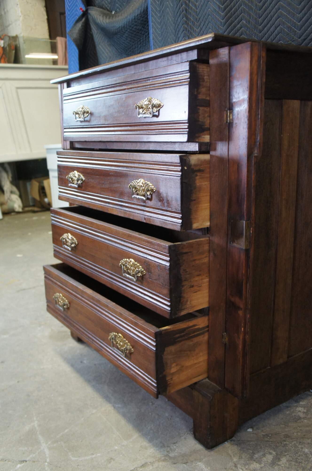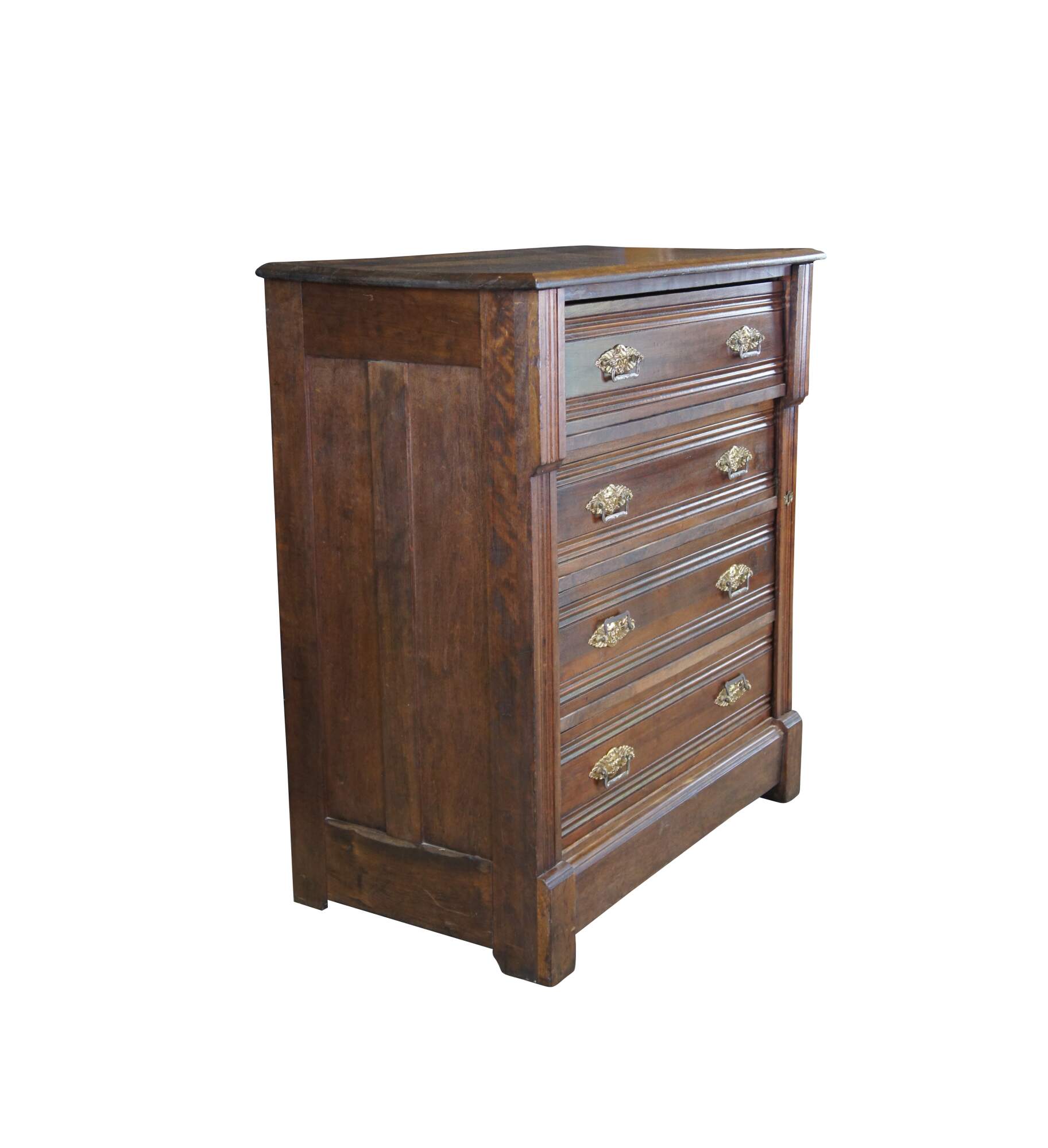 Antique Eastlake side lock chest of drawers, circa 1880s. Made of walnut featuring a side lock panel, four drawers and unique brass hardware with northwind face at the center.