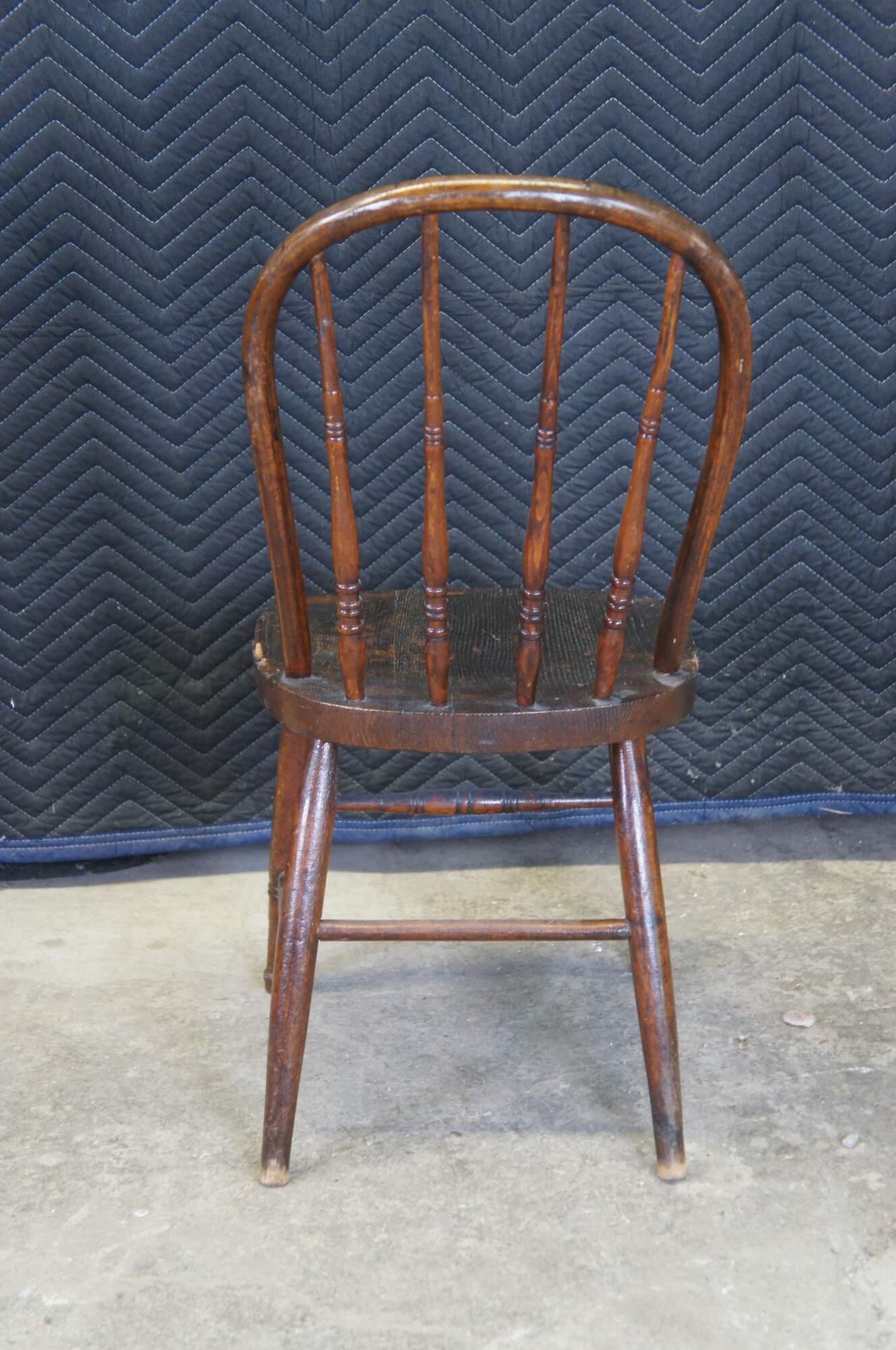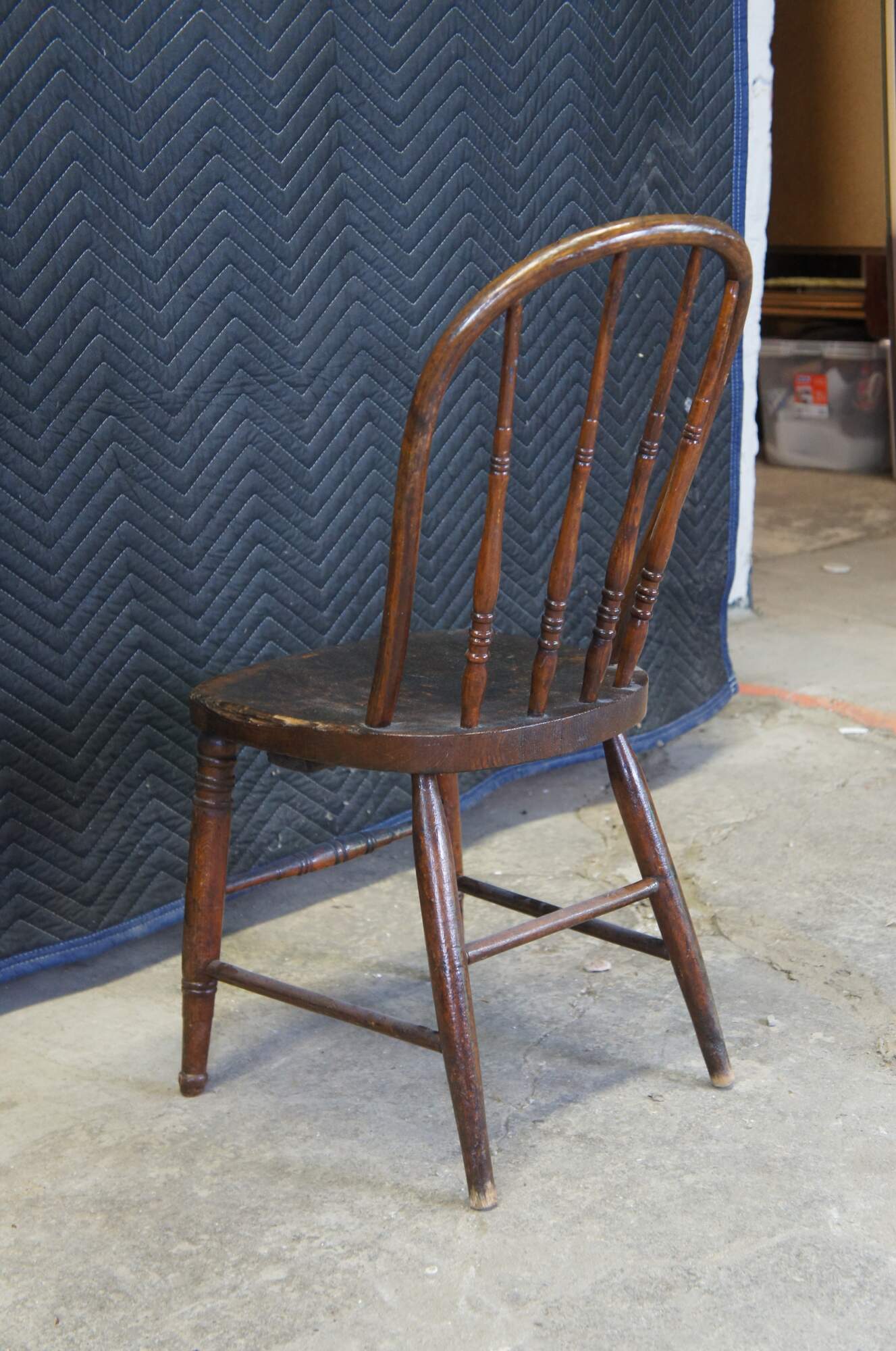 Quaint antique windsor bowback chair. Made from oak with a warm brown finish. Features a turned spindle back over plank seat and turned legs connected by stretchers.