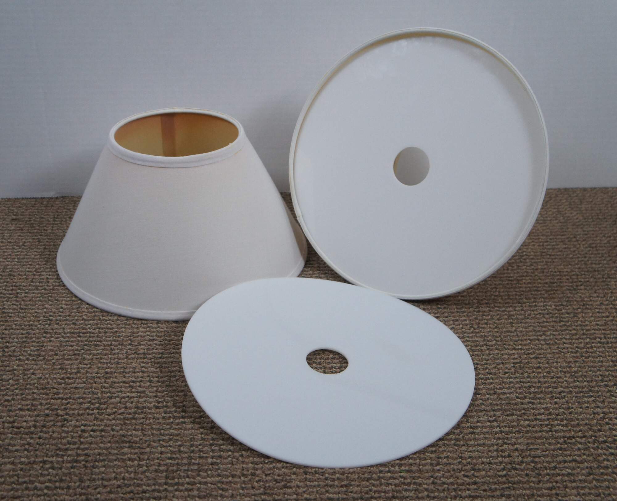 Good Overall - Some spots/smudges from use; one shade base slightly warped; possible unknown piece securing shades to fixtures missing