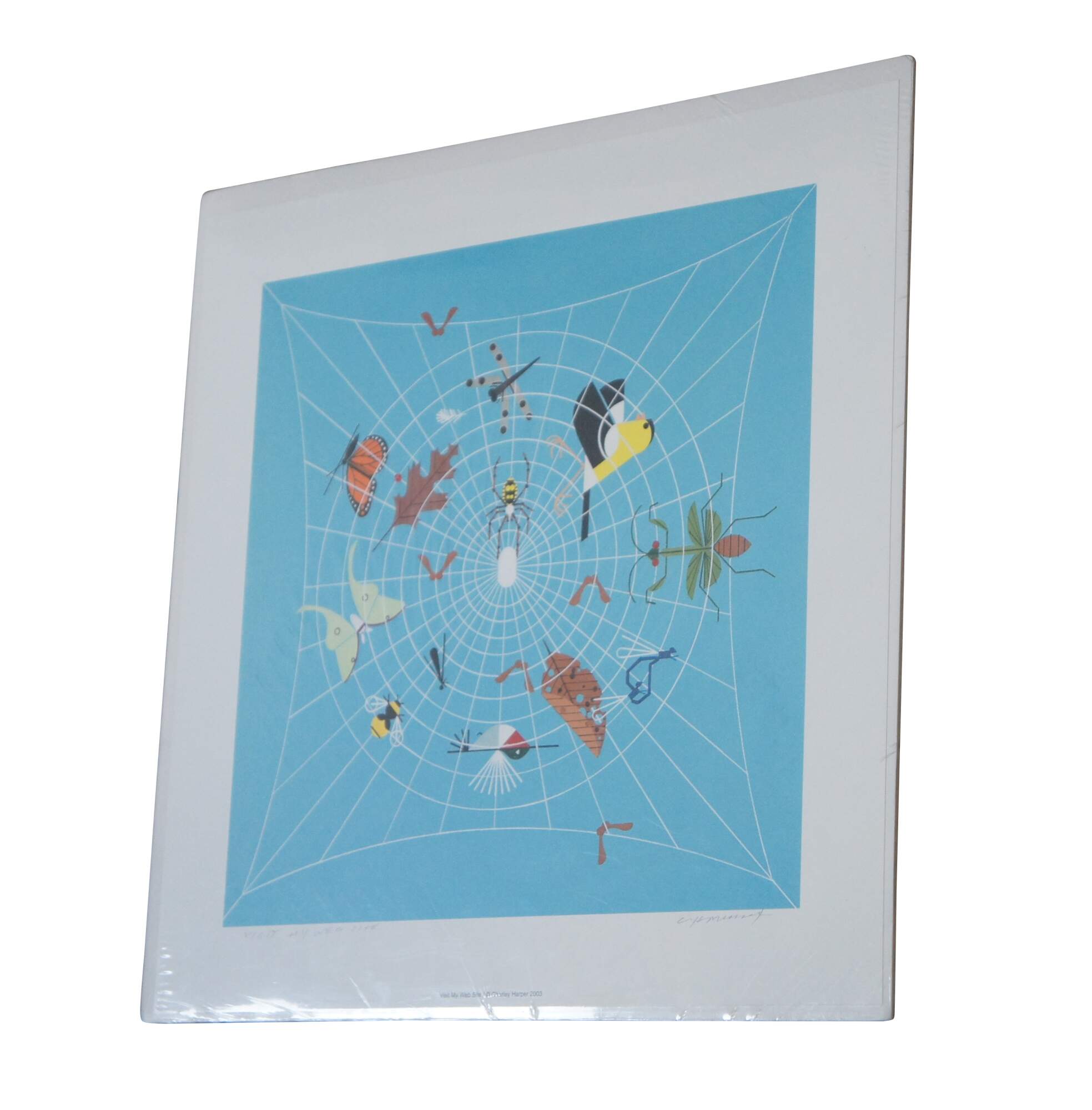 2003 print of Visit My Web Site (aka Visit My Website) by Charley Harper, showing a square spider’s web on a blue background in which is caught a variety of leaves, insects, and birds. Lithograph on paper. Pencil titled and signed. Still sealed in plastic.