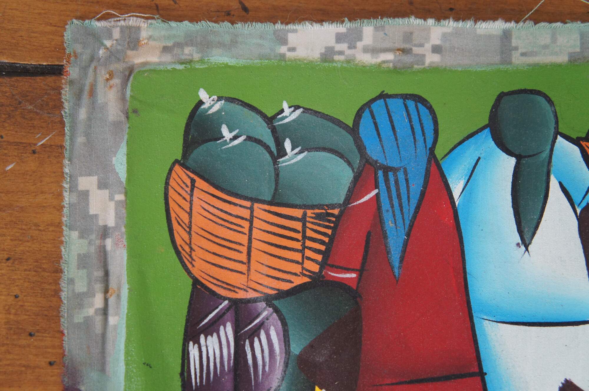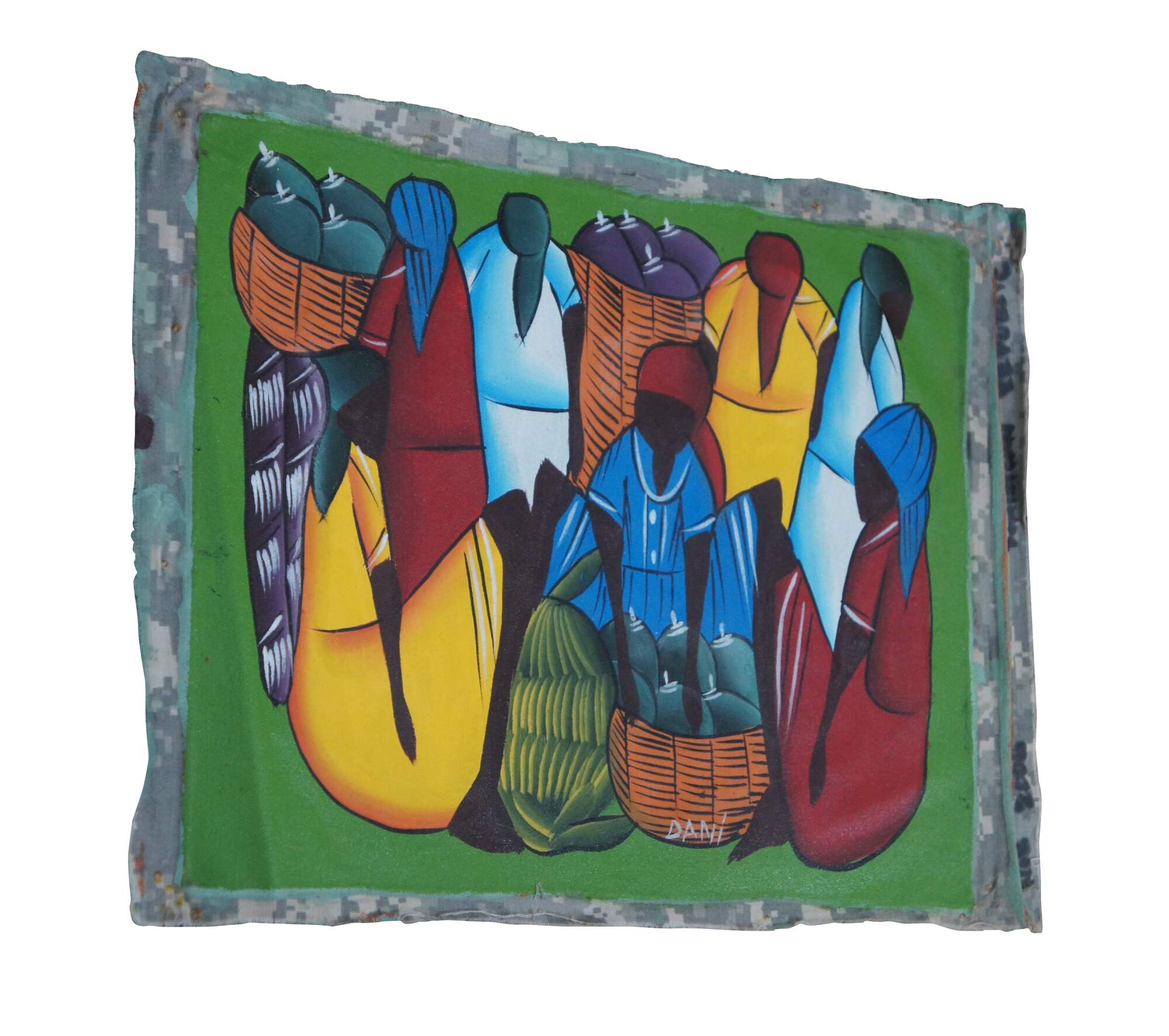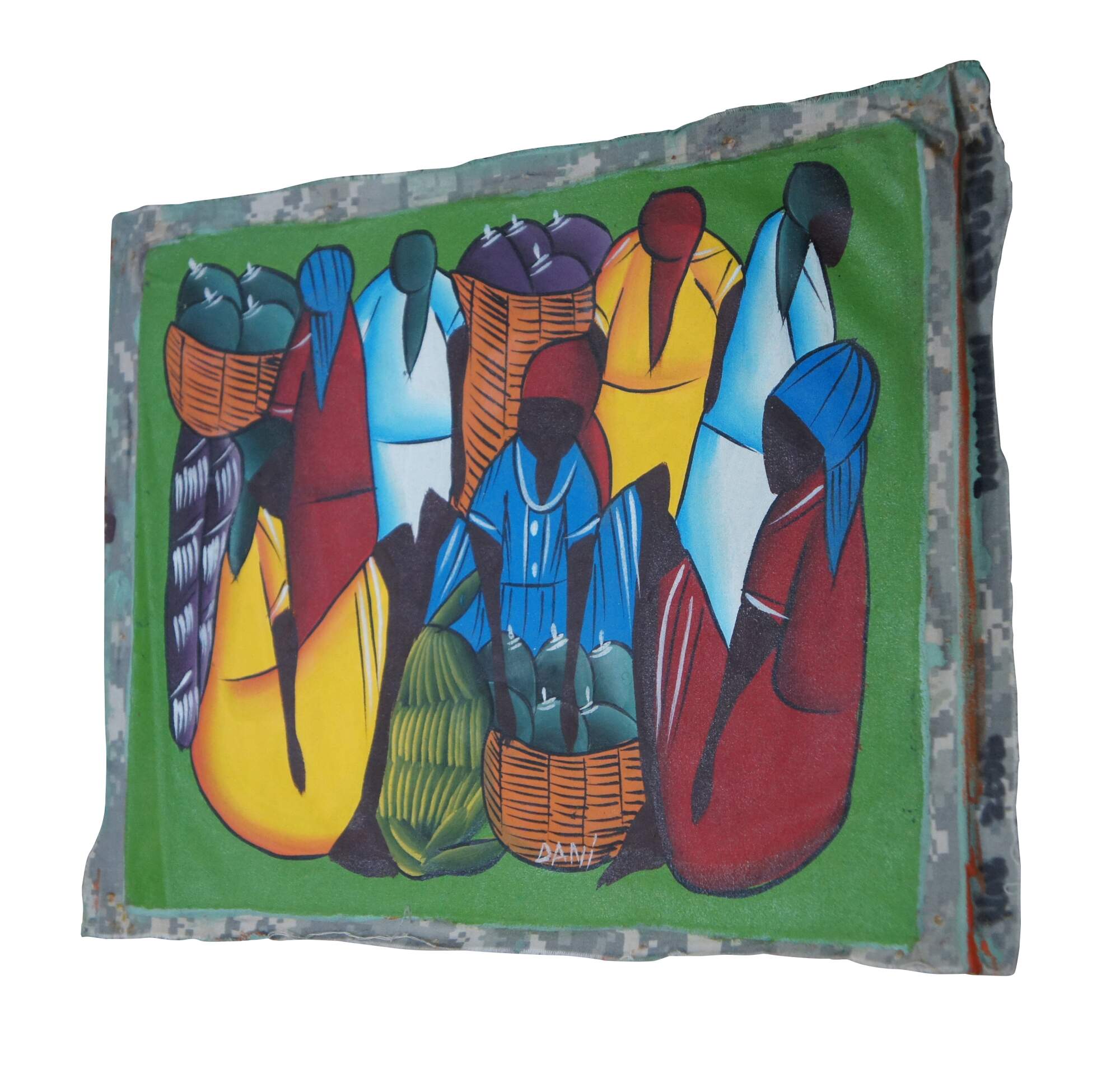 Original acrylic on cloth painting in the folk art style common to the Dominican Republic and Haiti, showing a group of female figures in dresses and kerchiefs with baskets full of fruit at the market. The fabric appears to be repurposed from a United States military uniform showing the digital Universal Camouflage Pattern of the era. Signed Dani at lower center-right. Annotated in marker along right edge “Nov 2006 Dominican Republic.”