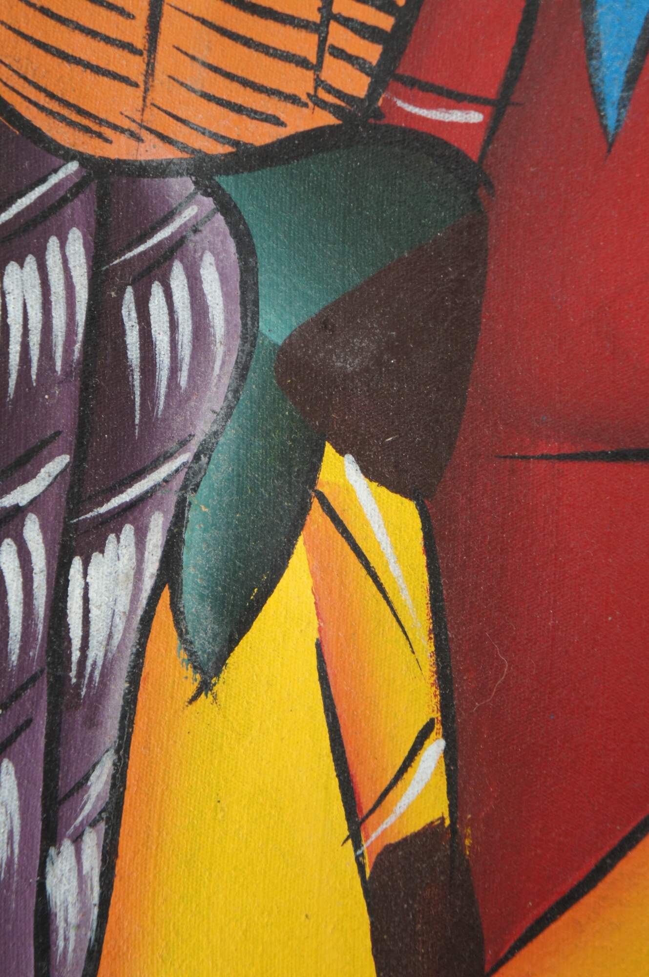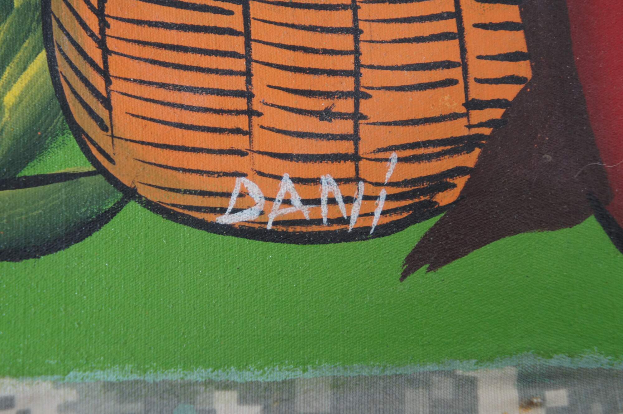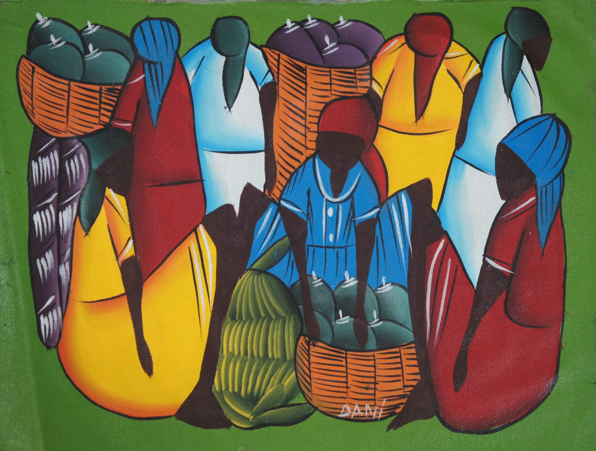 Original acrylic on cloth painting in the folk art style common to the Dominican Republic and Haiti, showing a group of female figures in dresses and kerchiefs with baskets full of fruit at the market. The fabric appears to be repurposed from a United States military uniform showing the digital Universal Camouflage Pattern of the era. Signed Dani at lower center-right. Annotated in marker along right edge “Nov 2006 Dominican Republic.”