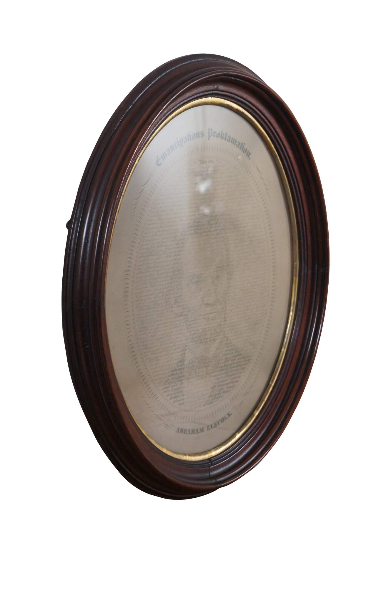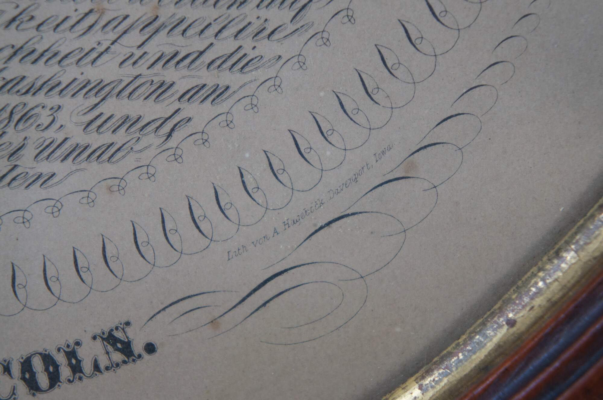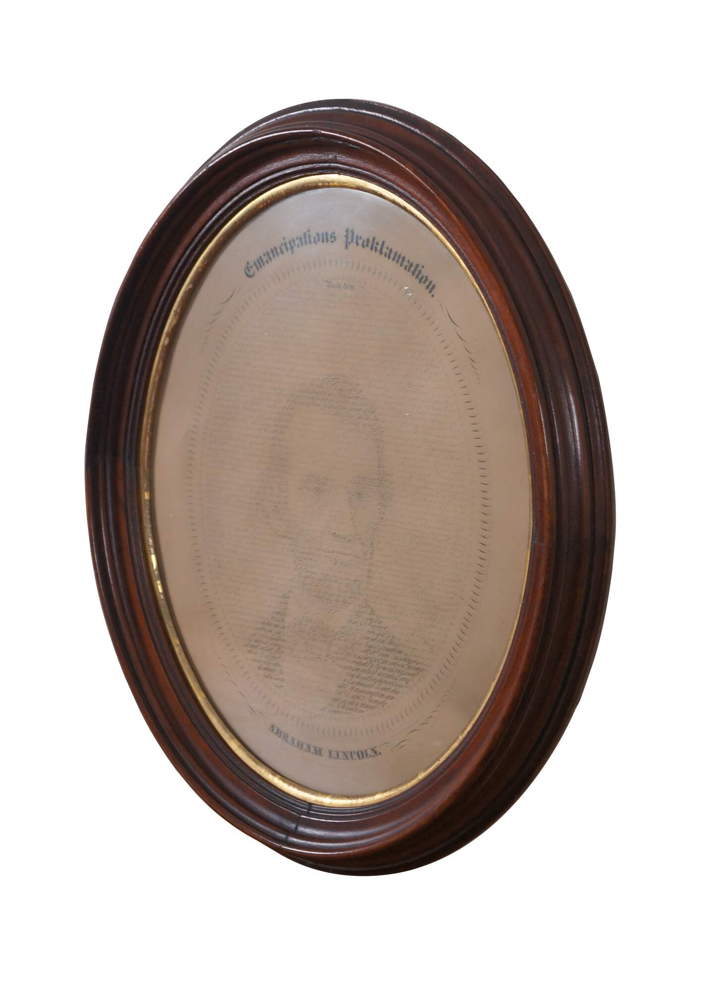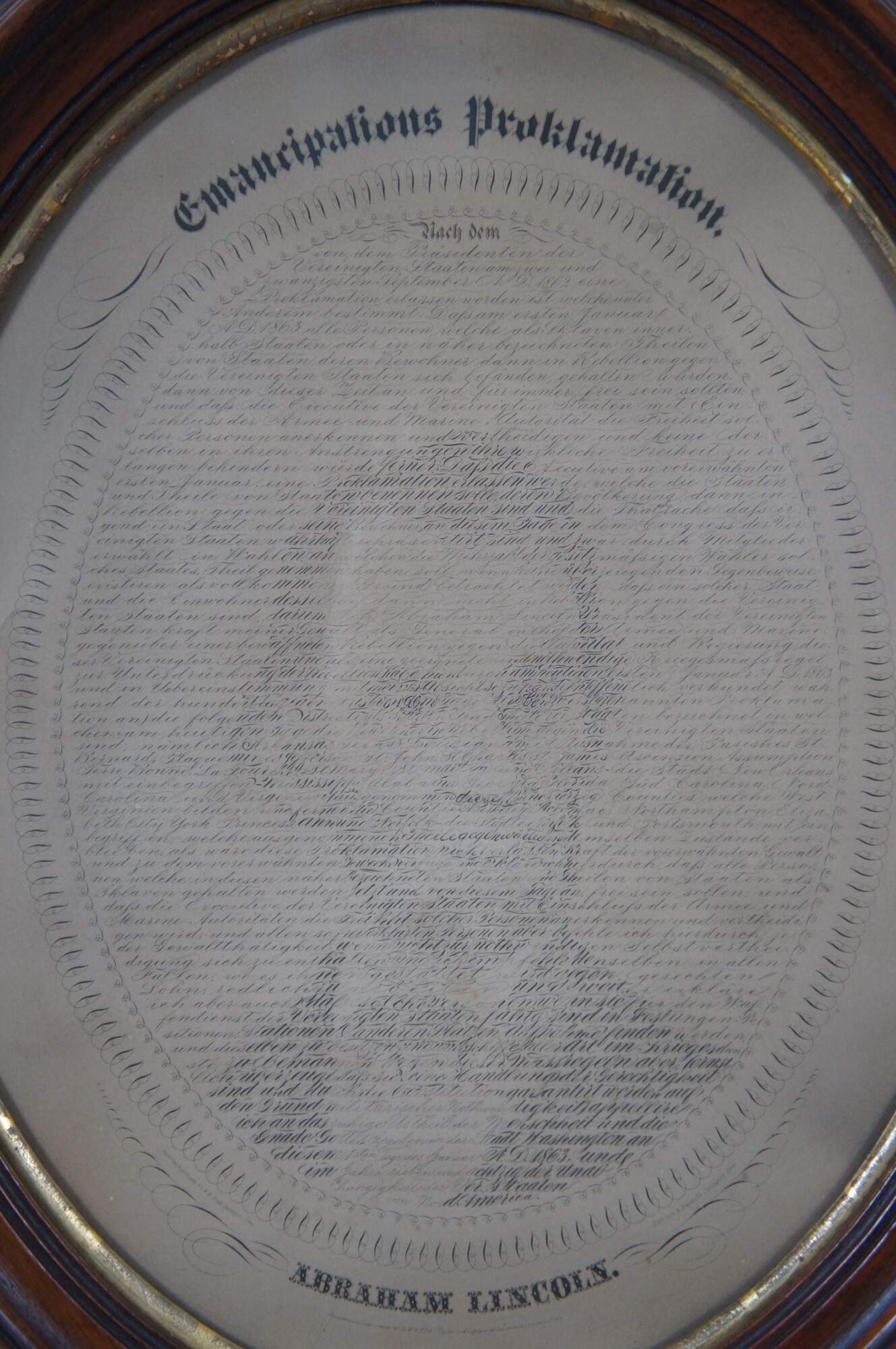 Antique 1865 German language version of W.H. Pratt’s calligraphic portrait of U.S. President Abraham Lincoln within the text of the 1863 Emancipation Proclamation. Drawn and Written by W.H. Pratt, Davenport, Iowa. Lithographed by A. Hugebock, Davenport, Iowa. Set in a deeply beveled oval, wood frame with gilded interior edge.