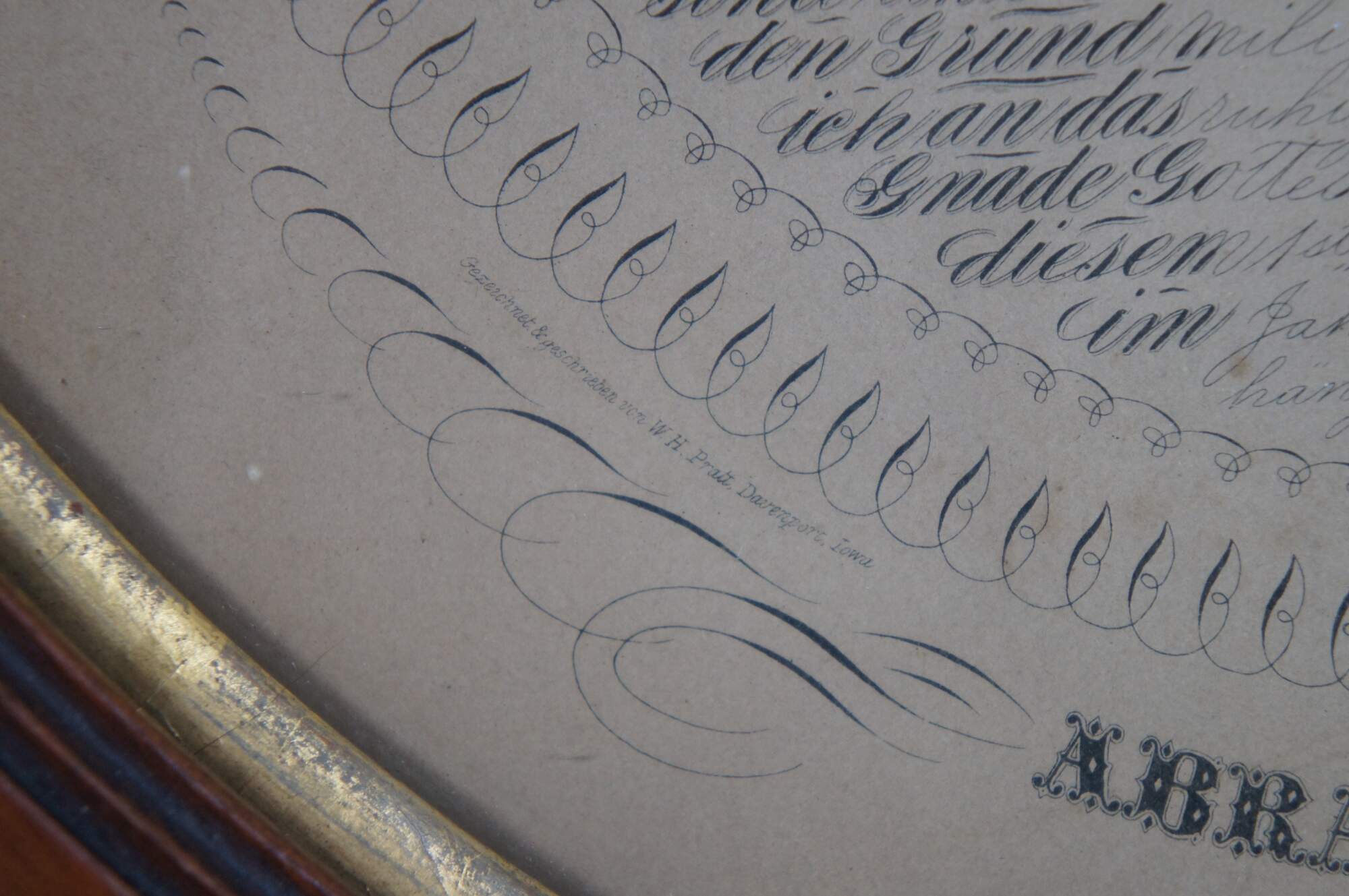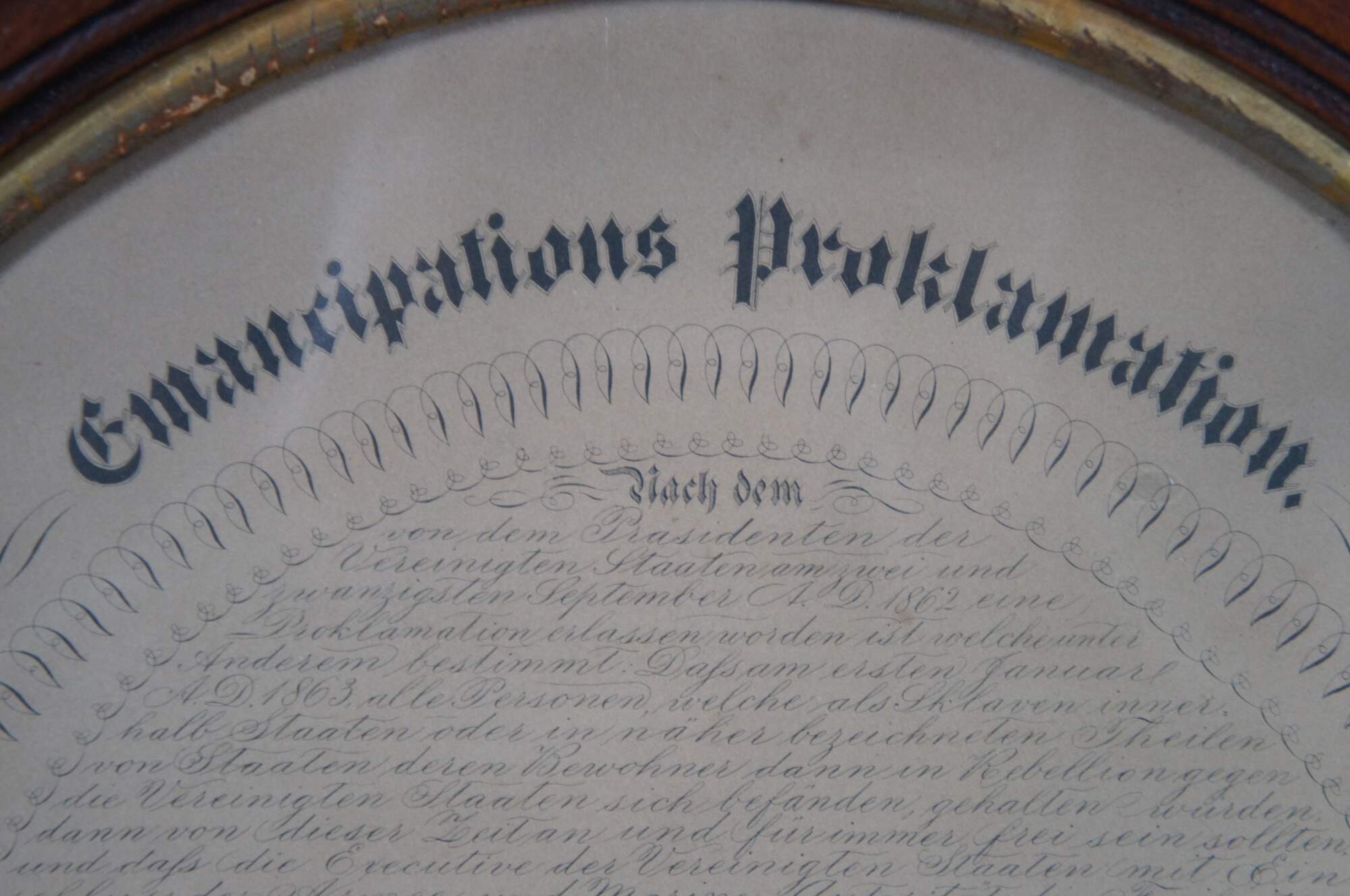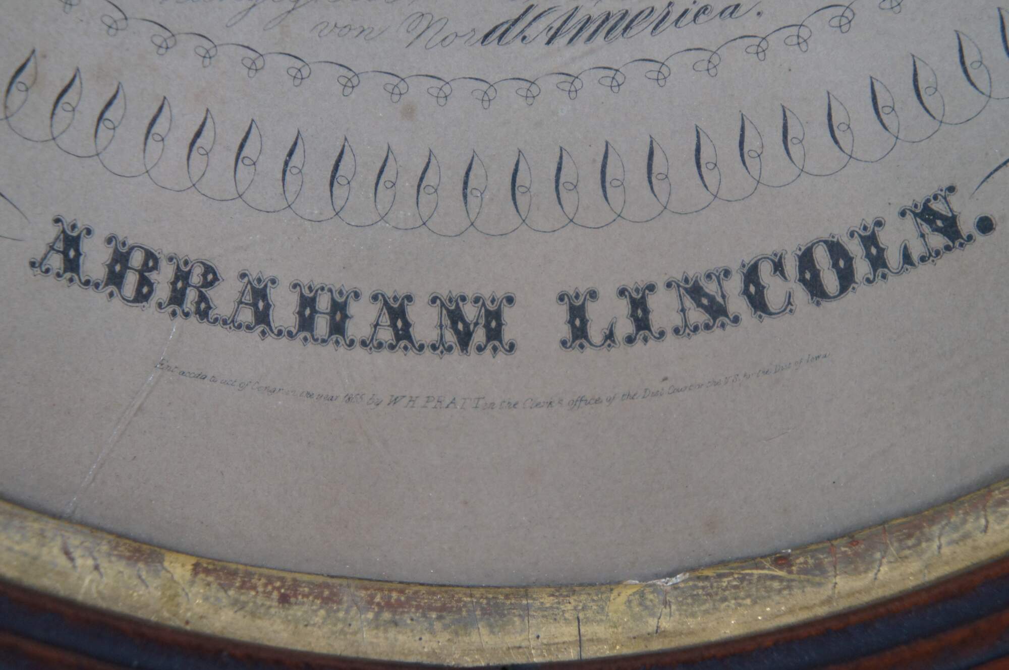 Antique 1865 German language version of W.H. Pratt’s calligraphic portrait of U.S. President Abraham Lincoln within the text of the 1863 Emancipation Proclamation. Drawn and Written by W.H. Pratt, Davenport, Iowa. Lithographed by A. Hugebock, Davenport, Iowa. Set in a deeply beveled oval, wood frame with gilded interior edge.