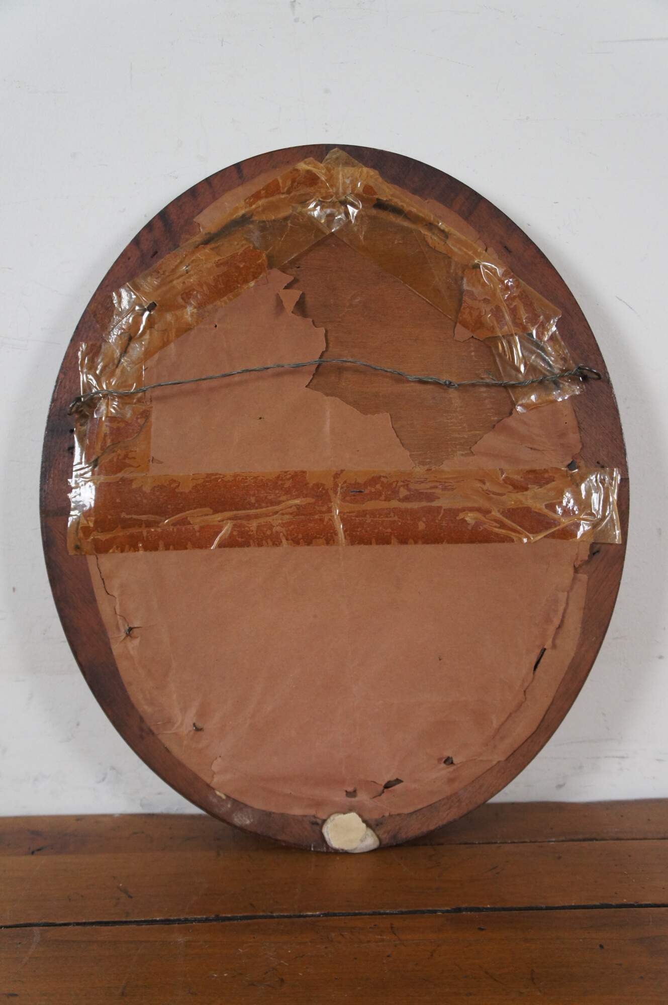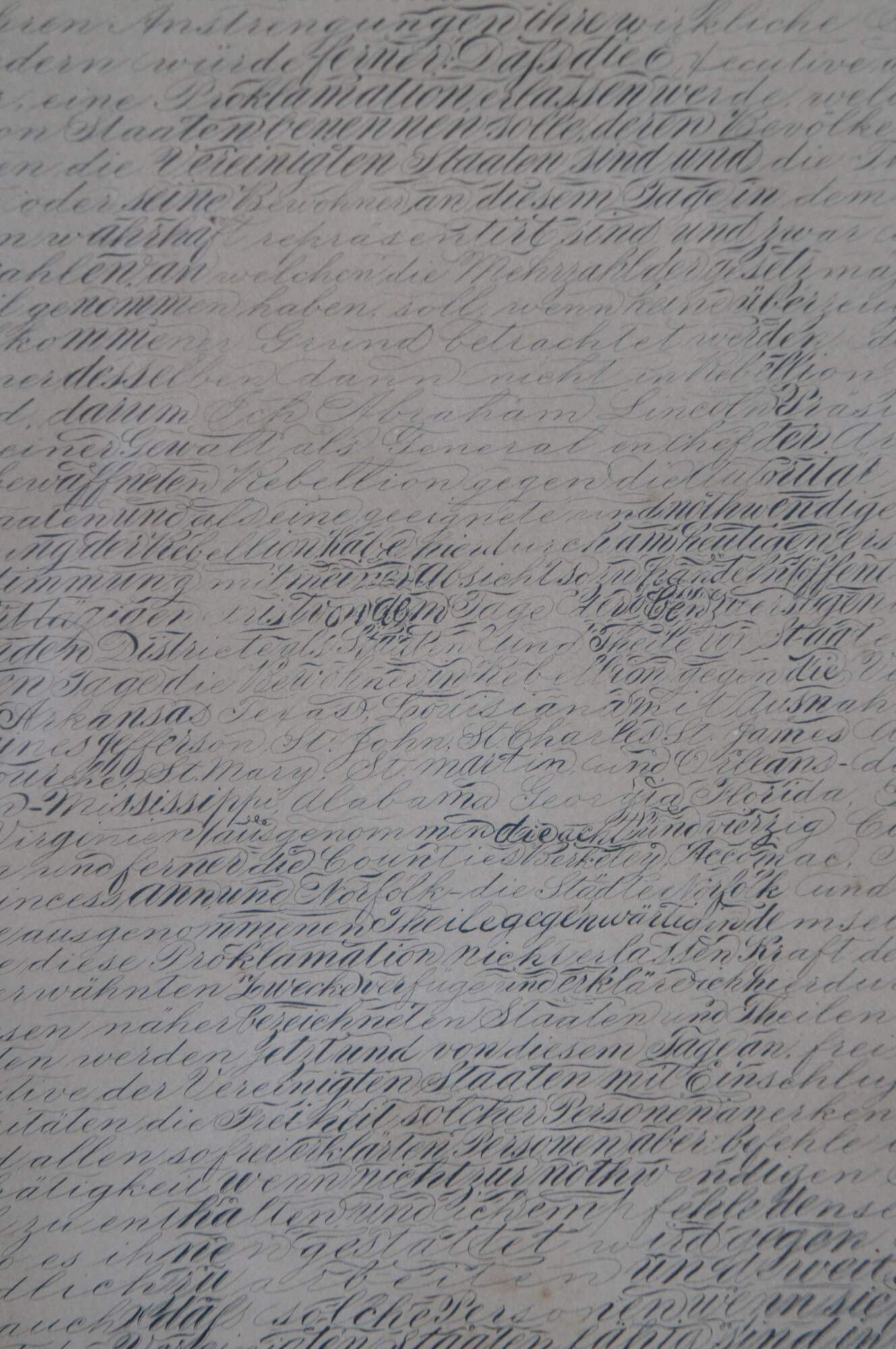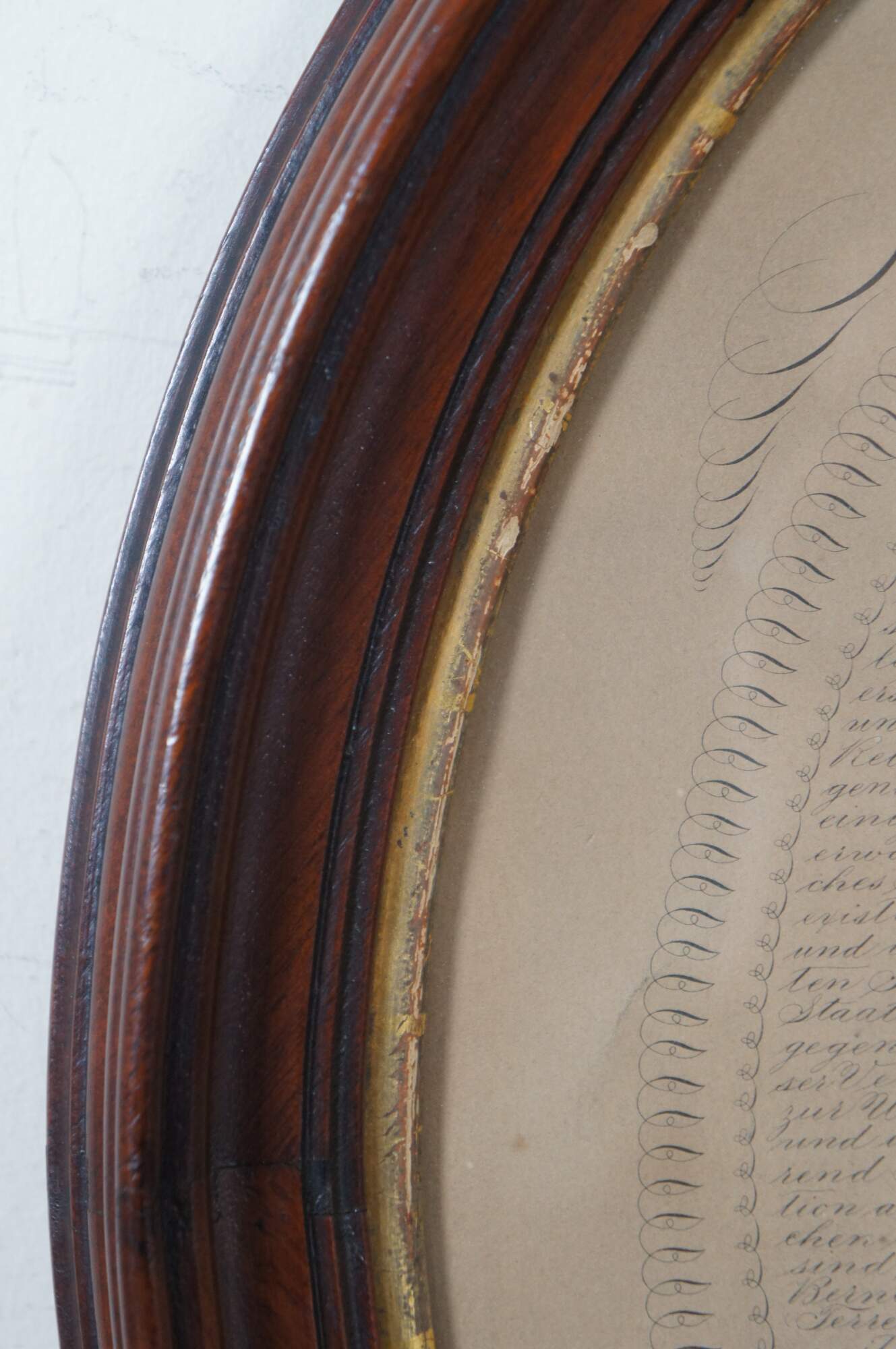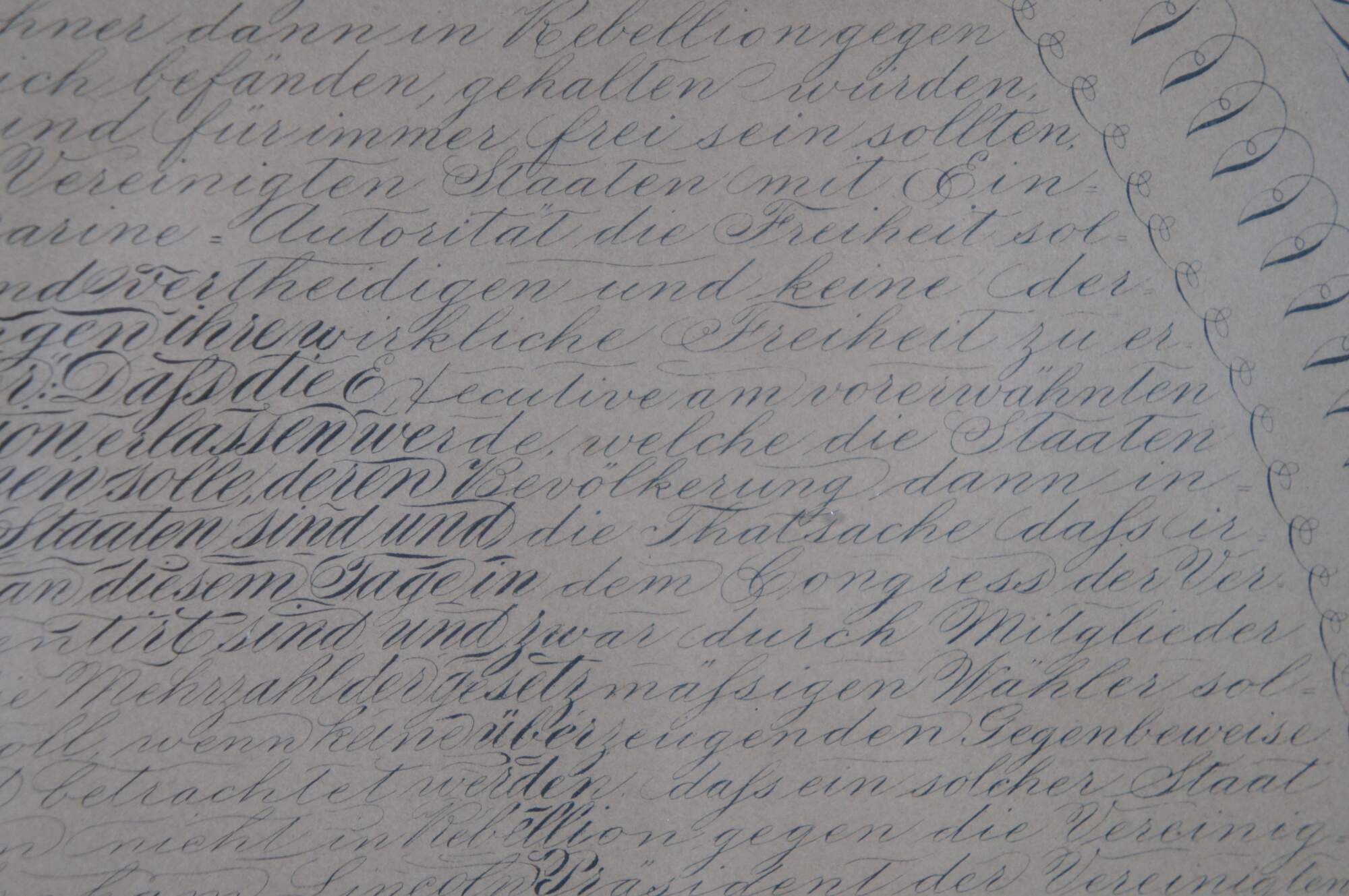 Antique 1865 German language version of W.H. Pratt’s calligraphic portrait of U.S. President Abraham Lincoln within the text of the 1863 Emancipation Proclamation. Drawn and Written by W.H. Pratt, Davenport, Iowa. Lithographed by A. Hugebock, Davenport, Iowa. Set in a deeply beveled oval, wood frame with gilded interior edge.