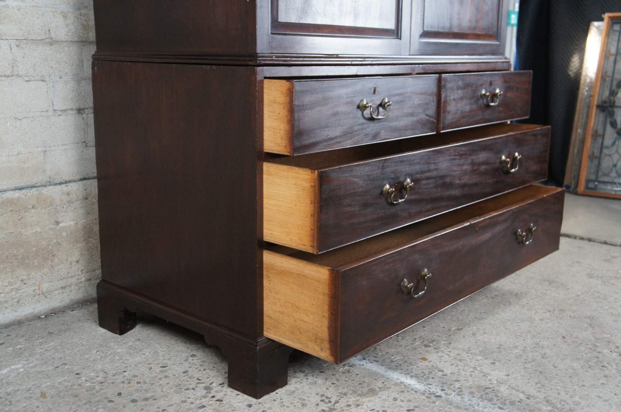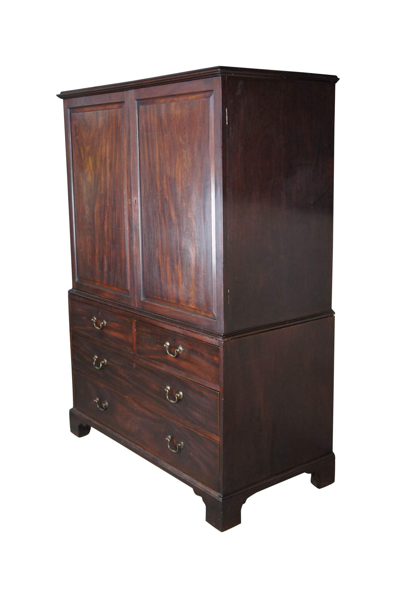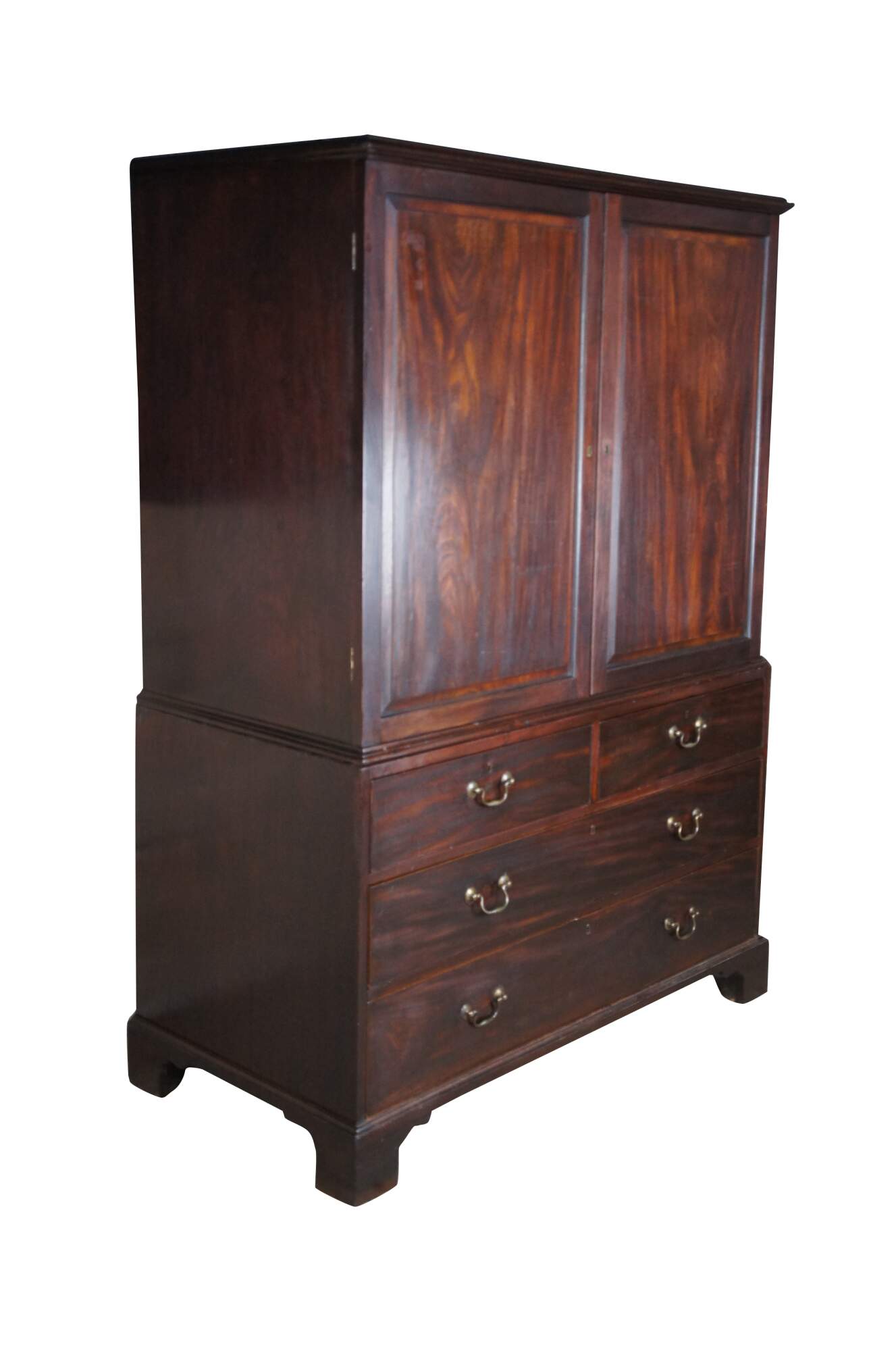 18th Century George III Period Mahogany Linen Press. A rectangular form with two over three hand dovetailed drawers and an upper closet / wardrobe with one large drawer and two pullouts for hangers. The cabinet is accented by brass bale hardware and supported by ogee bracket feet.