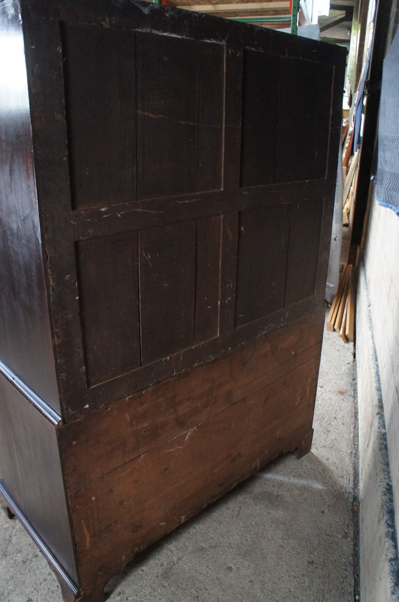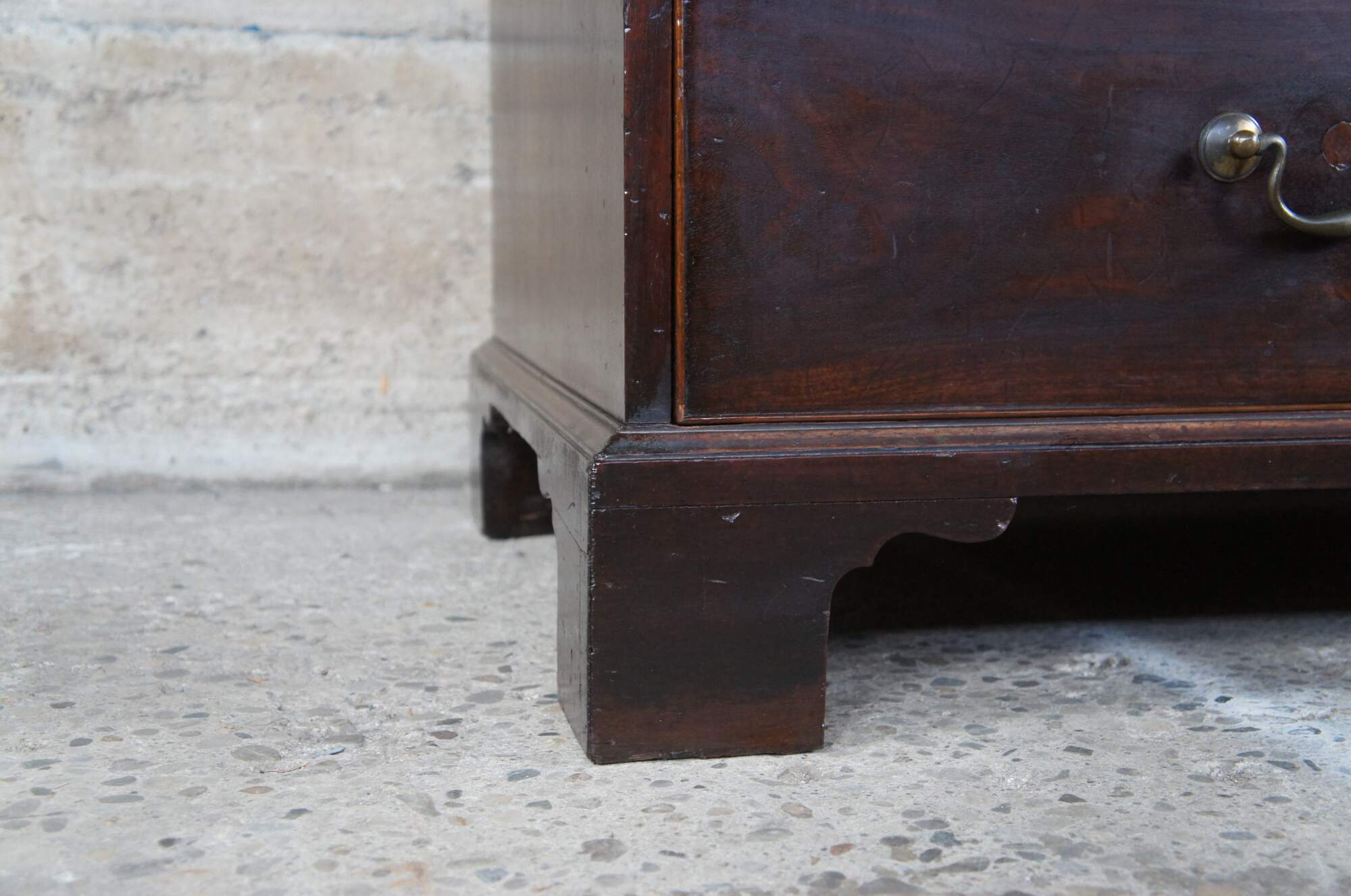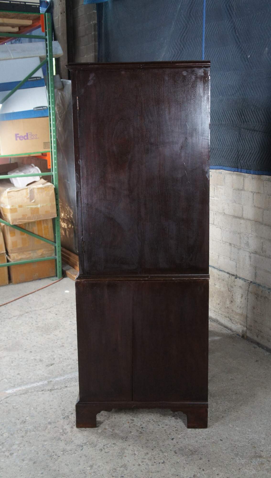 18th Century George III Period Mahogany Linen Press. A rectangular form with two over three hand dovetailed drawers and an upper closet / wardrobe with one large drawer and two pullouts for hangers. The cabinet is accented by brass bale hardware and supported by ogee bracket feet.