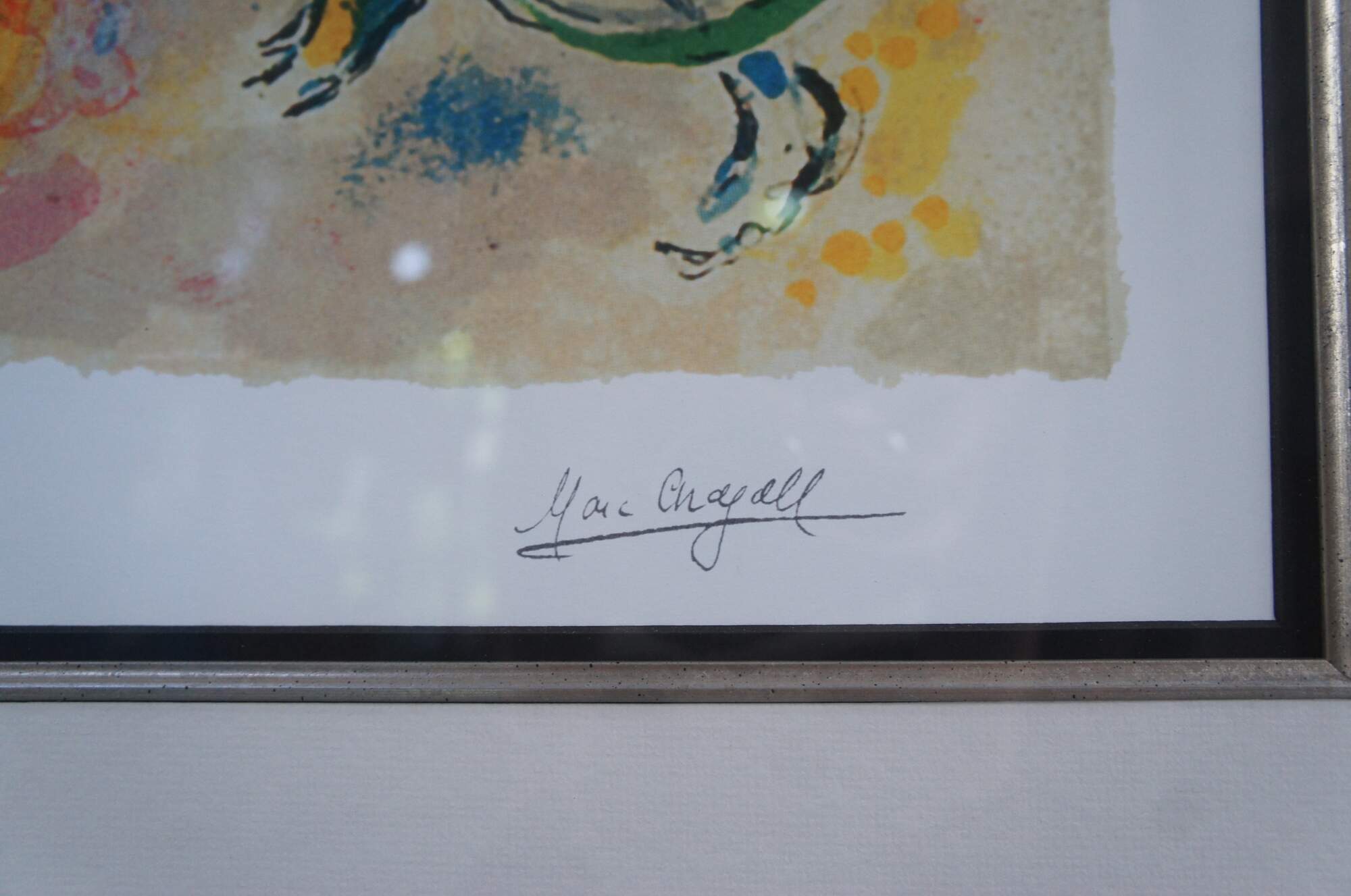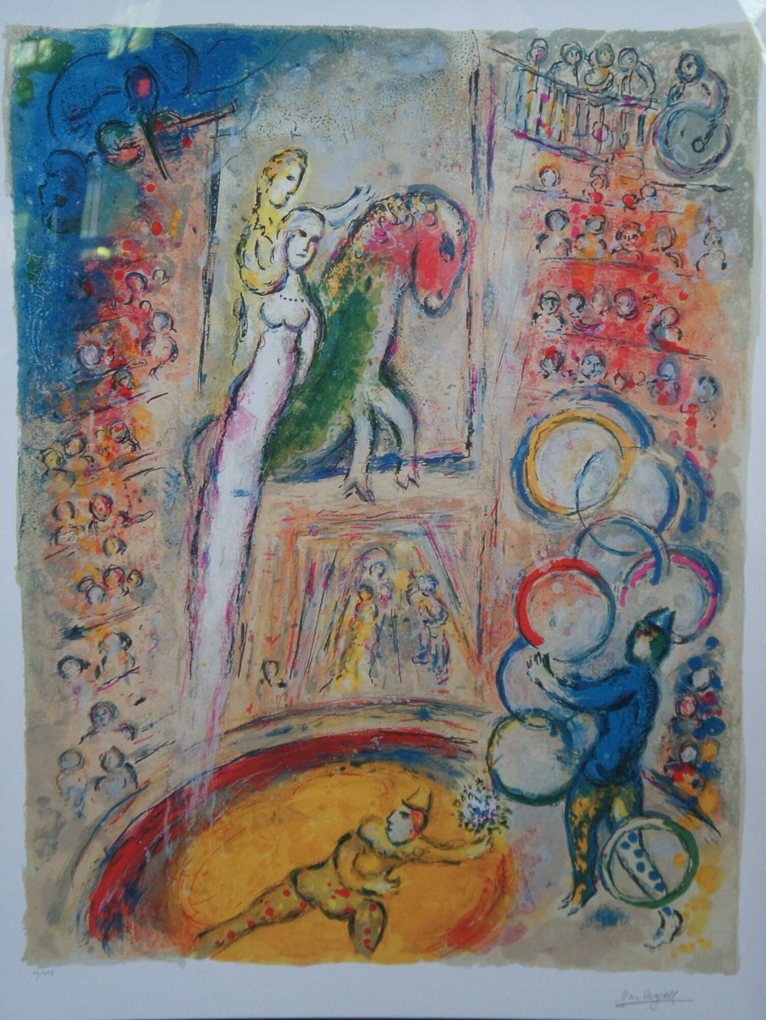 Vintage large and impressive Marc Chagall impressionist/expressionist lithogaph on paper featuring a circus scene with a man, woman / angel and horse levitating above the crowd with a pair of juggling clowns. Beautifully framed in a coin dot / graduated silver bead. Edition 50 of 375.