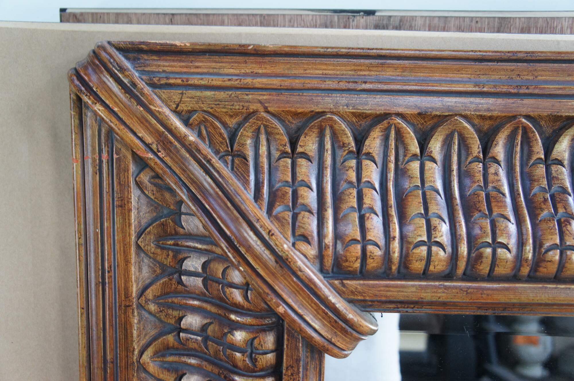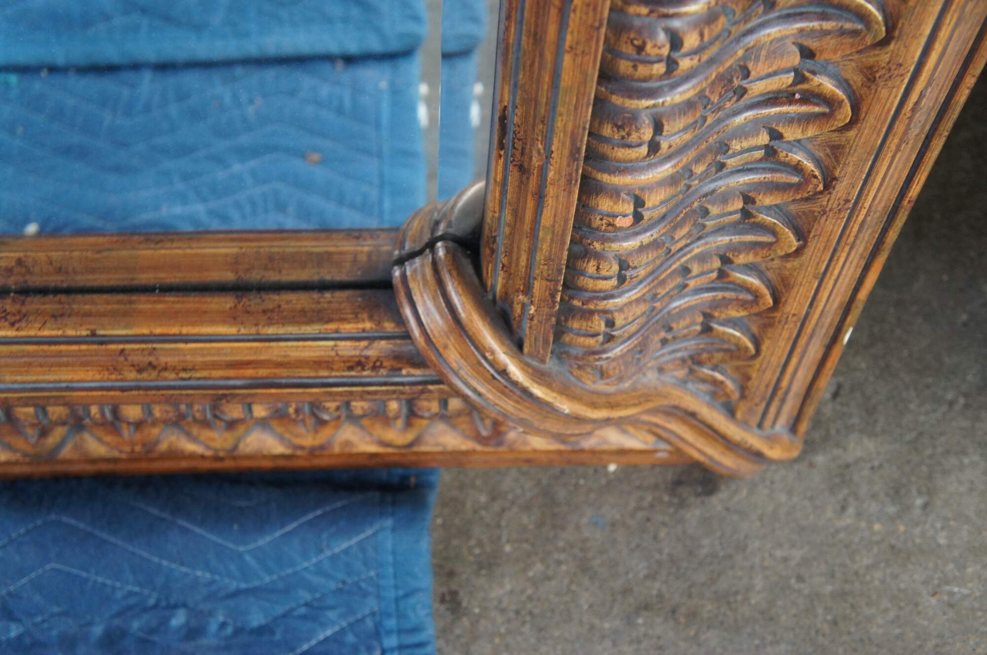 Vintage Raschella Collection beveled vanity or mantel mirror featuring an ornate pecan wood frame. Set up for vertical or horizontal hanging.